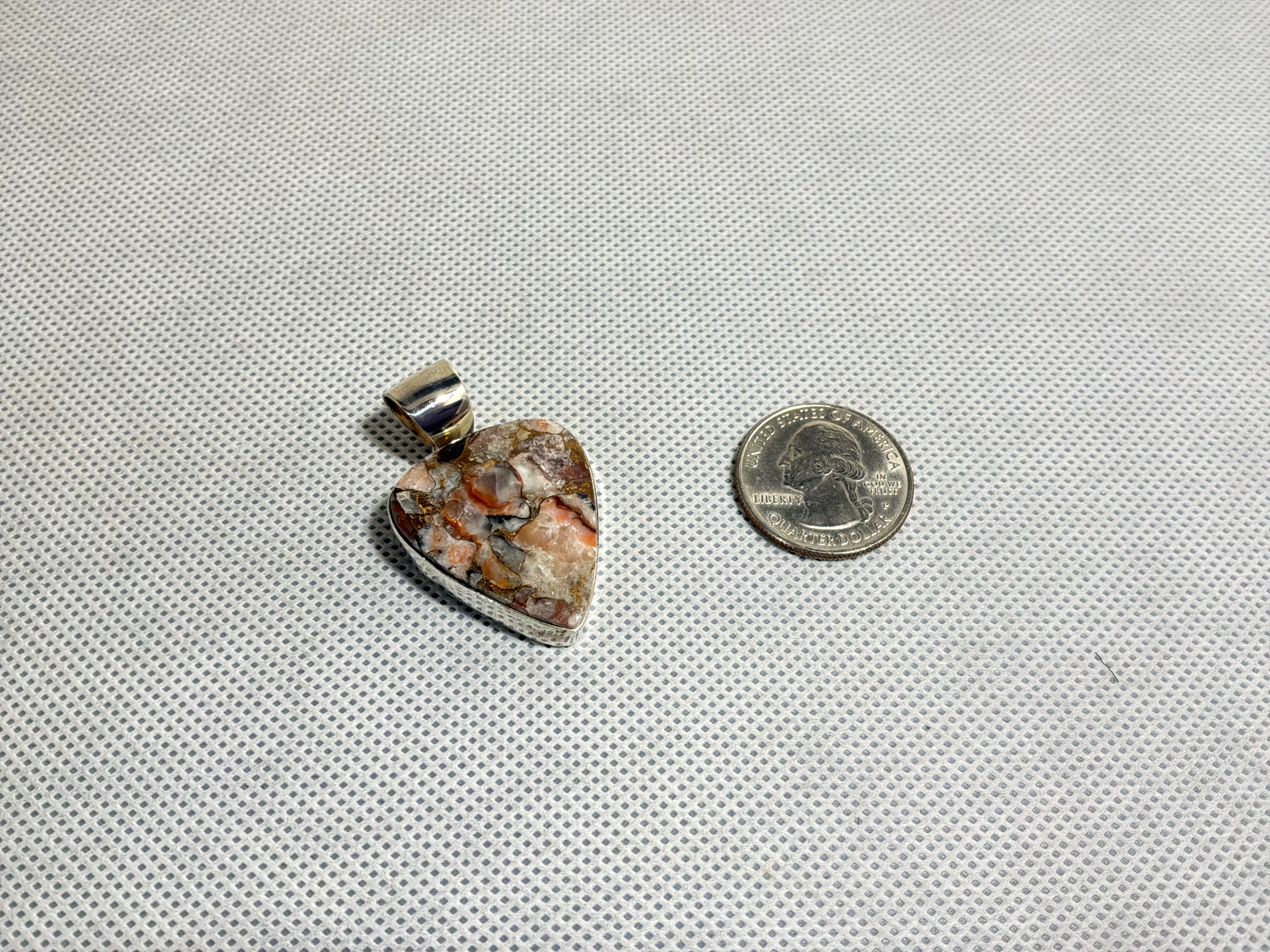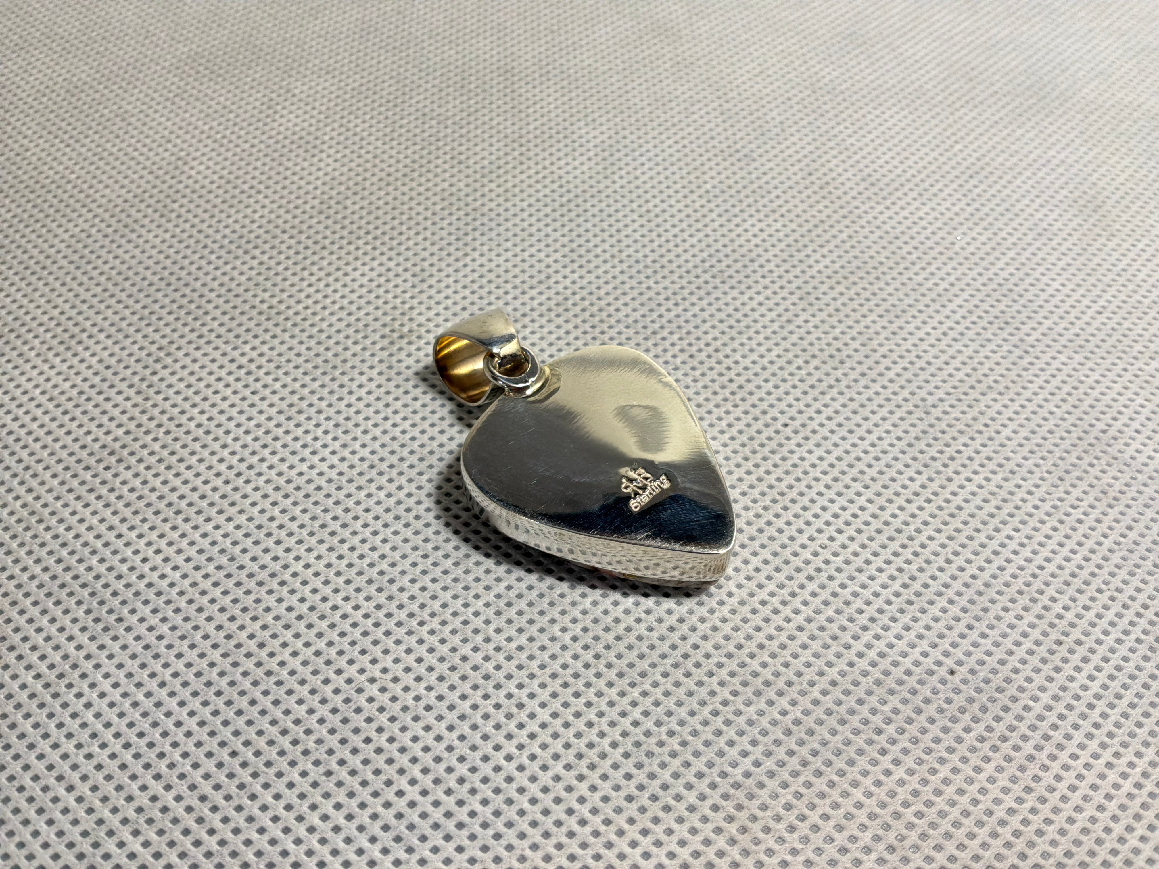 Pendant measures 1 3/4" from top of bail to bottom of pendant, and one inch across at the widest. Bail opening is 5/16". Artist insignia and sterling stamped on back.