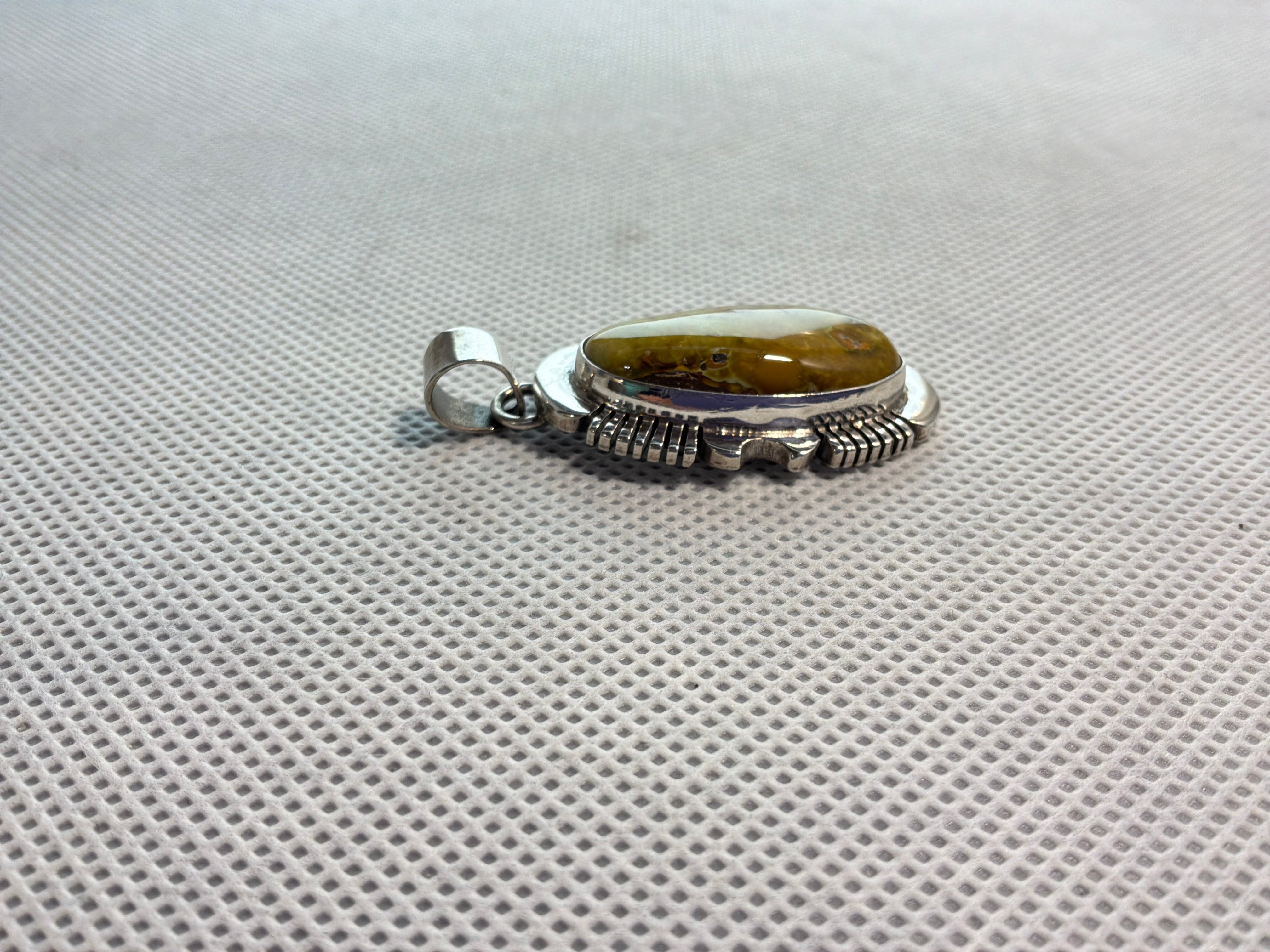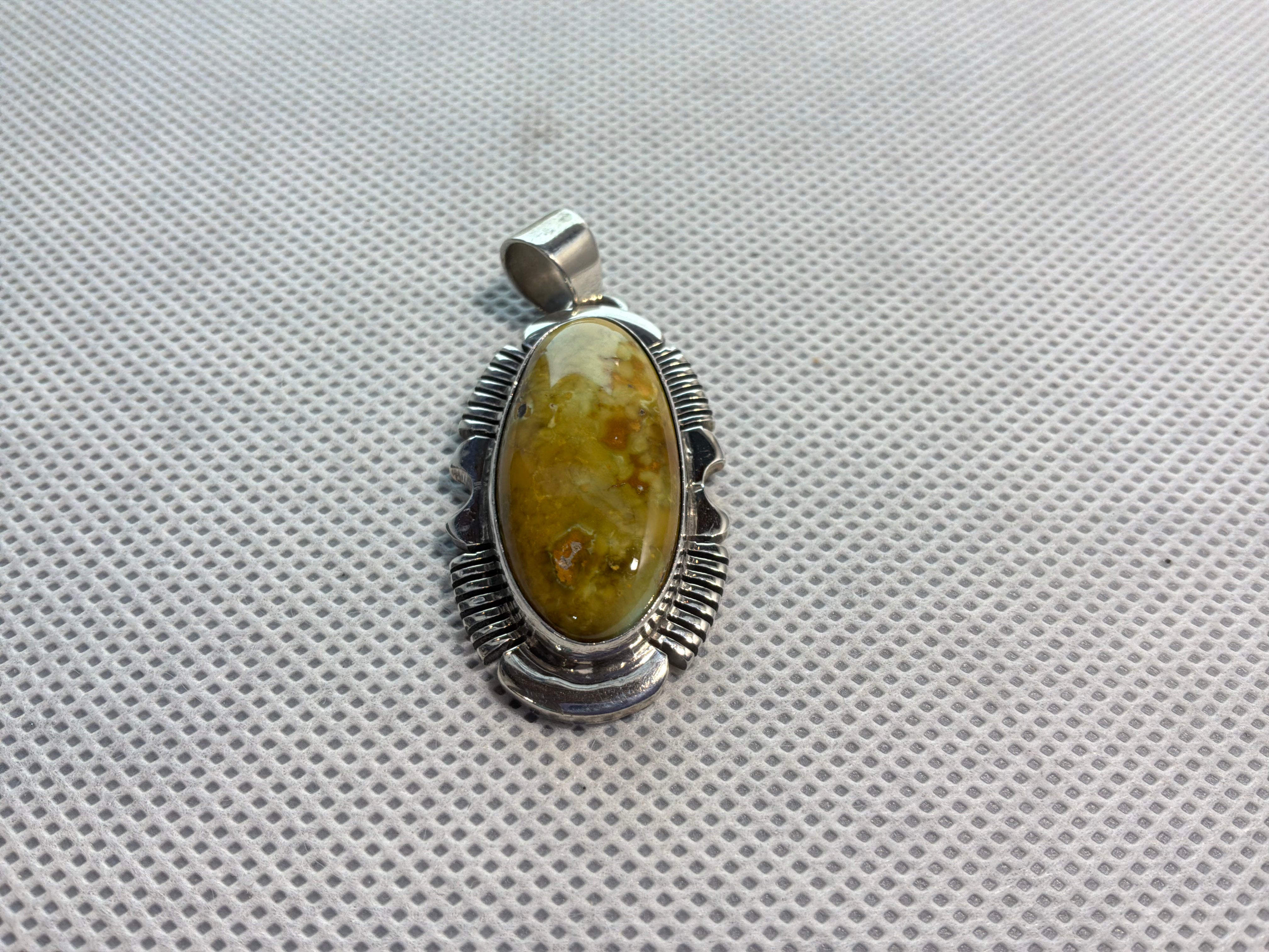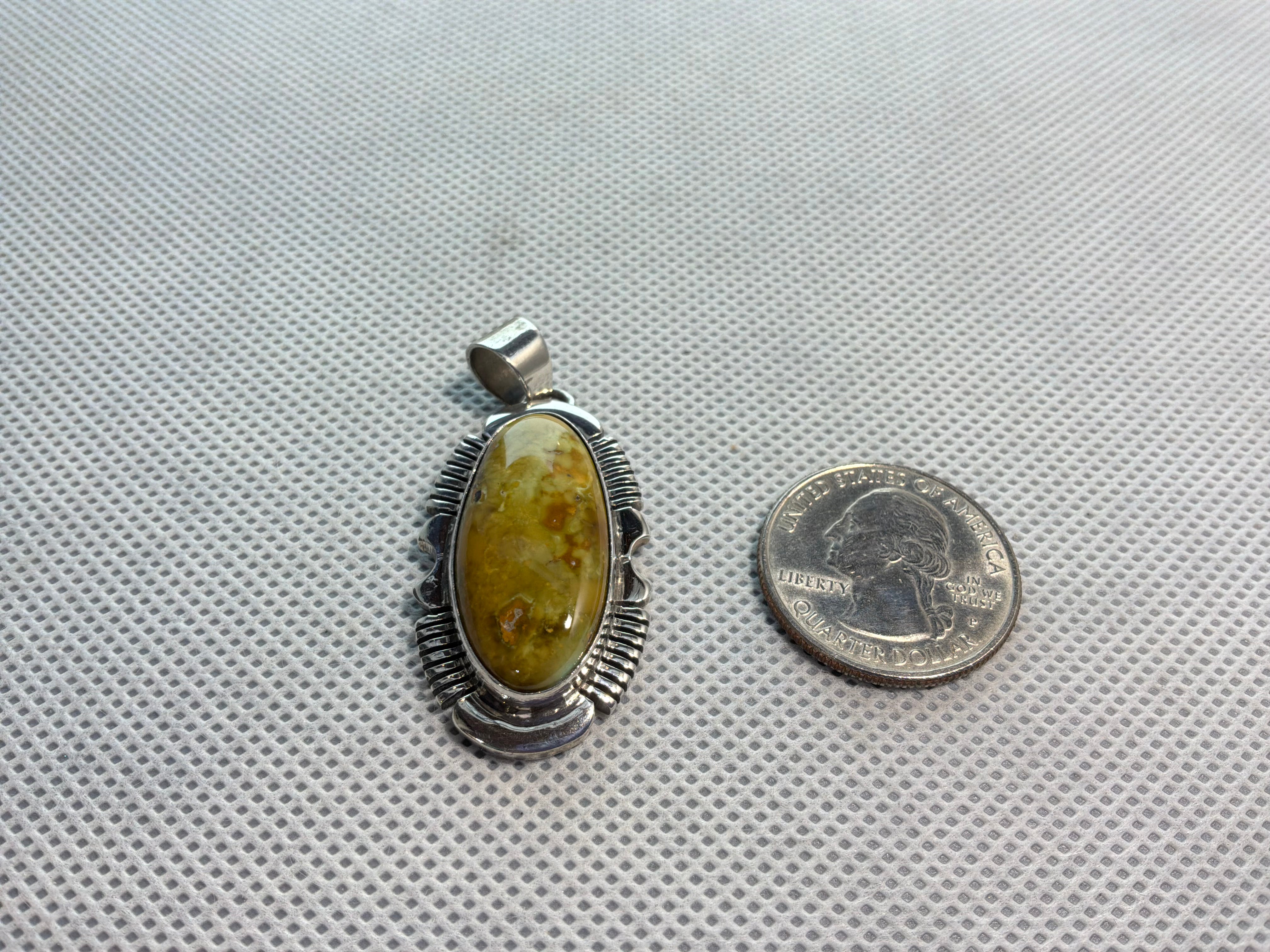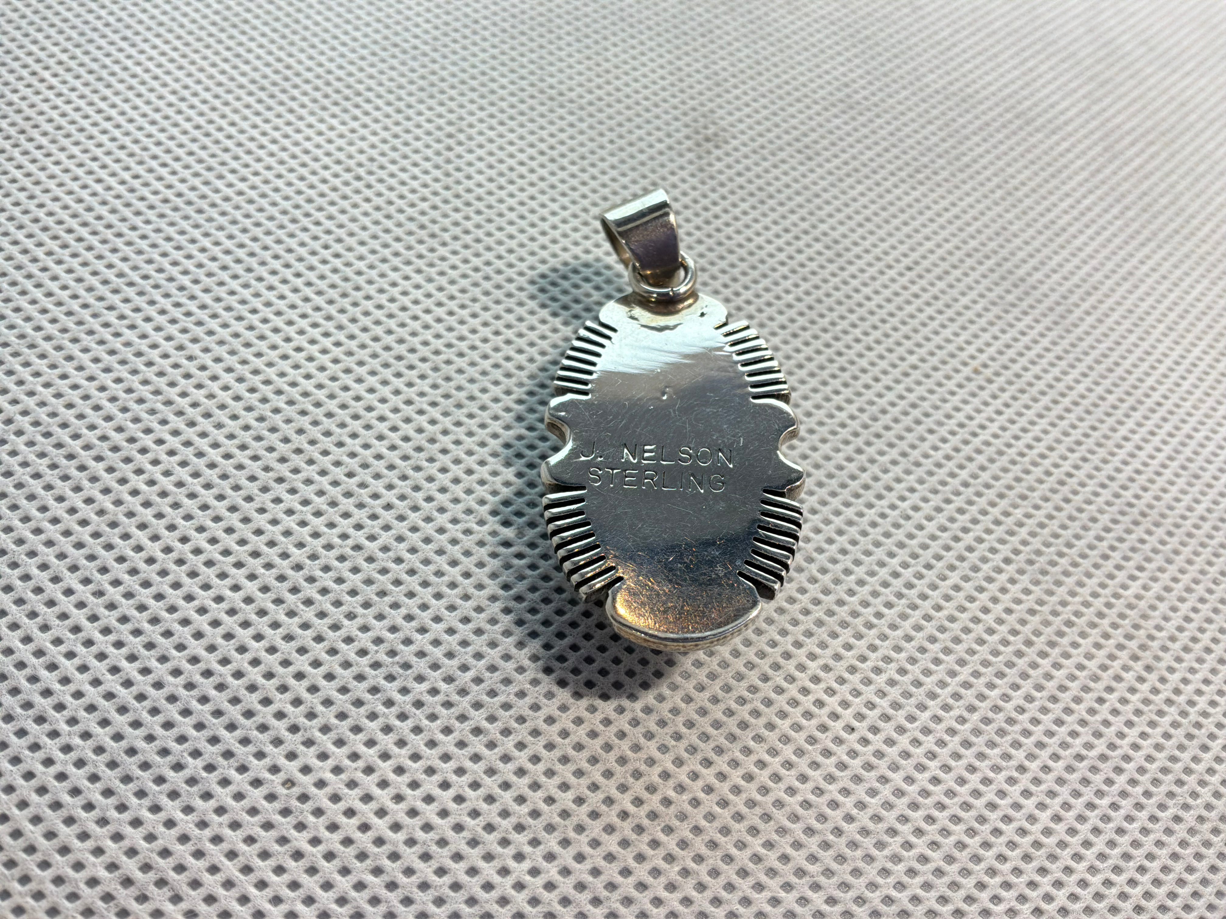 Sterling silver green turquoise pendant. Measurements are 2 inches from top of bail to bottom of pendant, almost one inch across and bail opening is 1/4 inch. Artist name J Nelson and sterling stamped on back.