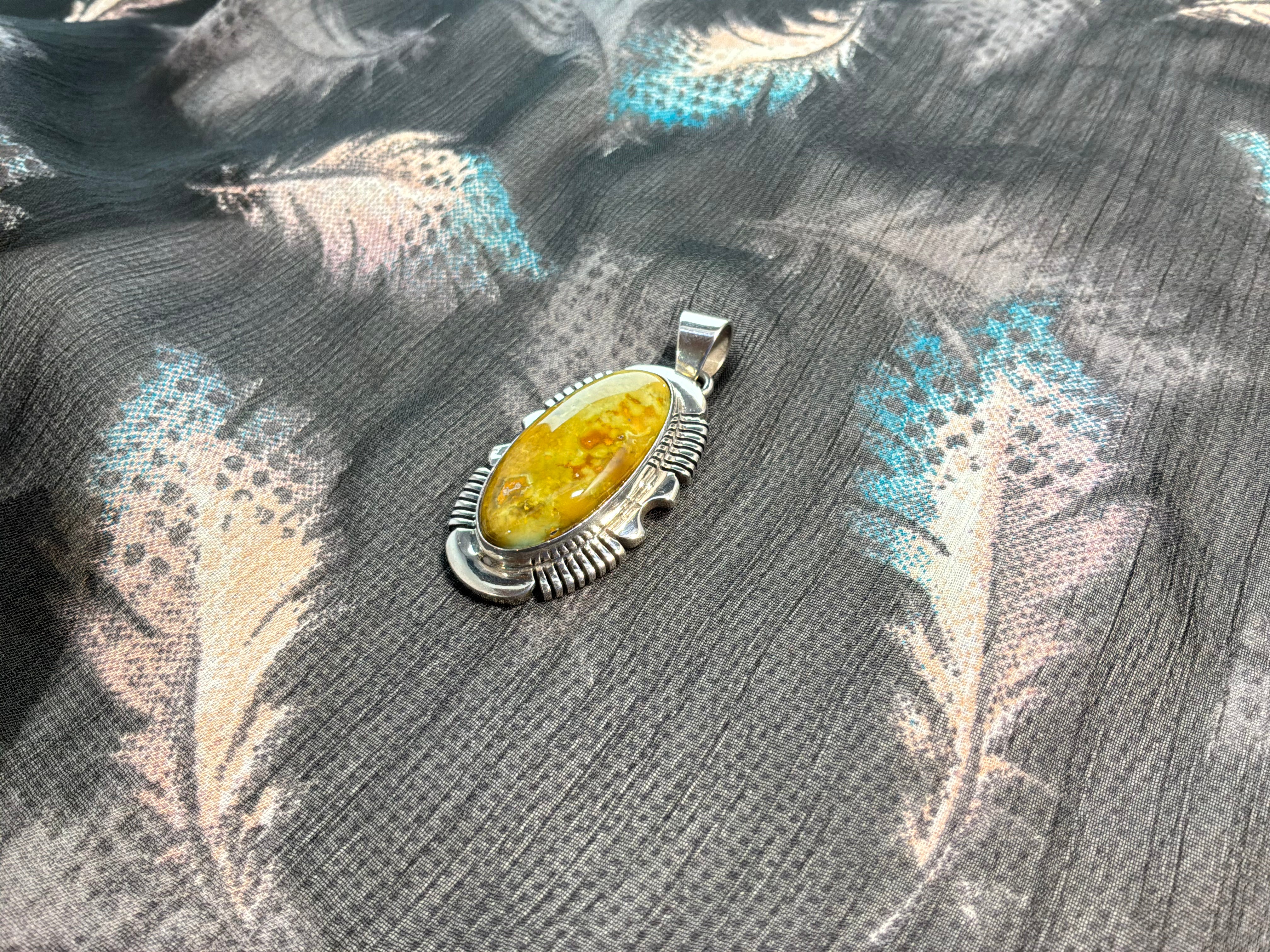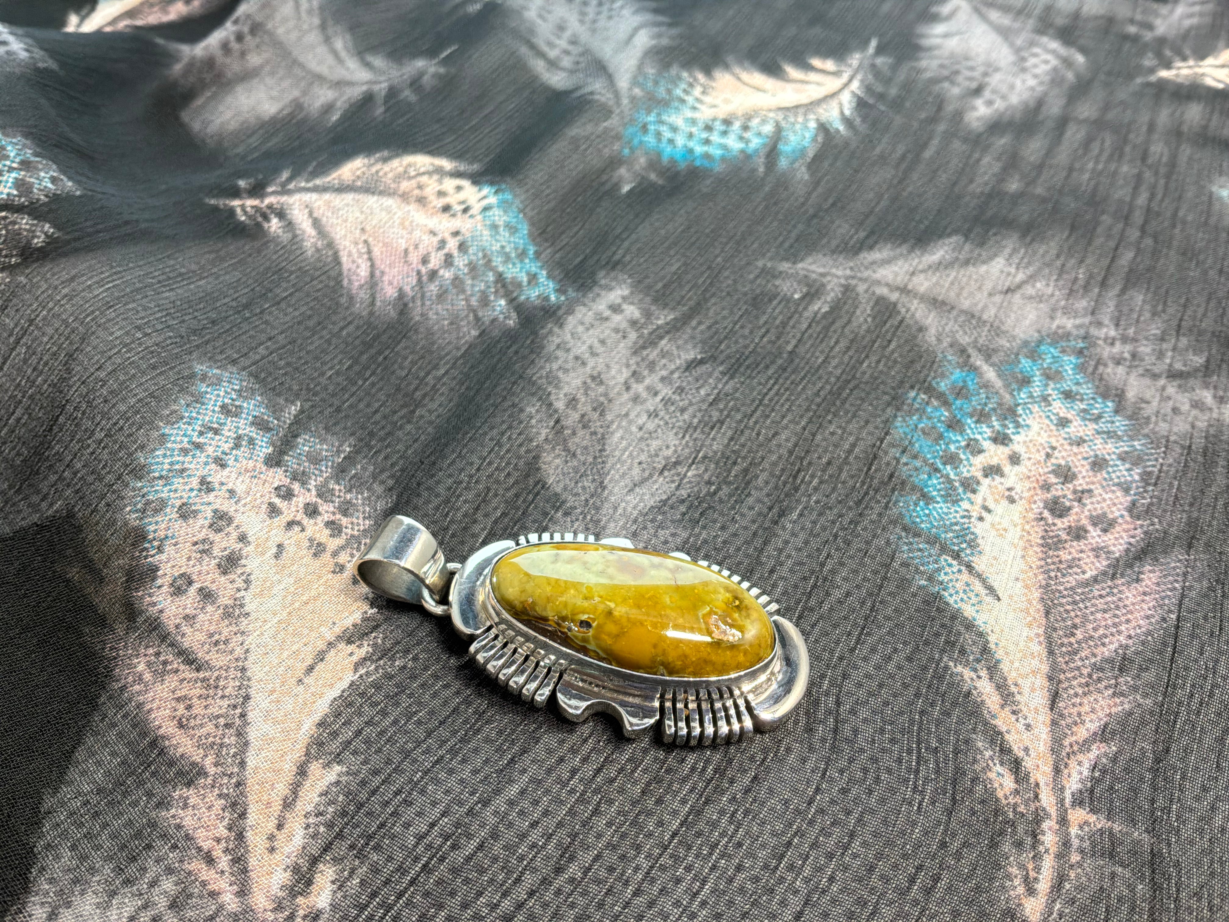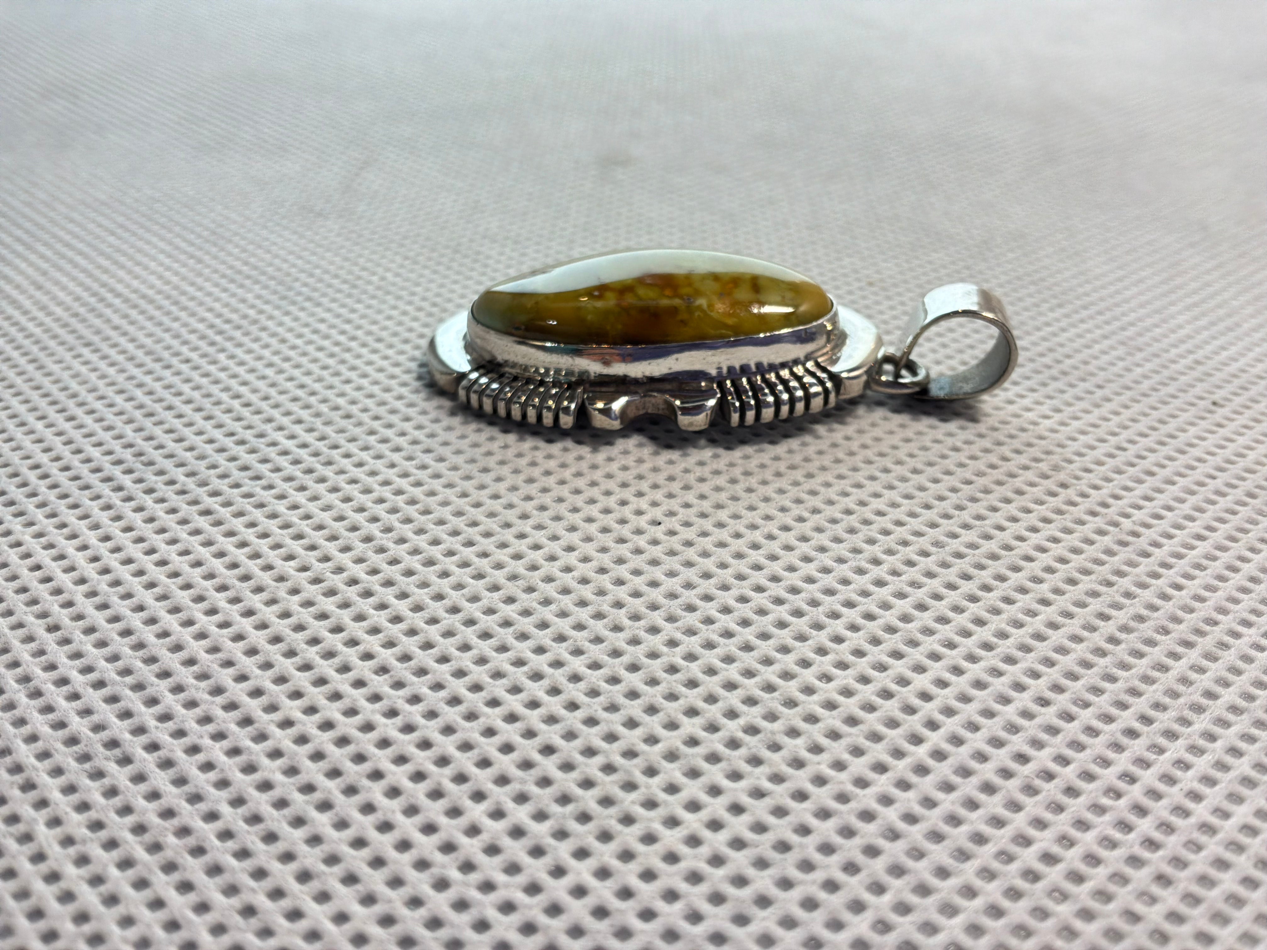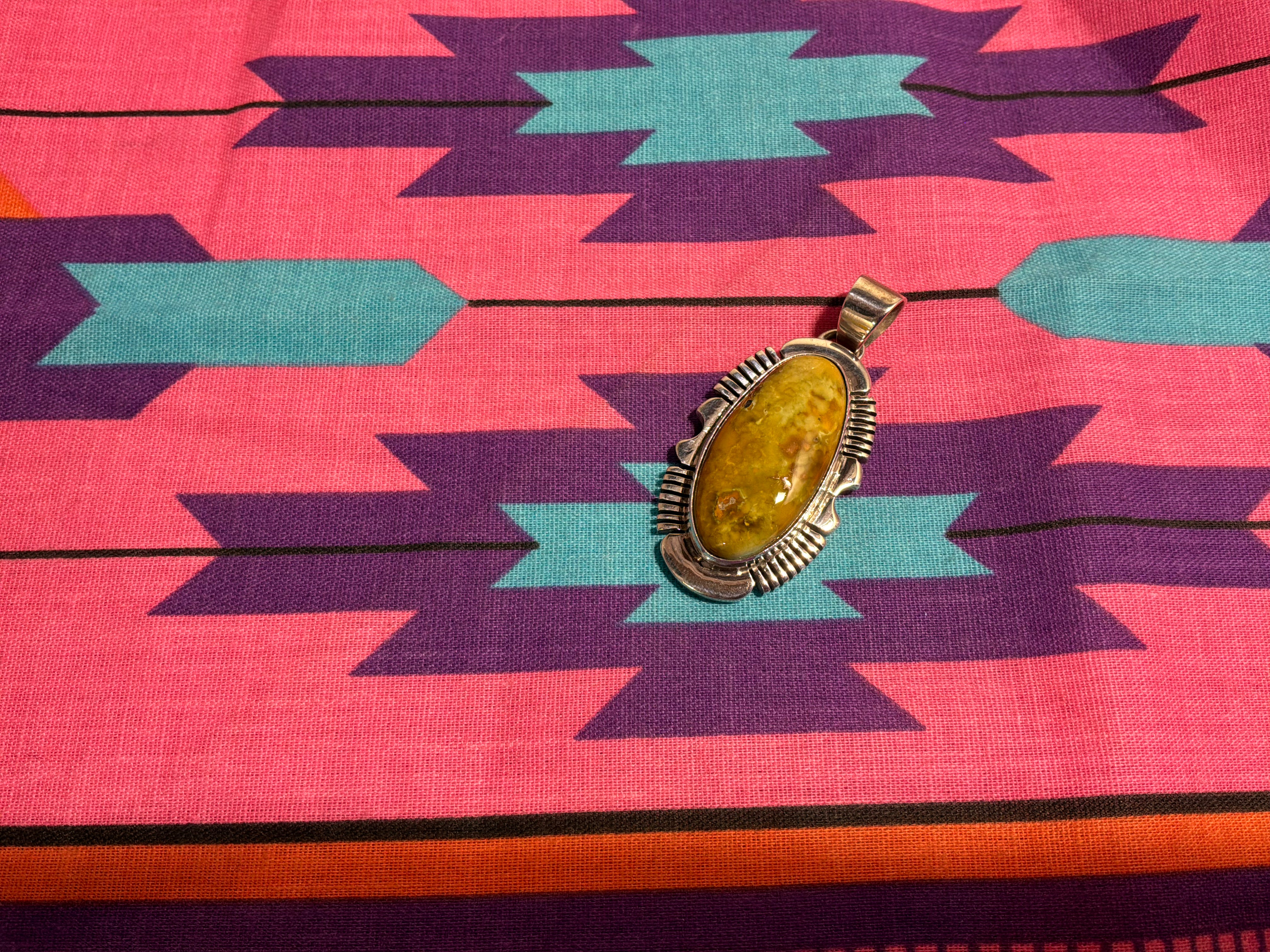 Sterling silver green turquoise pendant. Measurements are 2 inches from top of bail to bottom of pendant, almost one inch across and bail opening is 1/4 inch. Artist name J Nelson and sterling stamped on back.