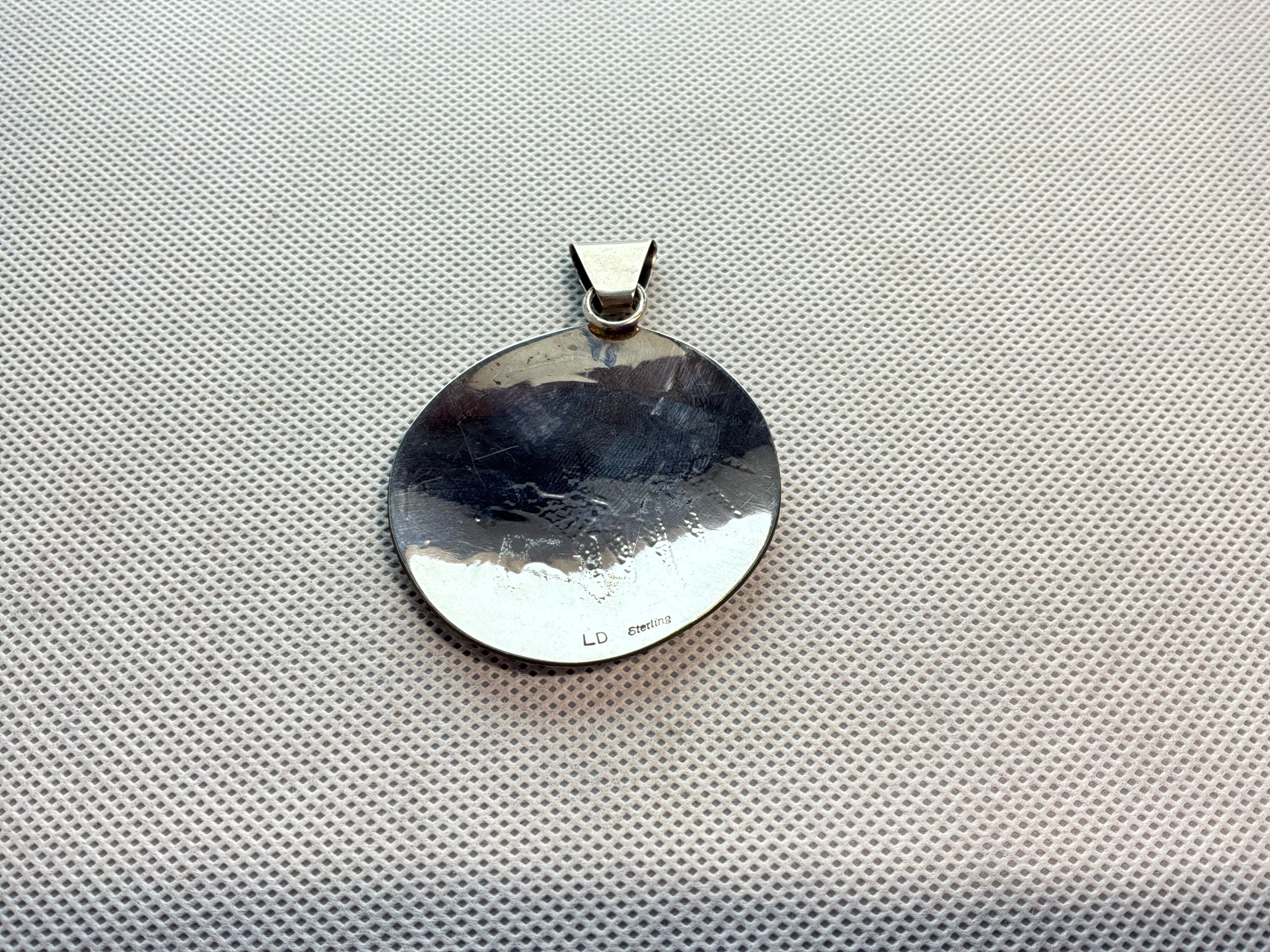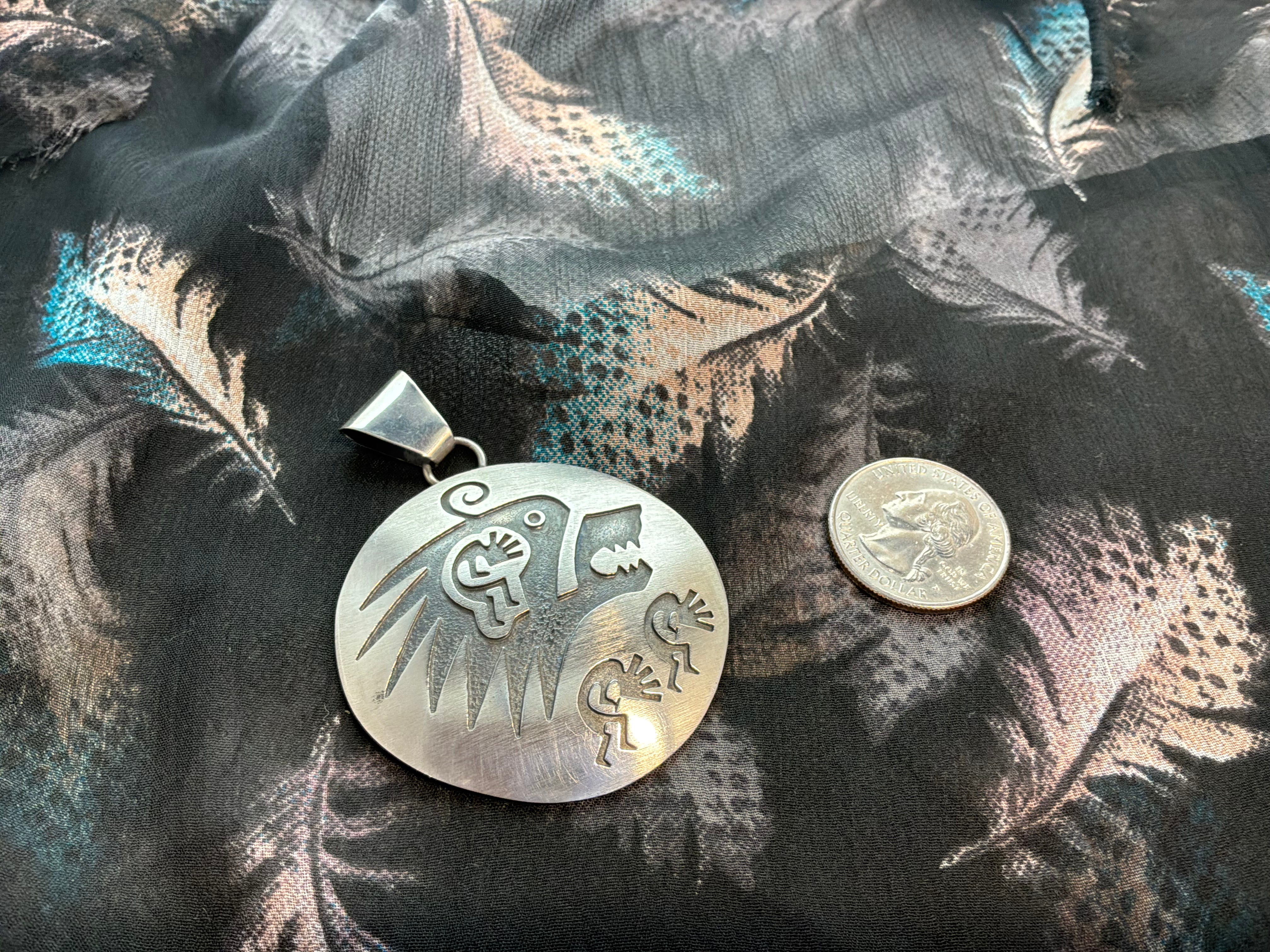 Sterling silver matte finish Hopi style pendant with wolf head and Kokopellis. Measurements are 2 3/4" from top of bail to bottom of pendant and 2 inches across. The bail opening is 1/4". Artist initials "LD" and sterling stamped on back