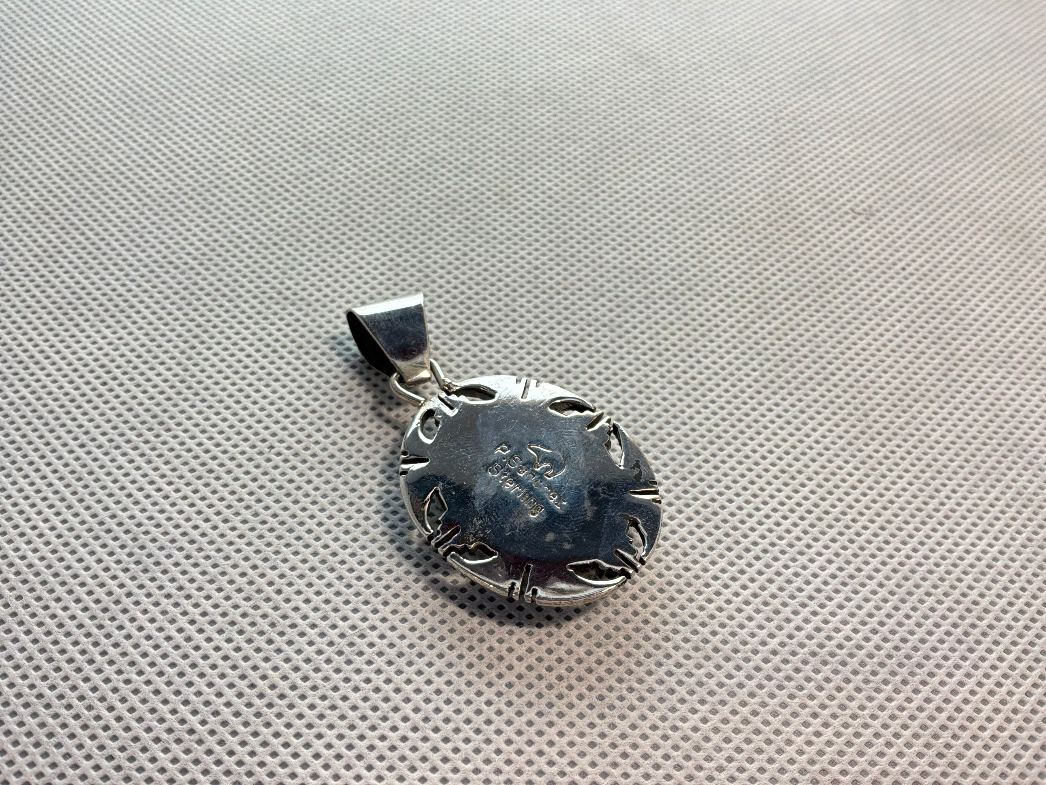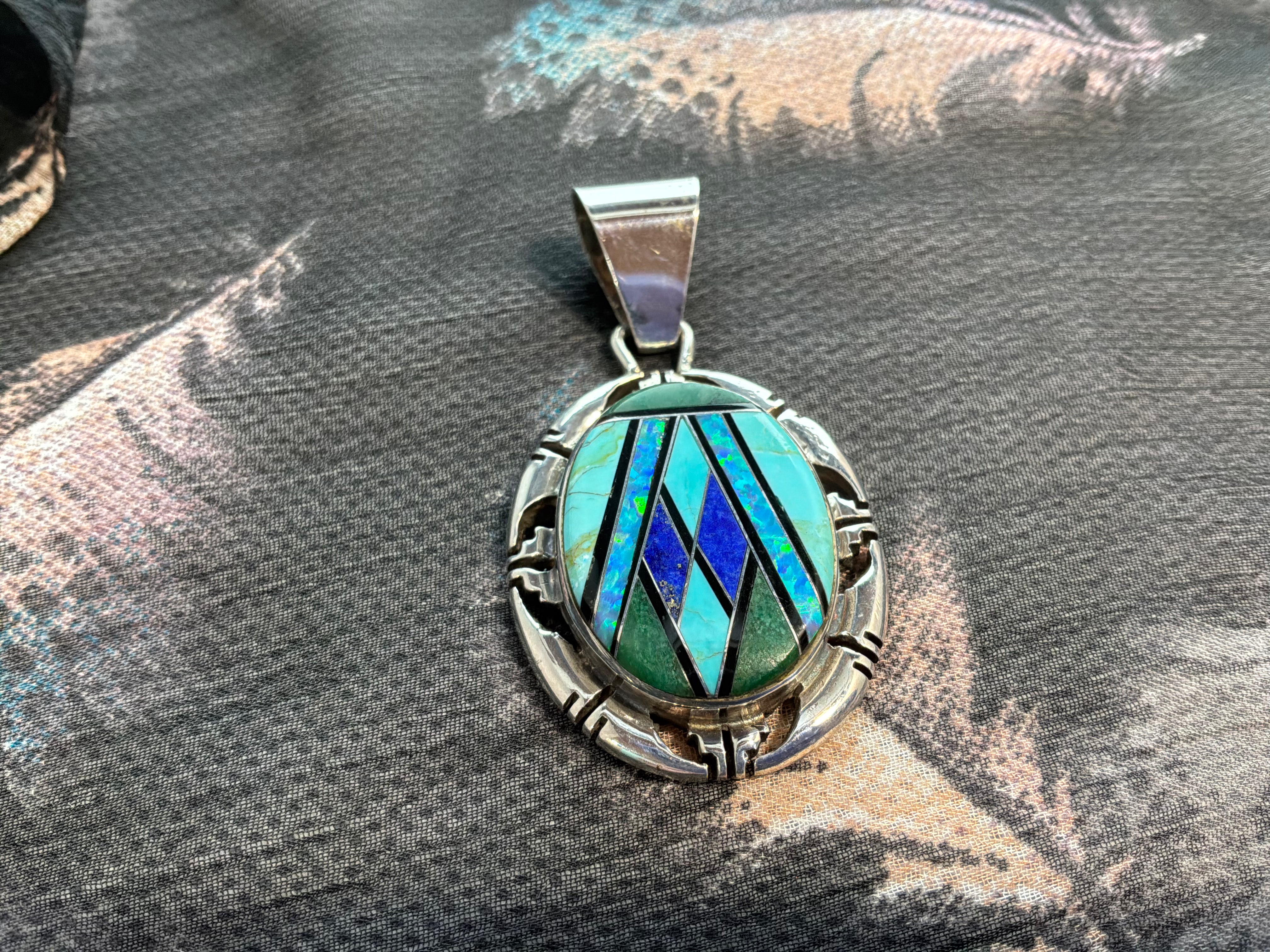 Sterling silver multi stone inlaid pendant with stones of Turquoise, Malachite, Lapis, and Fire Opal with jet dividing the stones. Fancy hand cut bezel around stone Pendant measure 2" from top of bail to bottom of pendant and 1 1/8" across. Bail opening 1/4". Artist P Sanchez and sterling stamped on back.