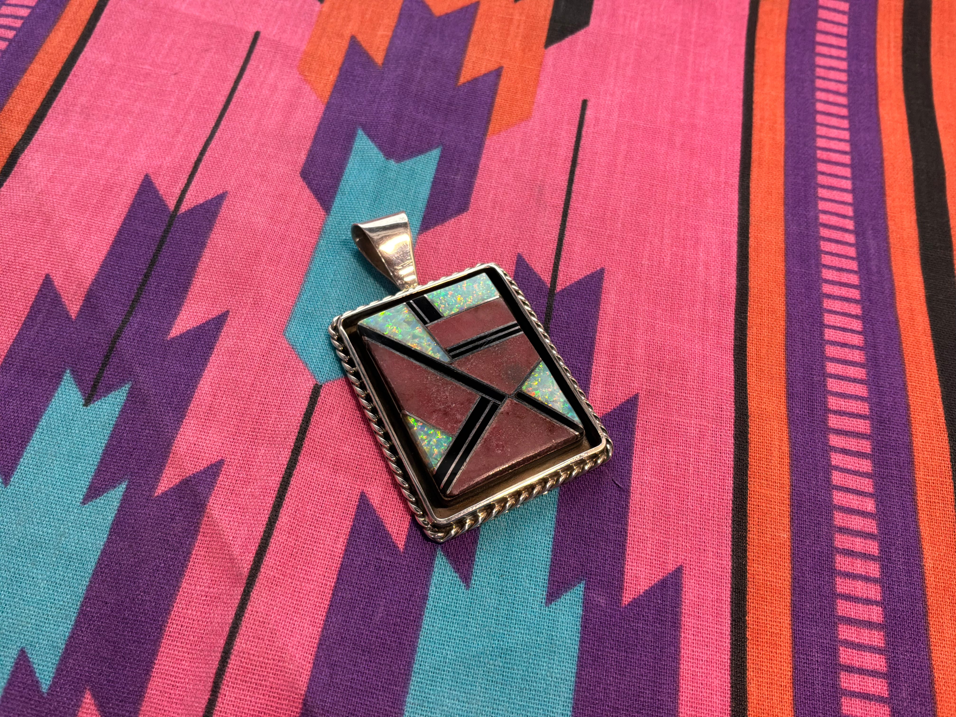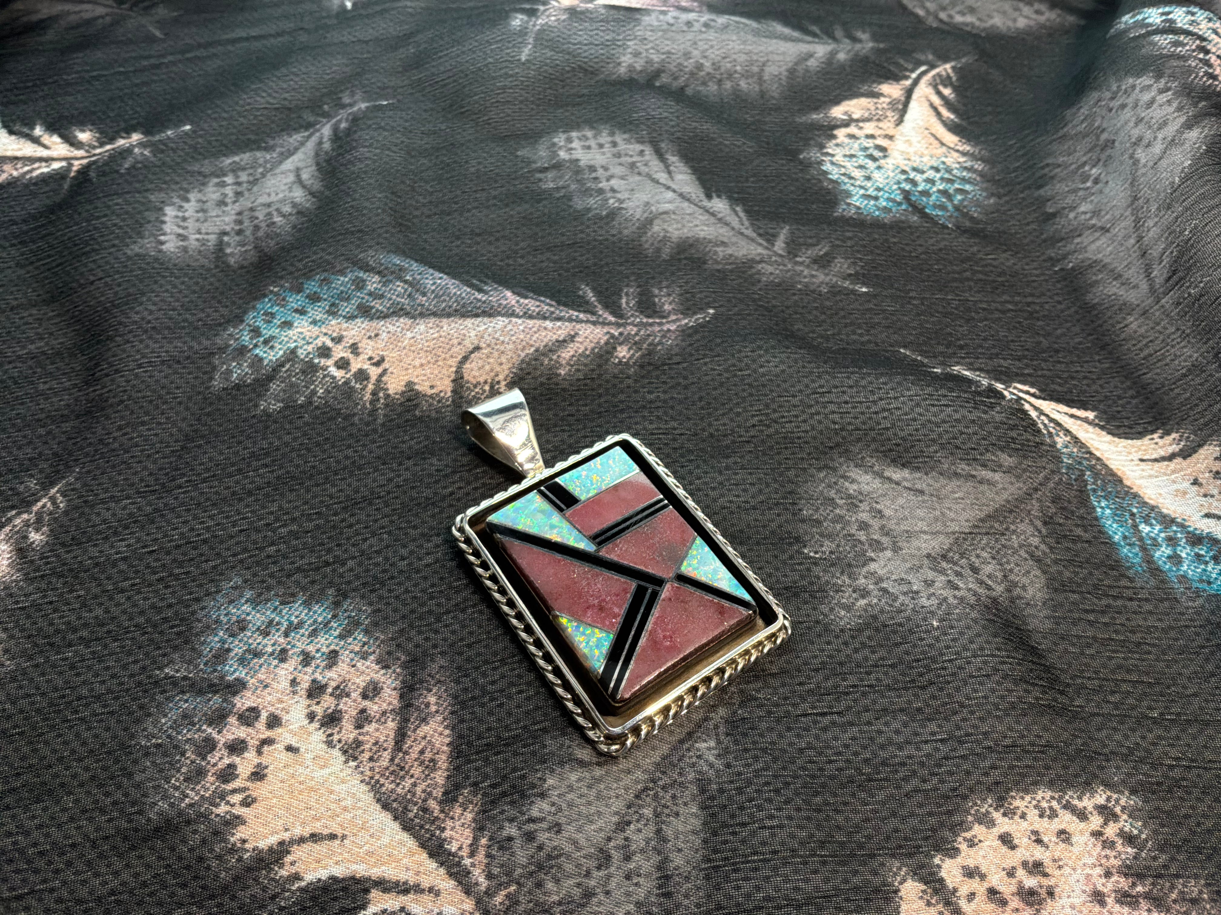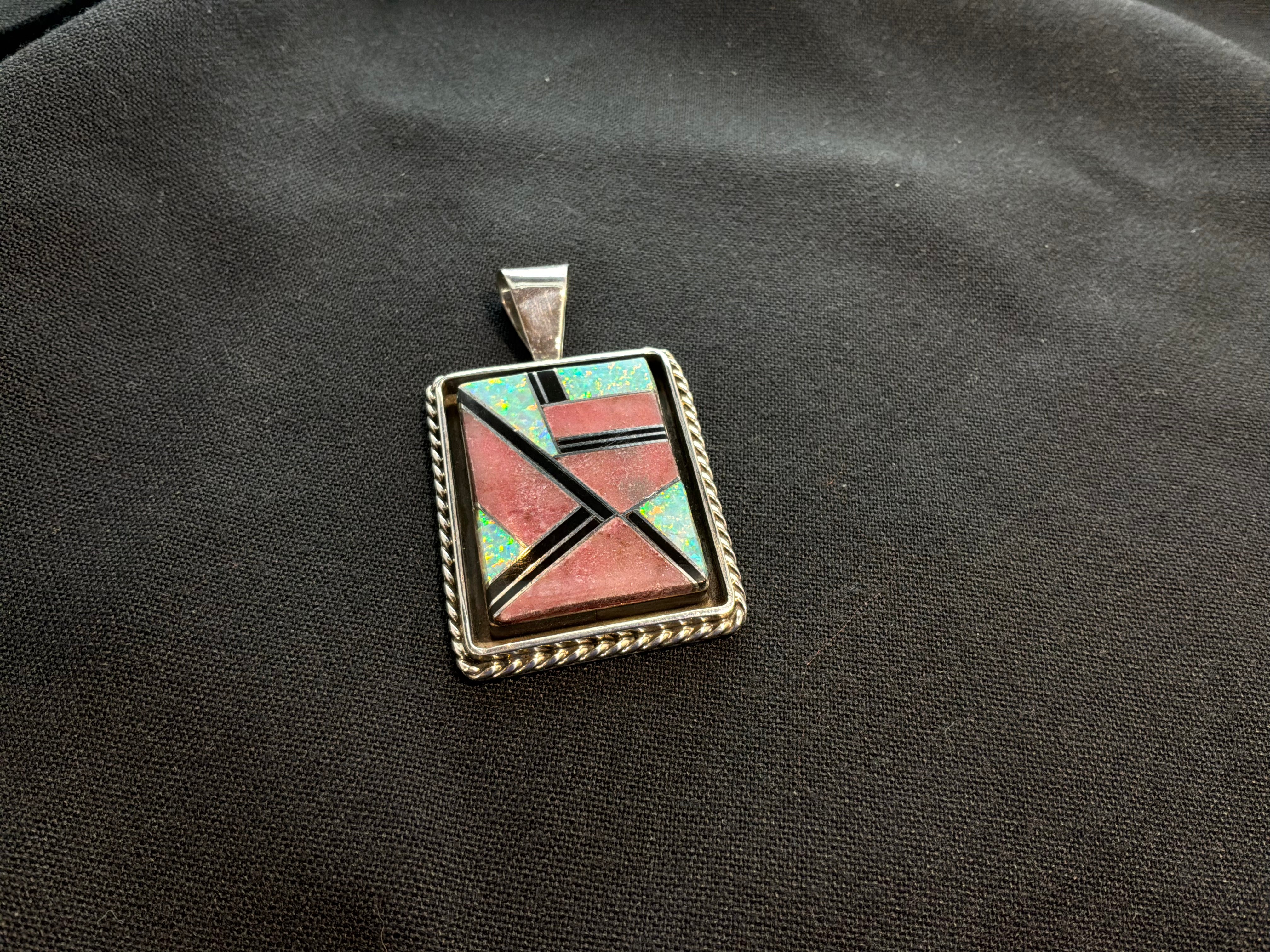 Sterling silver Rhodonite, Fire Opal and Jet inlay pedant. Measuring just over 2 inches from top of bail to bottom of pendant and 1 1/4" across. Bail opening 1/4". Artist initials "JMC" and sterling stamped on back.