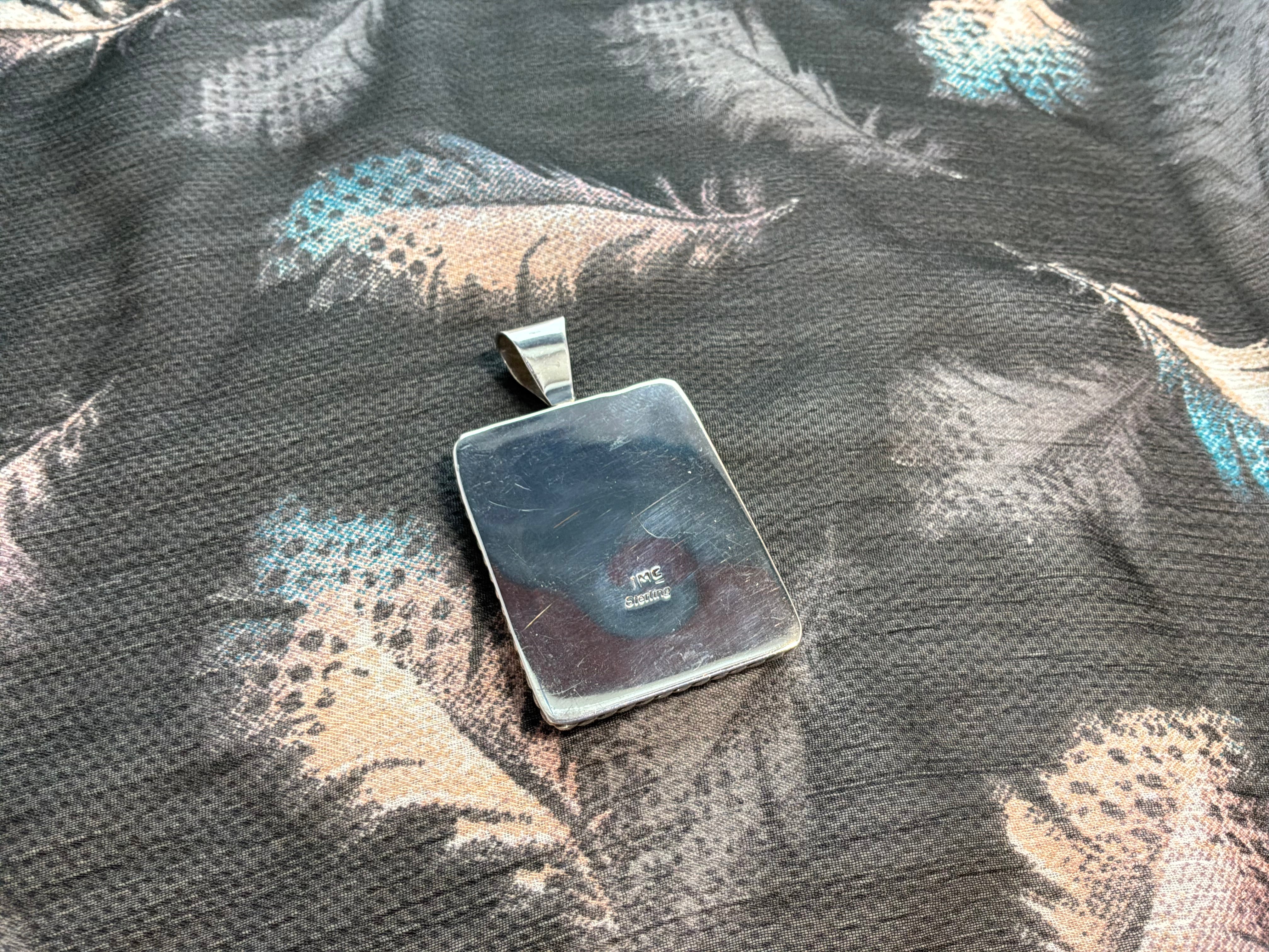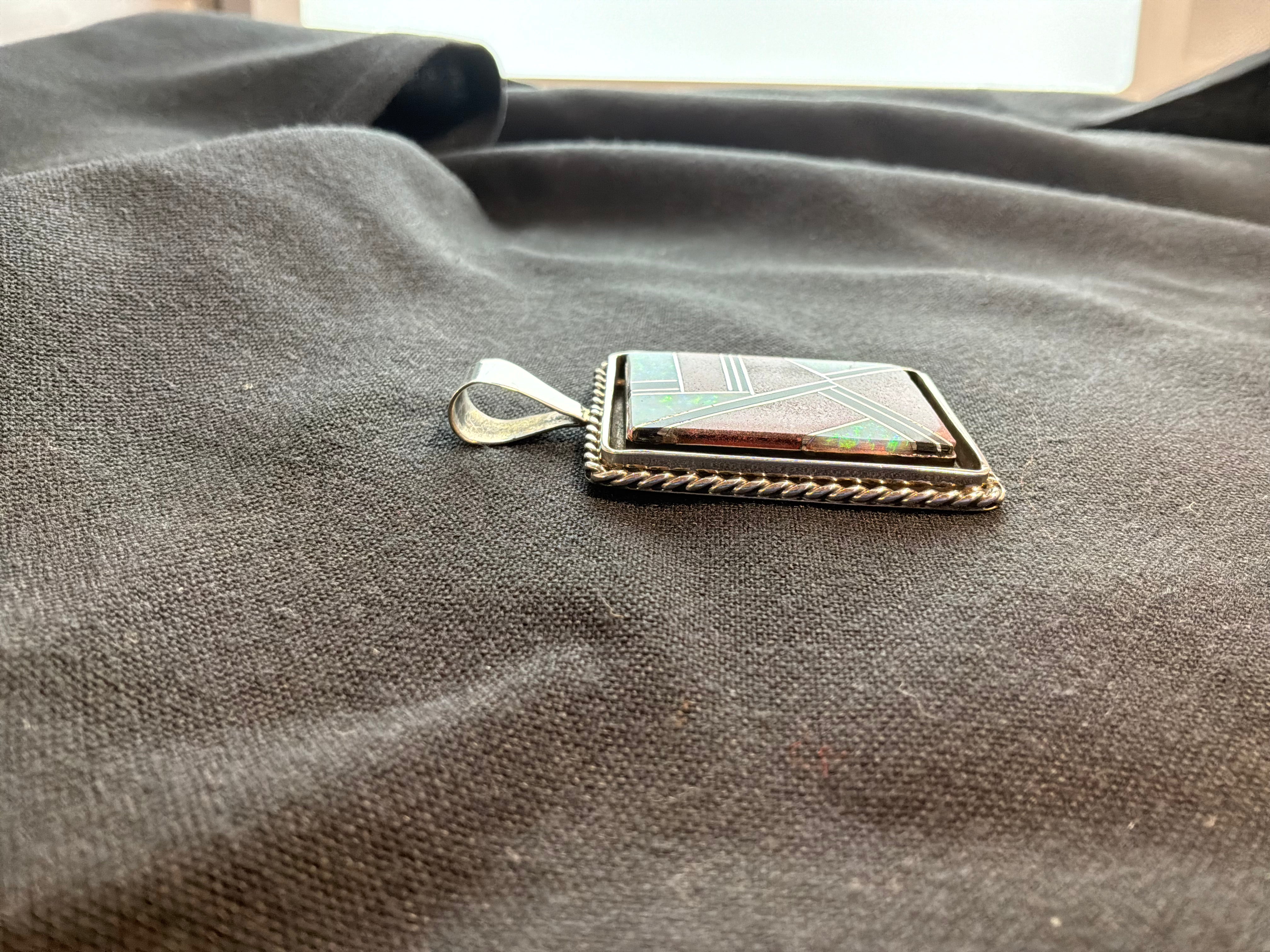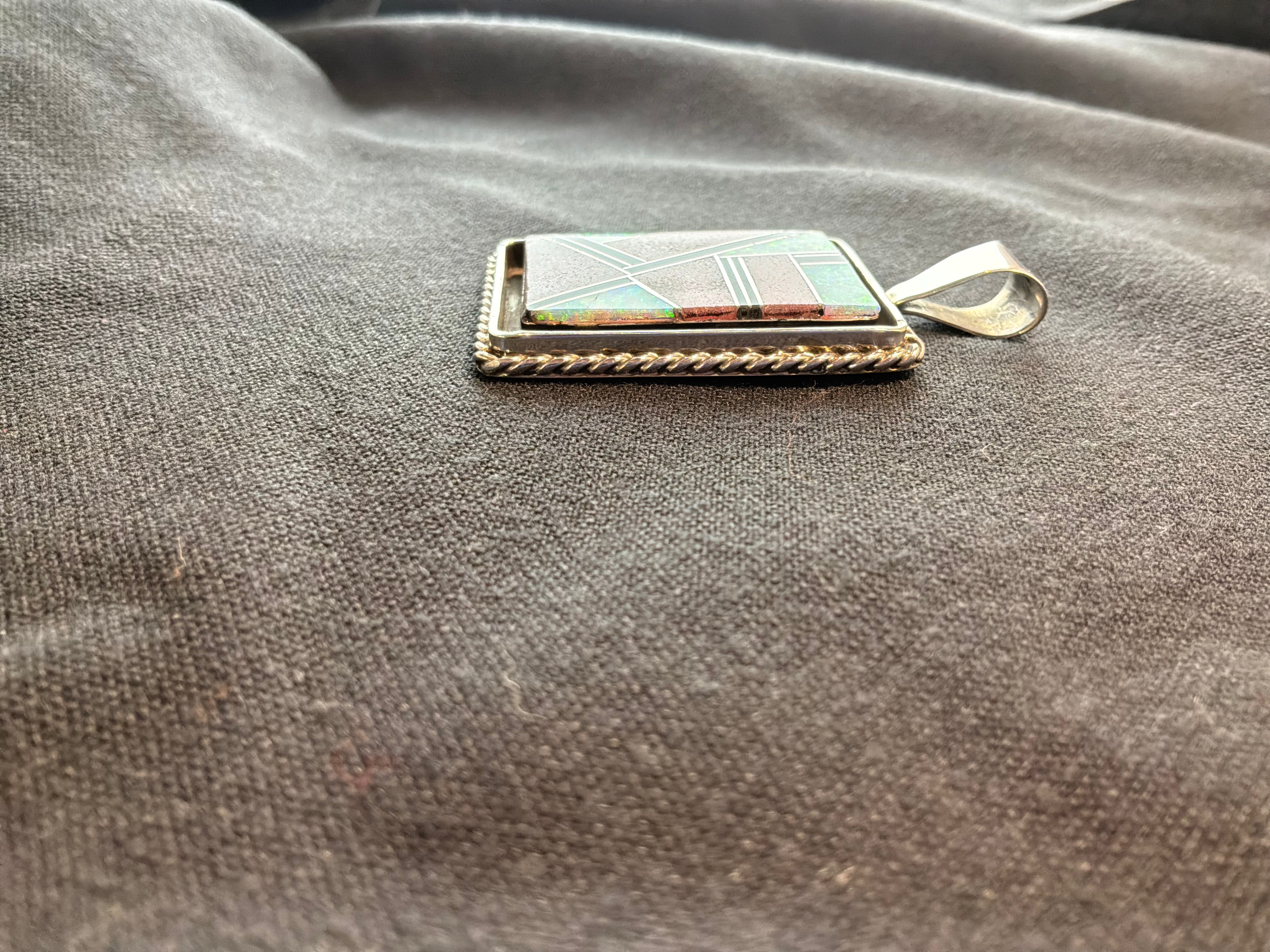 Sterling silver Rhodonite, Fire Opal and Jet inlay pedant. Measuring just over 2 inches from top of bail to bottom of pendant and 1 1/4" across. Bail opening 1/4". Artist initials "JMC" and sterling stamped on back.