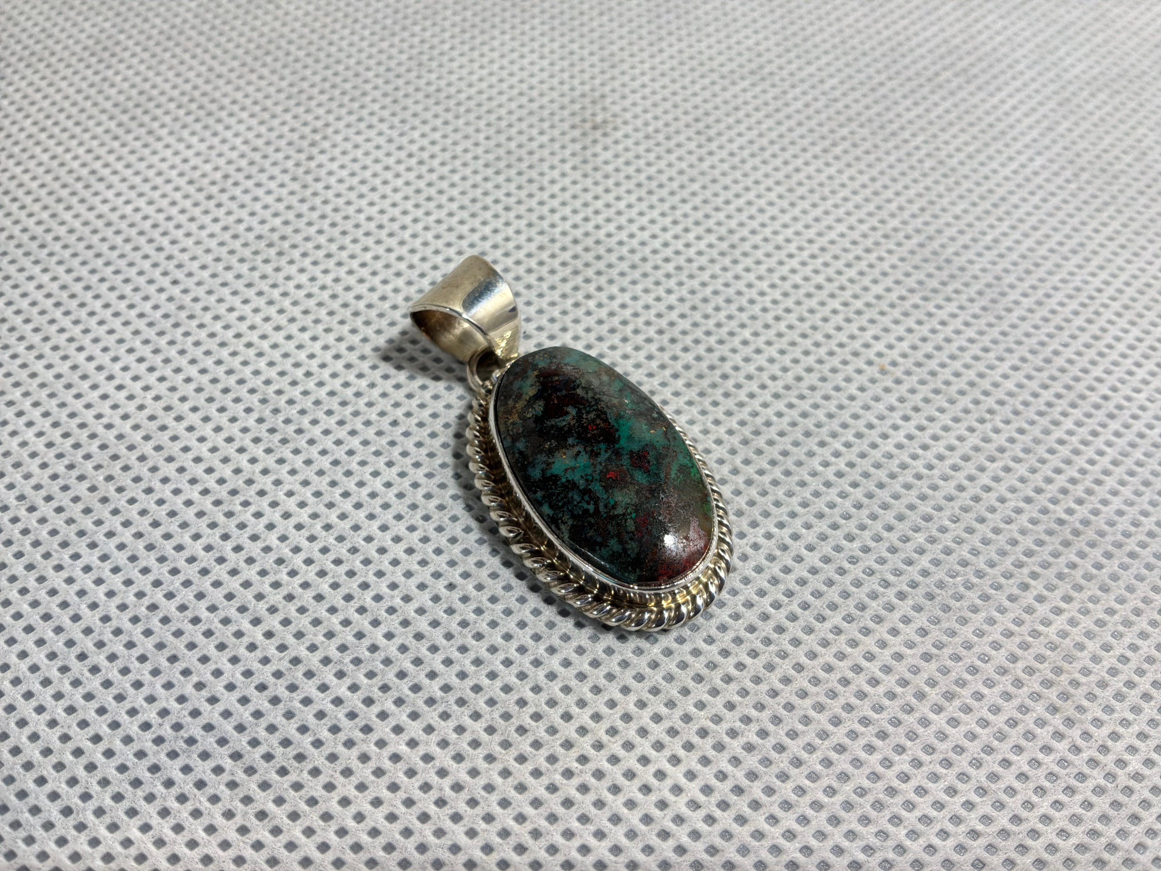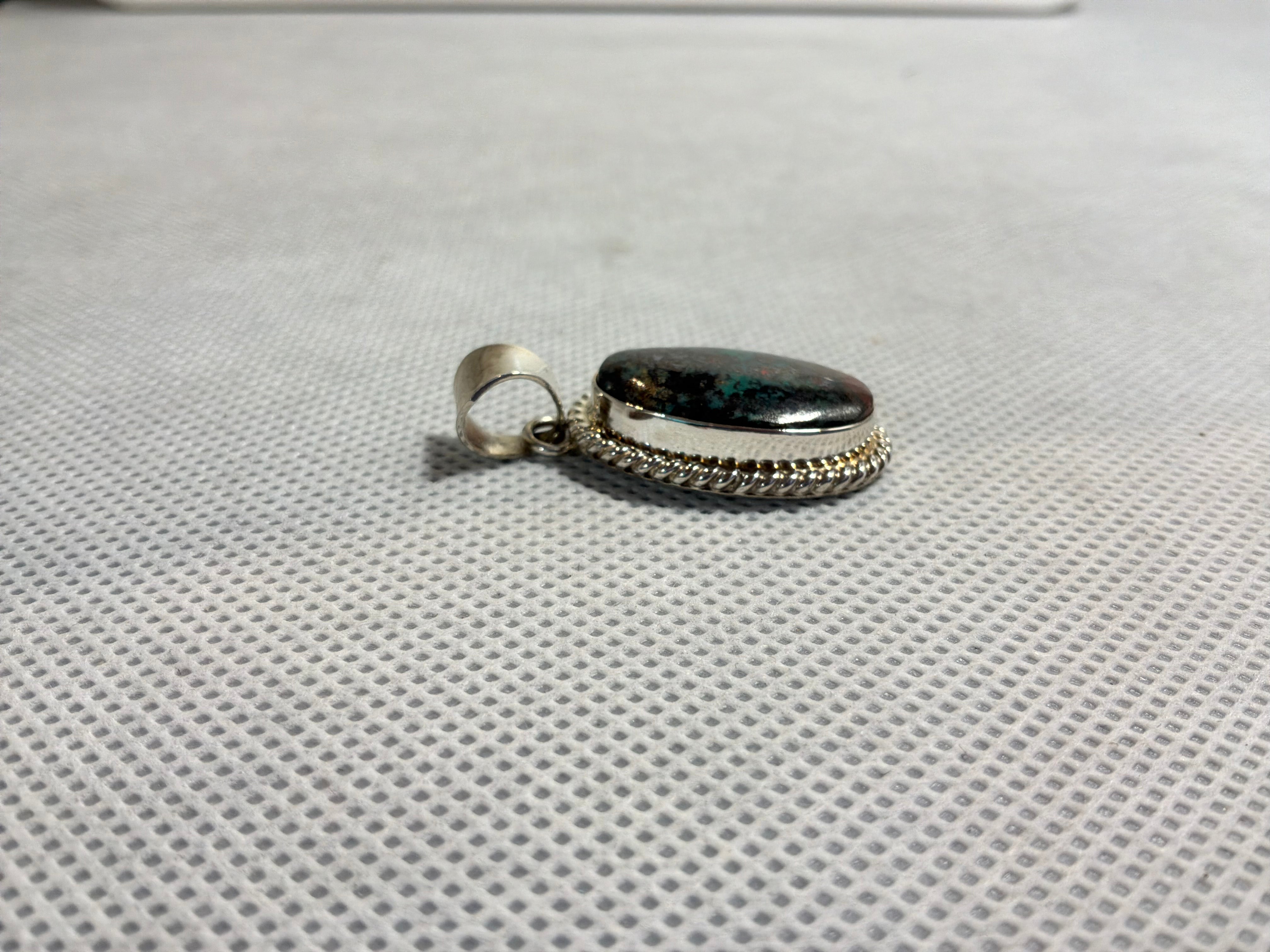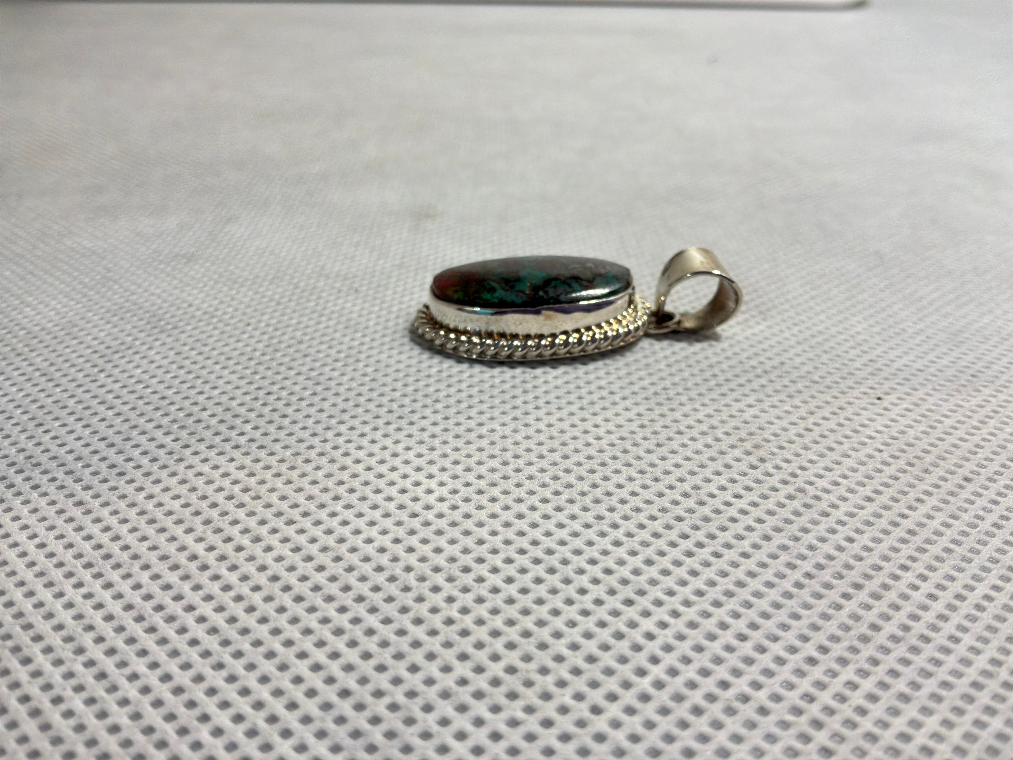 Sterling silver Sonoran Sunrise, a form of Chrysocolla, pendant. Measuring 1 1/2" from top of bail to bottom of pendant, 3/4" across and 1/4" bail opening. Artist initial "A" and sterling stamped on back.