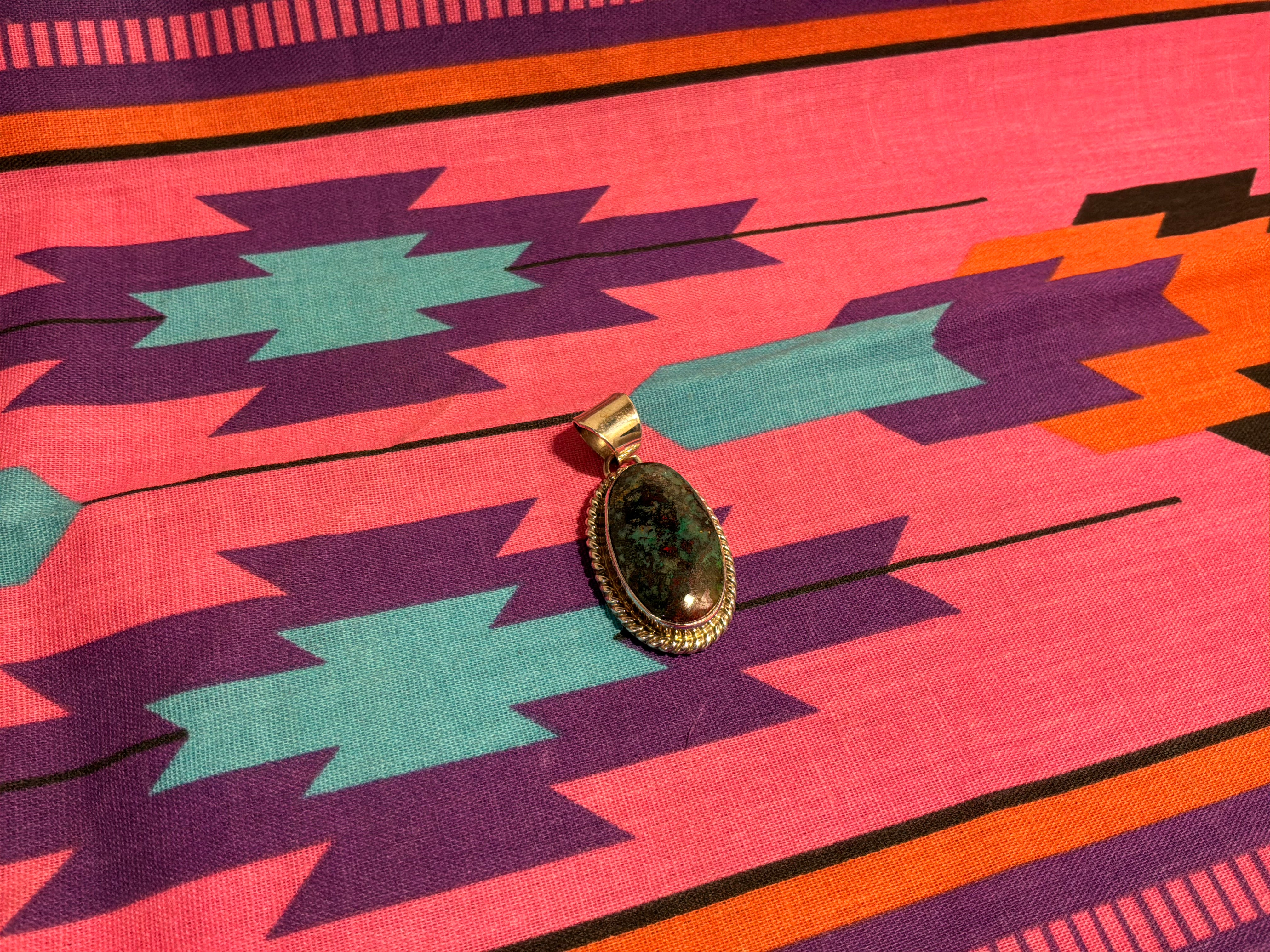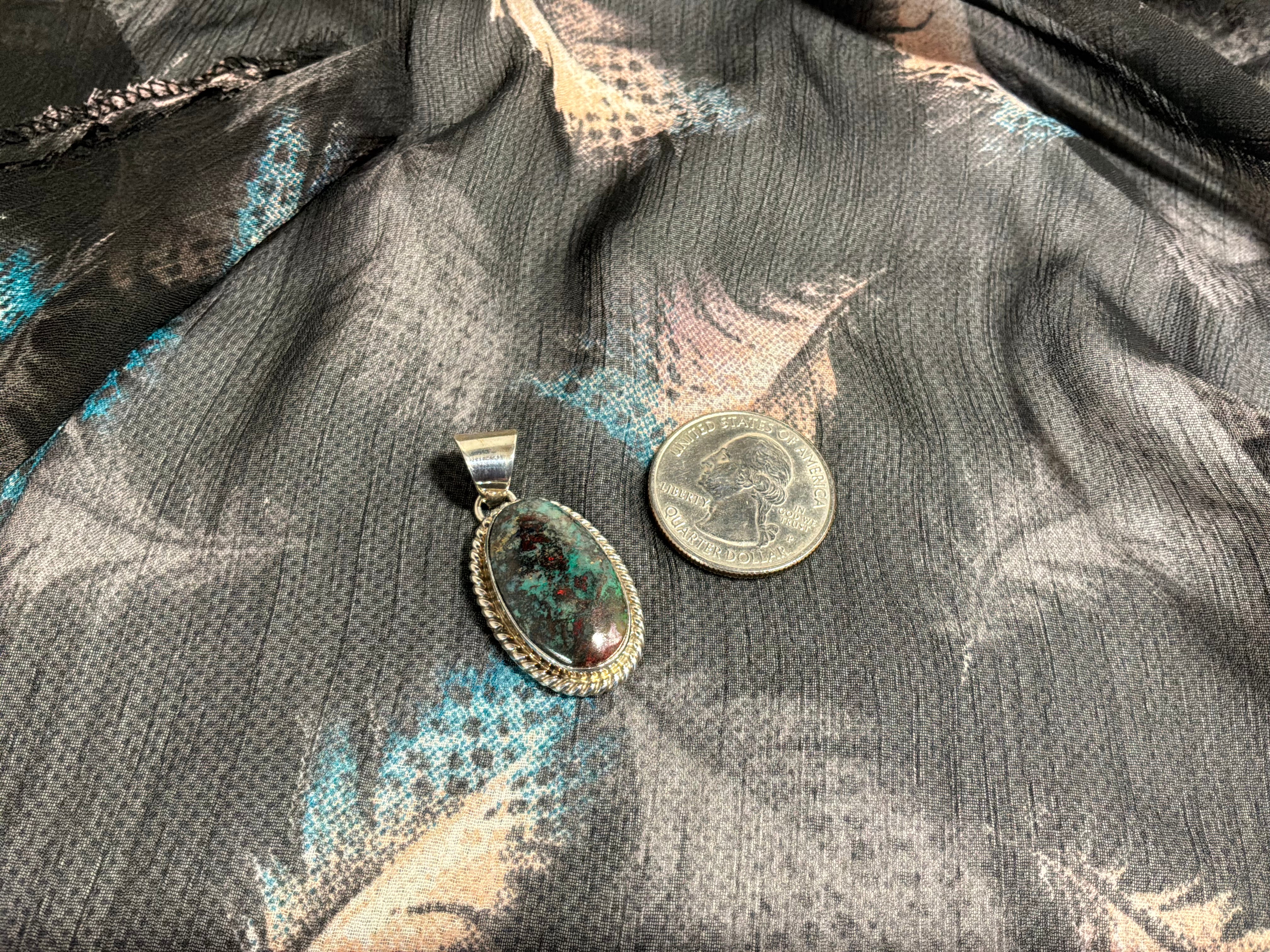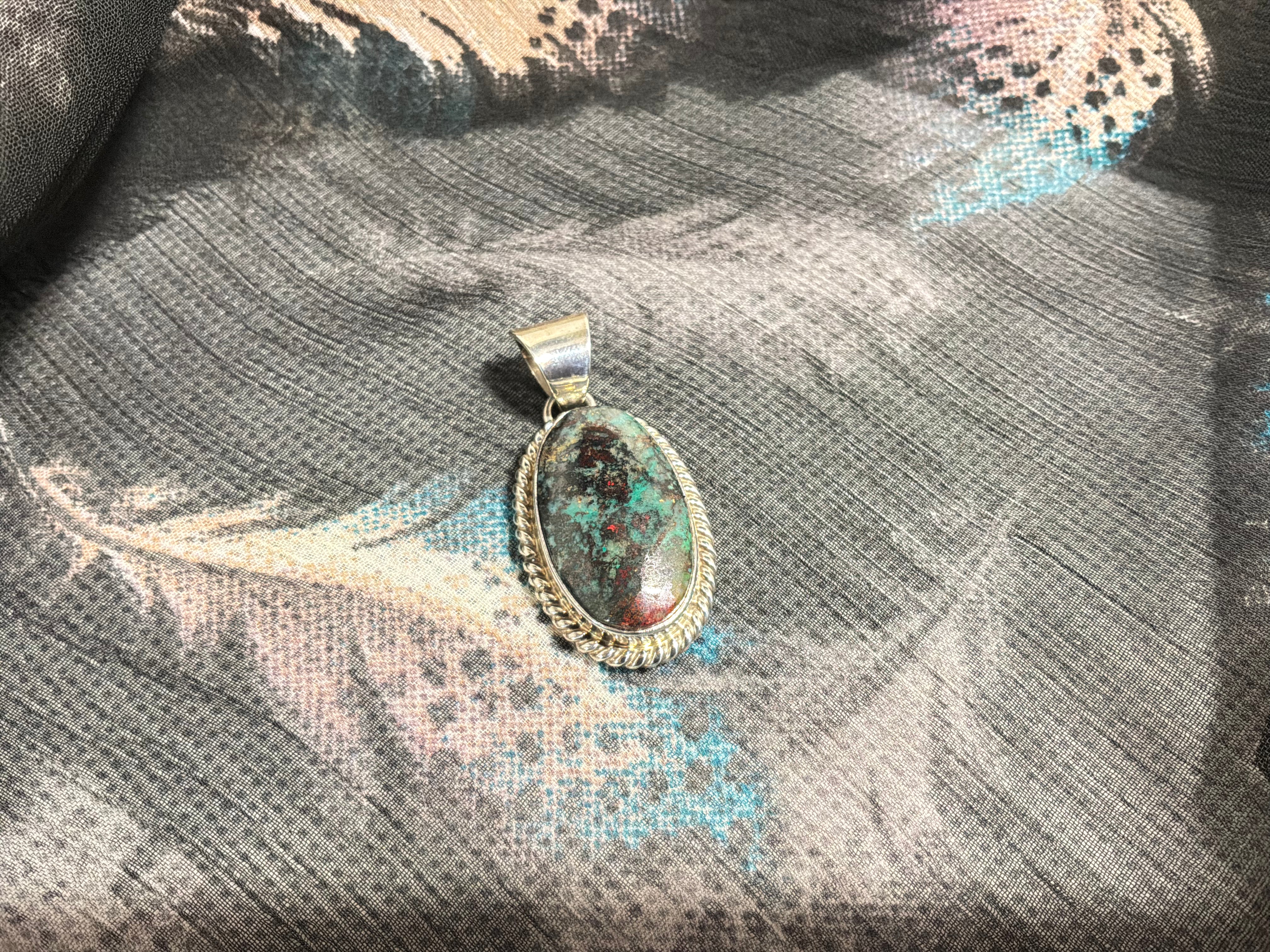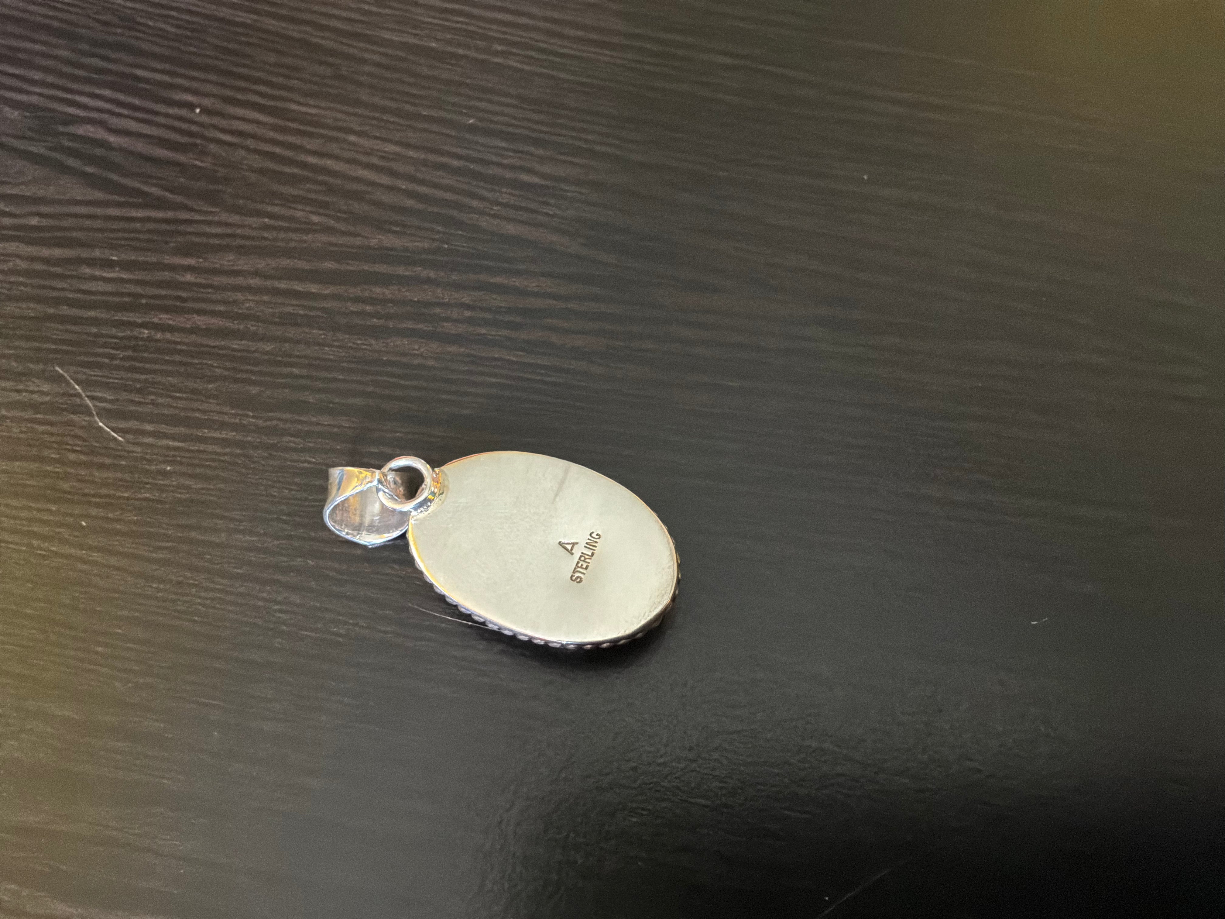 Sterling silver Sonoran Sunrise, a form of Chrysocolla, pendant. Measuring 1 1/2" from top of bail to bottom of pendant, 3/4" across and 1/4" bail opening. Artist initial "A" and sterling stamped on back.