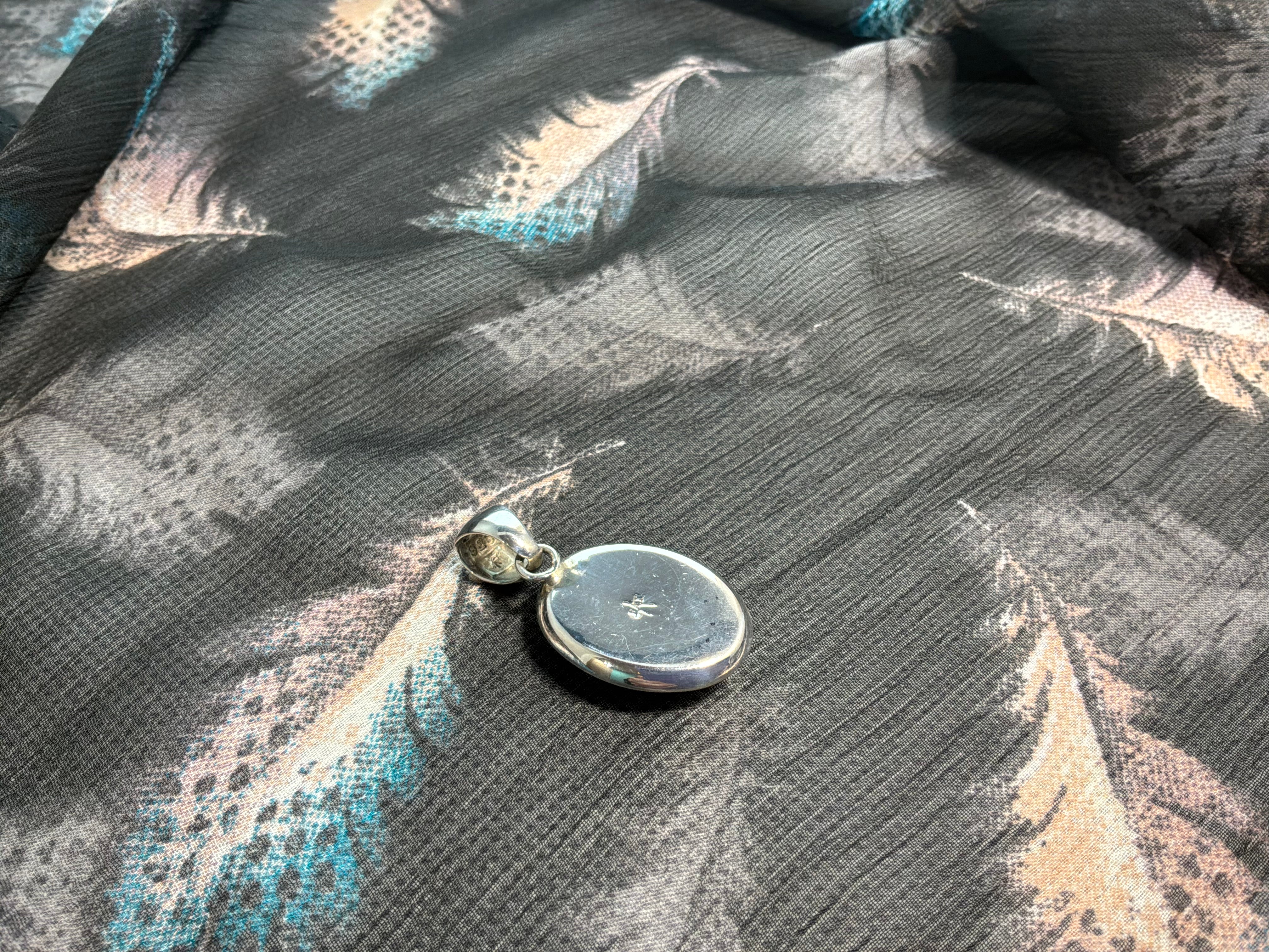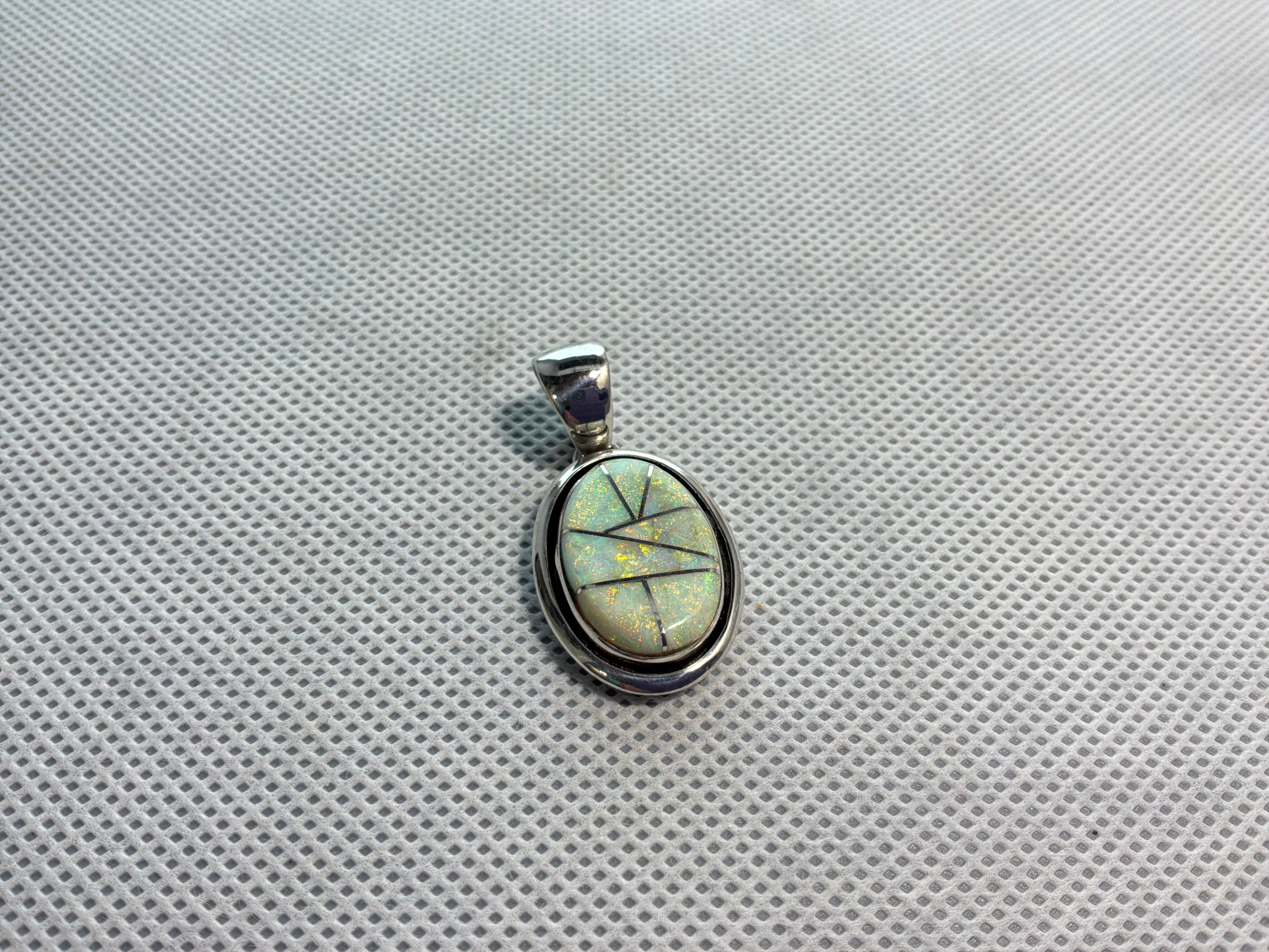 Sterling silver Spider Web Opal inlaid pendant. Measuring just over 1 1/4 inches from top of bail to bottom of pendant, 3/4 of an inch across and bail opening is 1/4 inch. Artist insignia and sterling stamped on back.