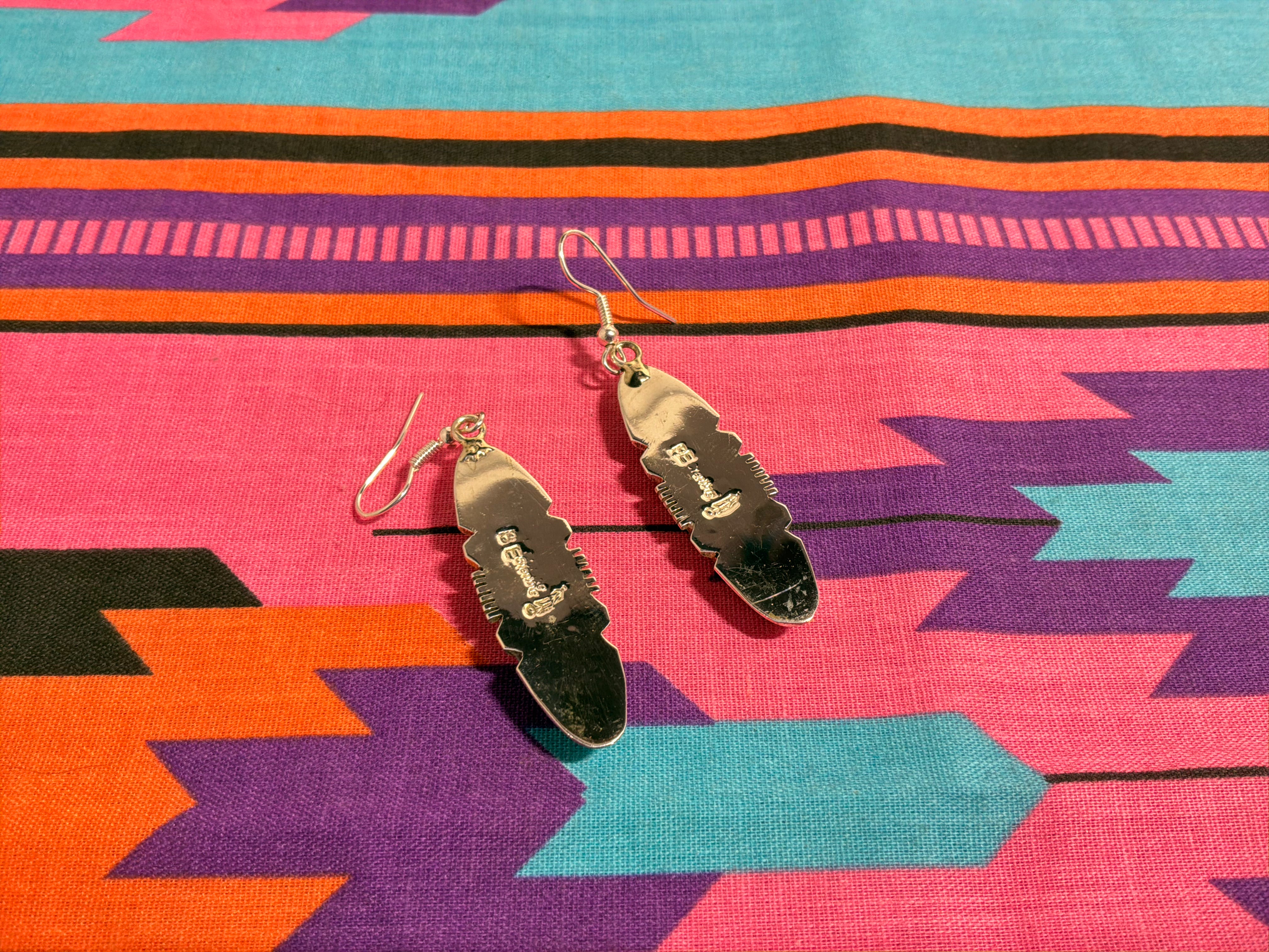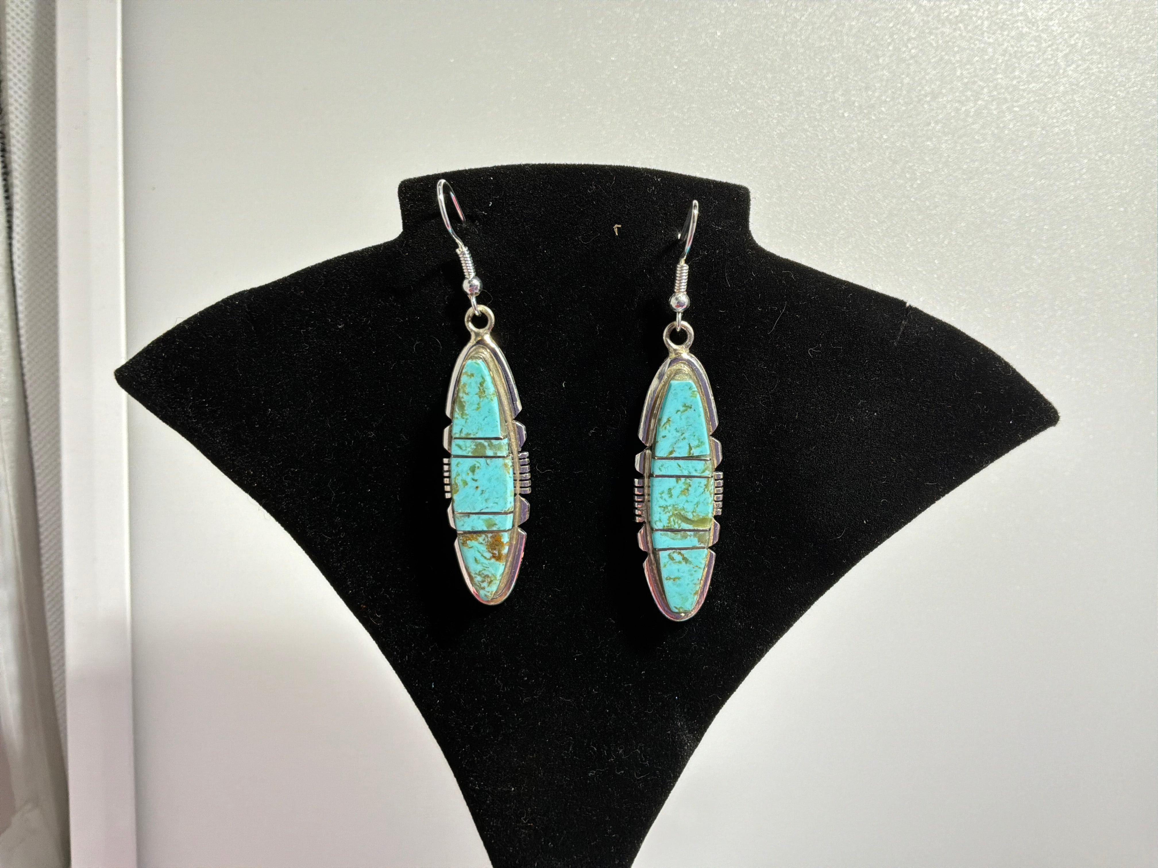 Sterling silver #8 mine Turquoise inlaid earrings. Measuring from top of wire to bottom earring almost 2 1/2" and 1/2" across at the widest. Artist insignia and sterling stamped on back.