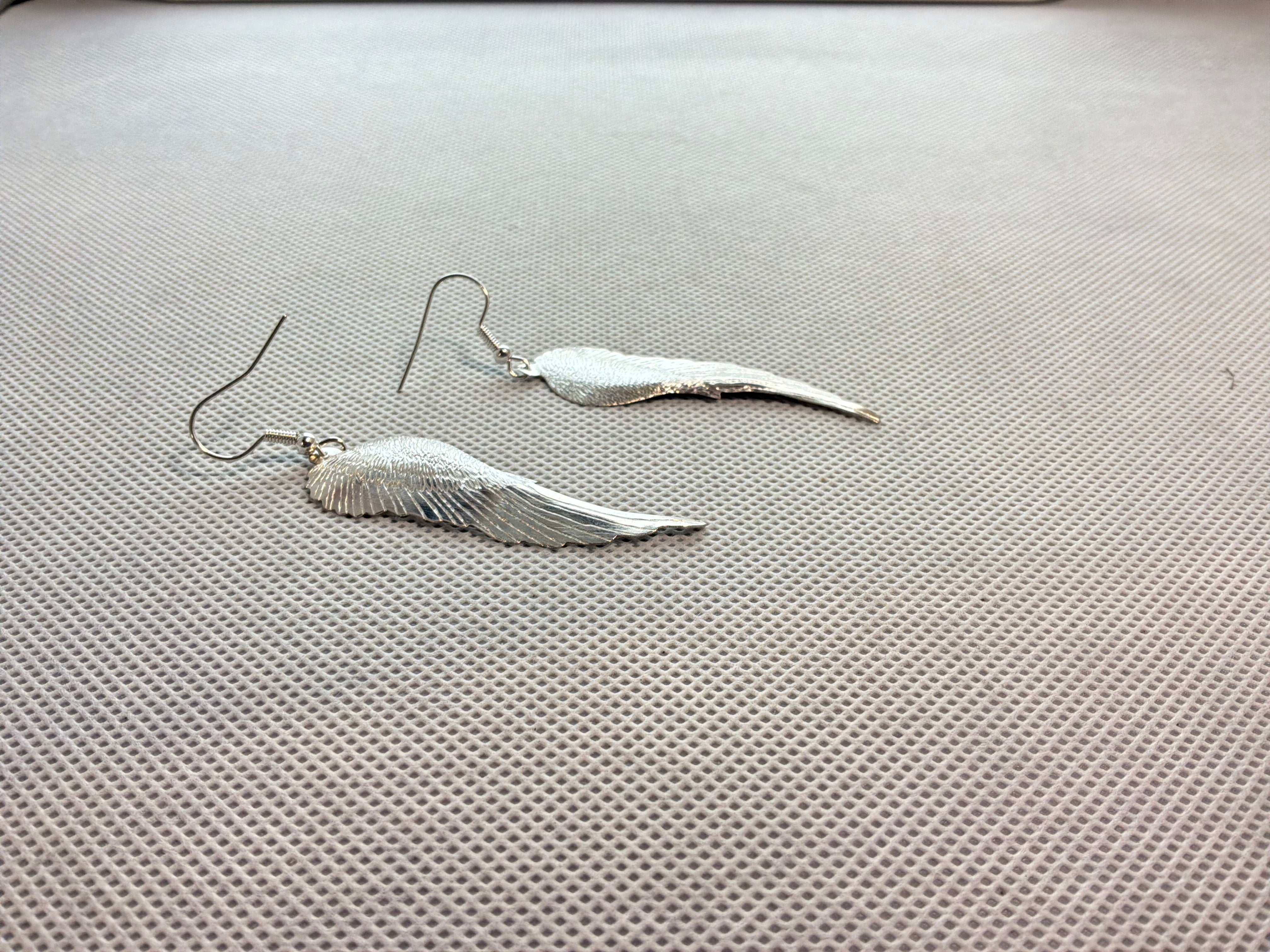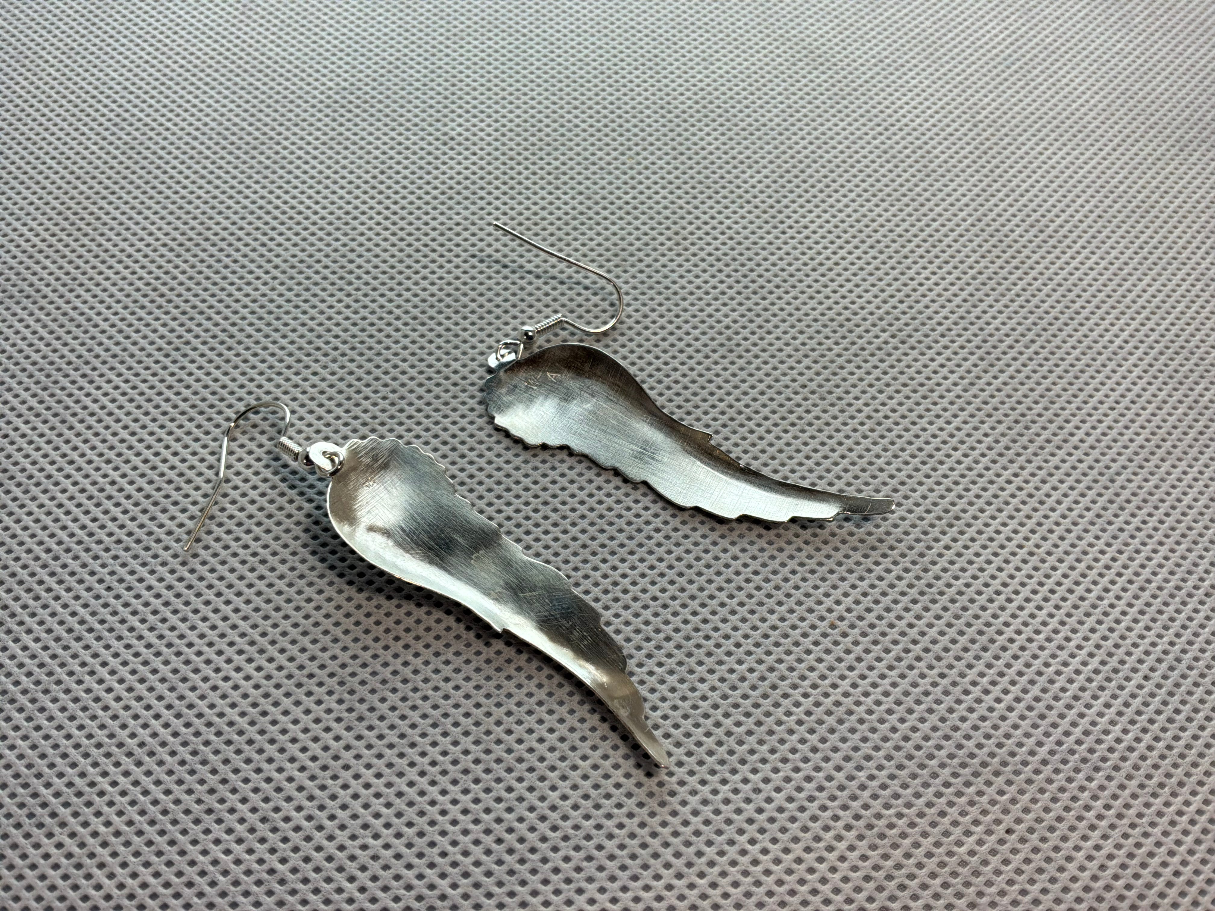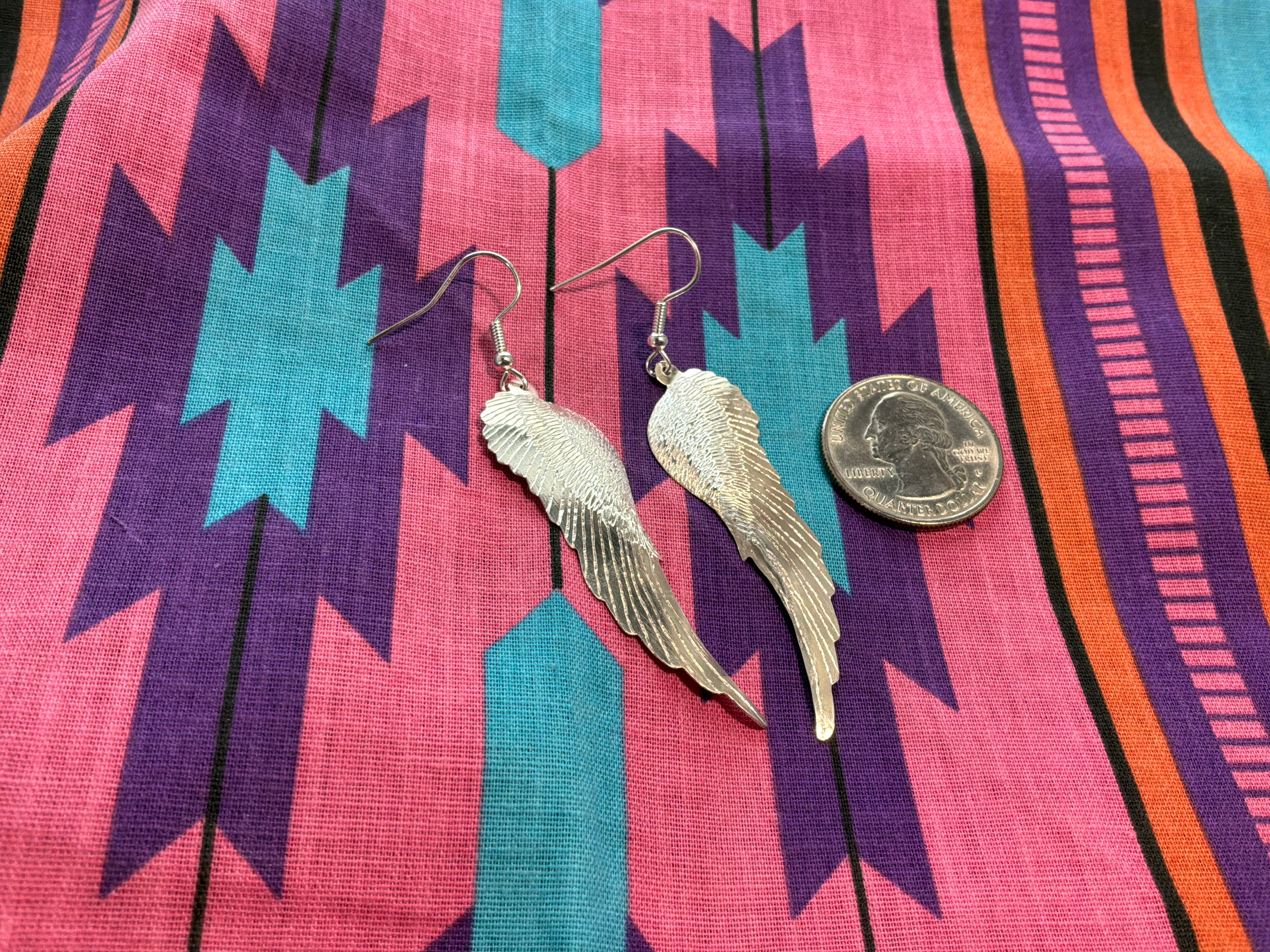 Sterling silver angel wing earrings. Measuring 3 inches from top of wire to bottom of wing and approximately 3/4" at the widest. Artist initials "WA" and 925 stamped on back.