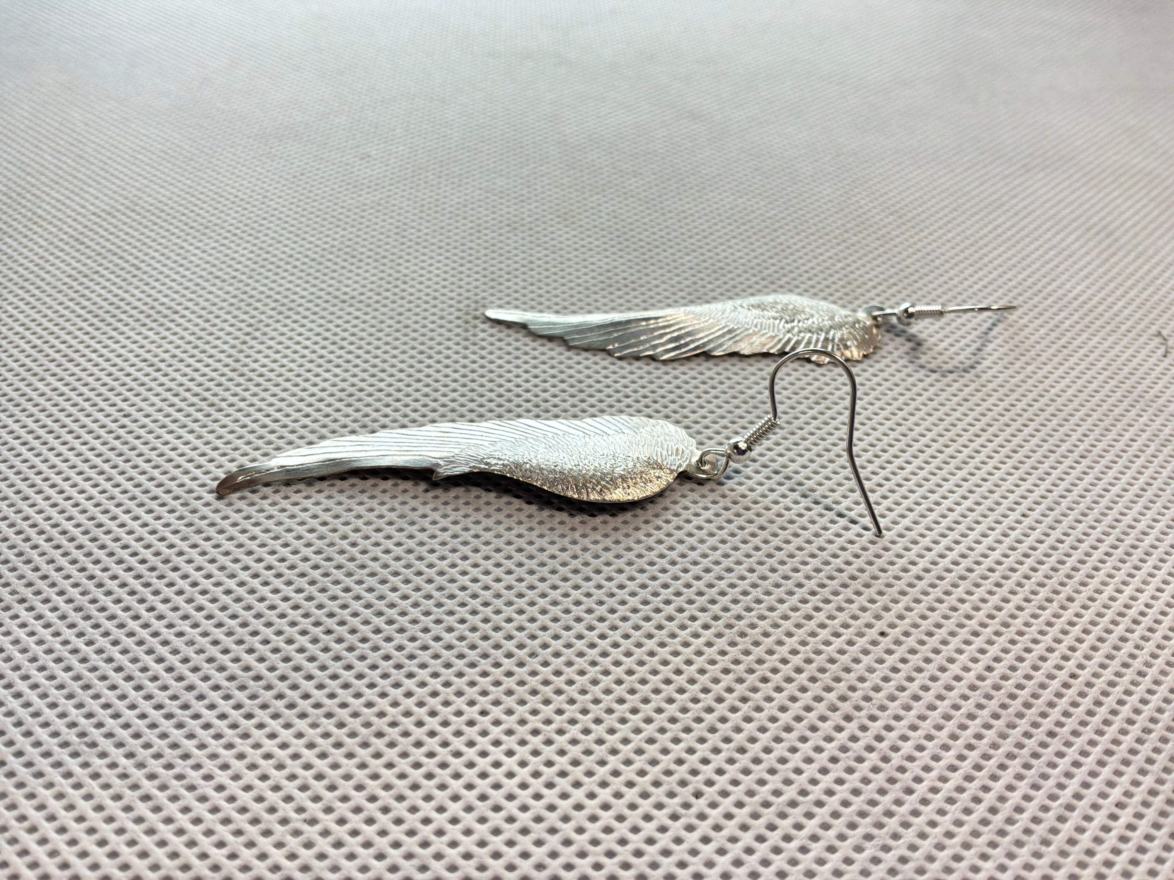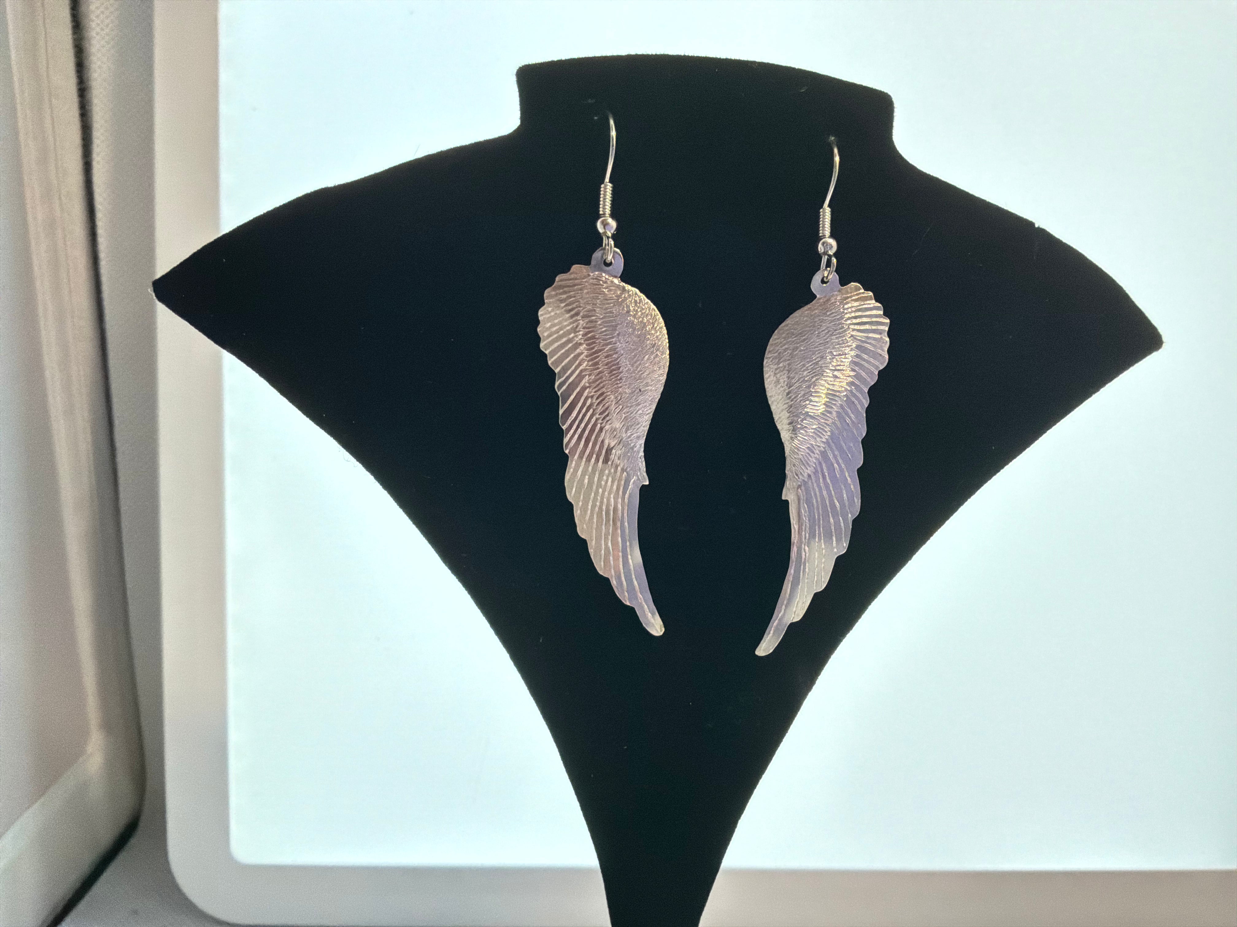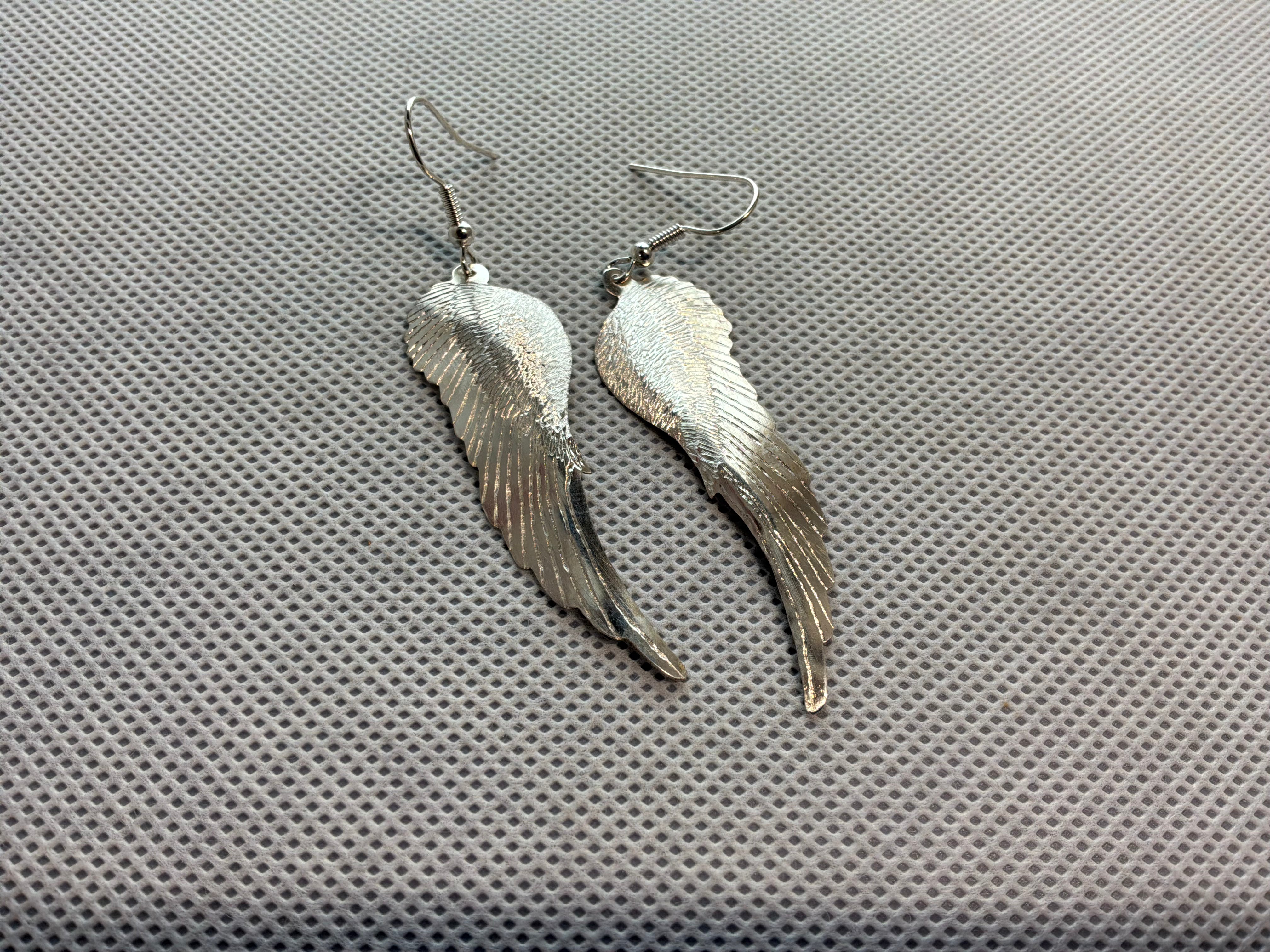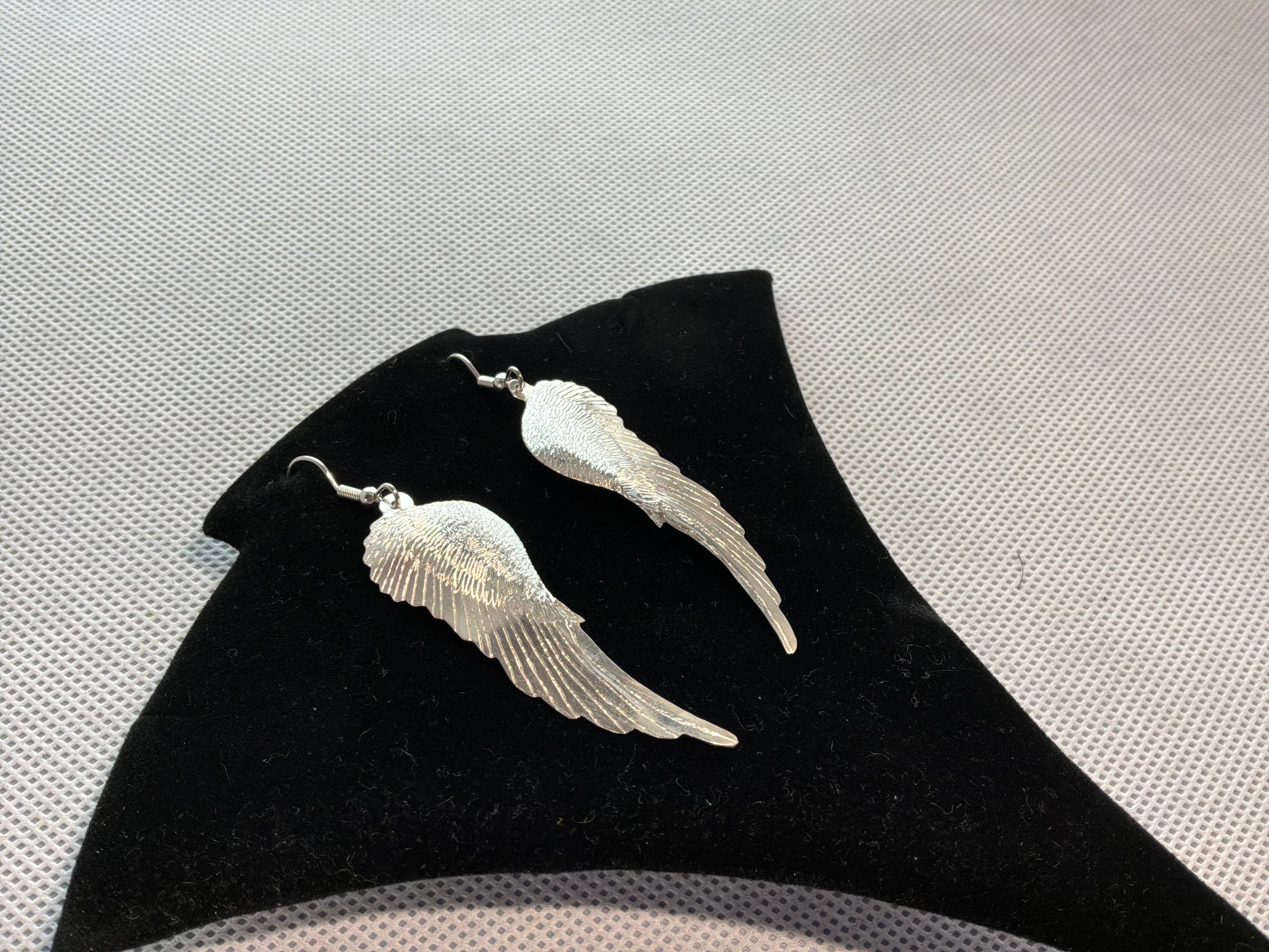 Sterling silver angel wing earrings. Measuring 3 inches from top of wire to bottom of wing and approximately 3/4" at the widest. Artist initials "WA" and 925 stamped on back.