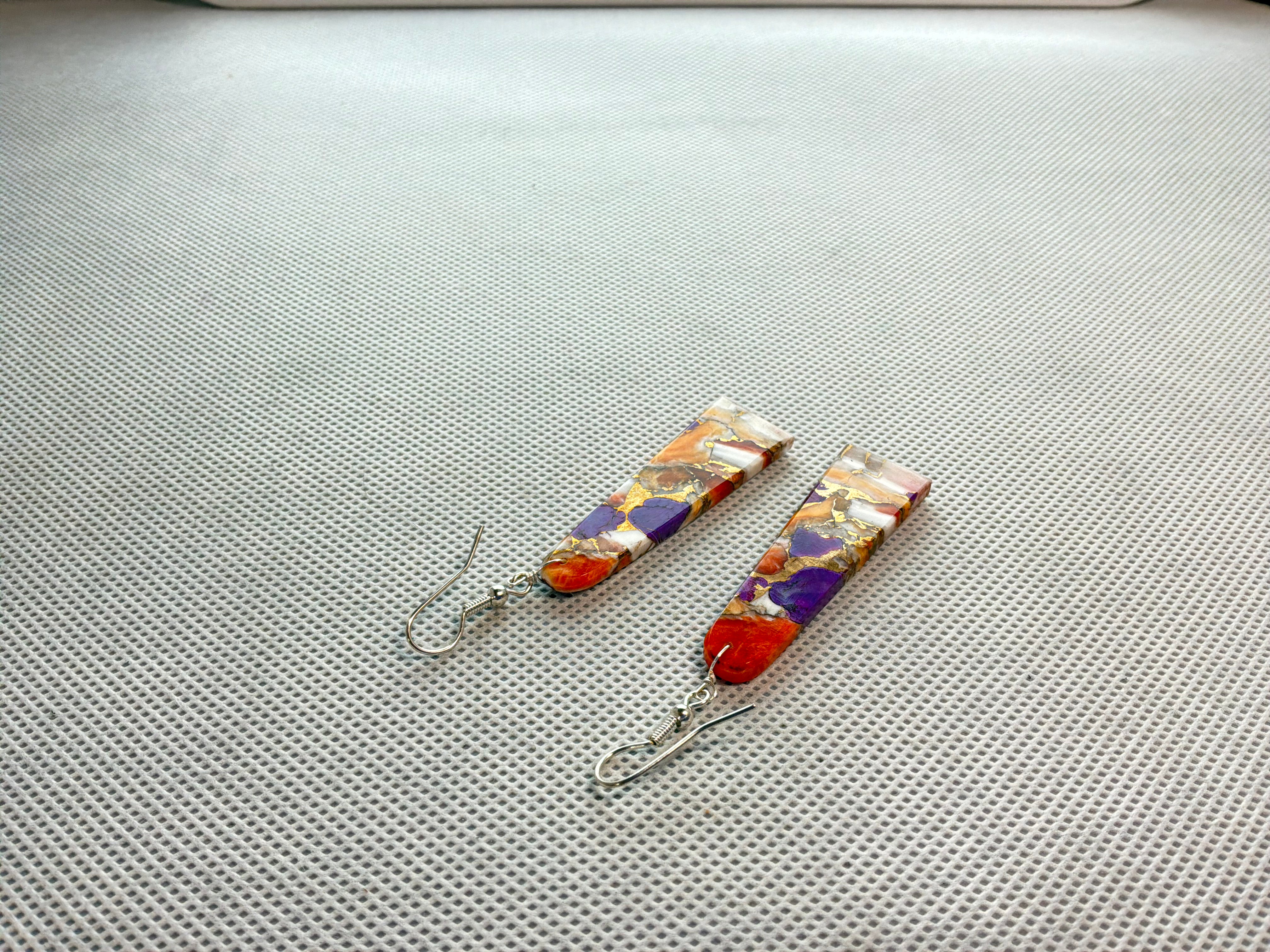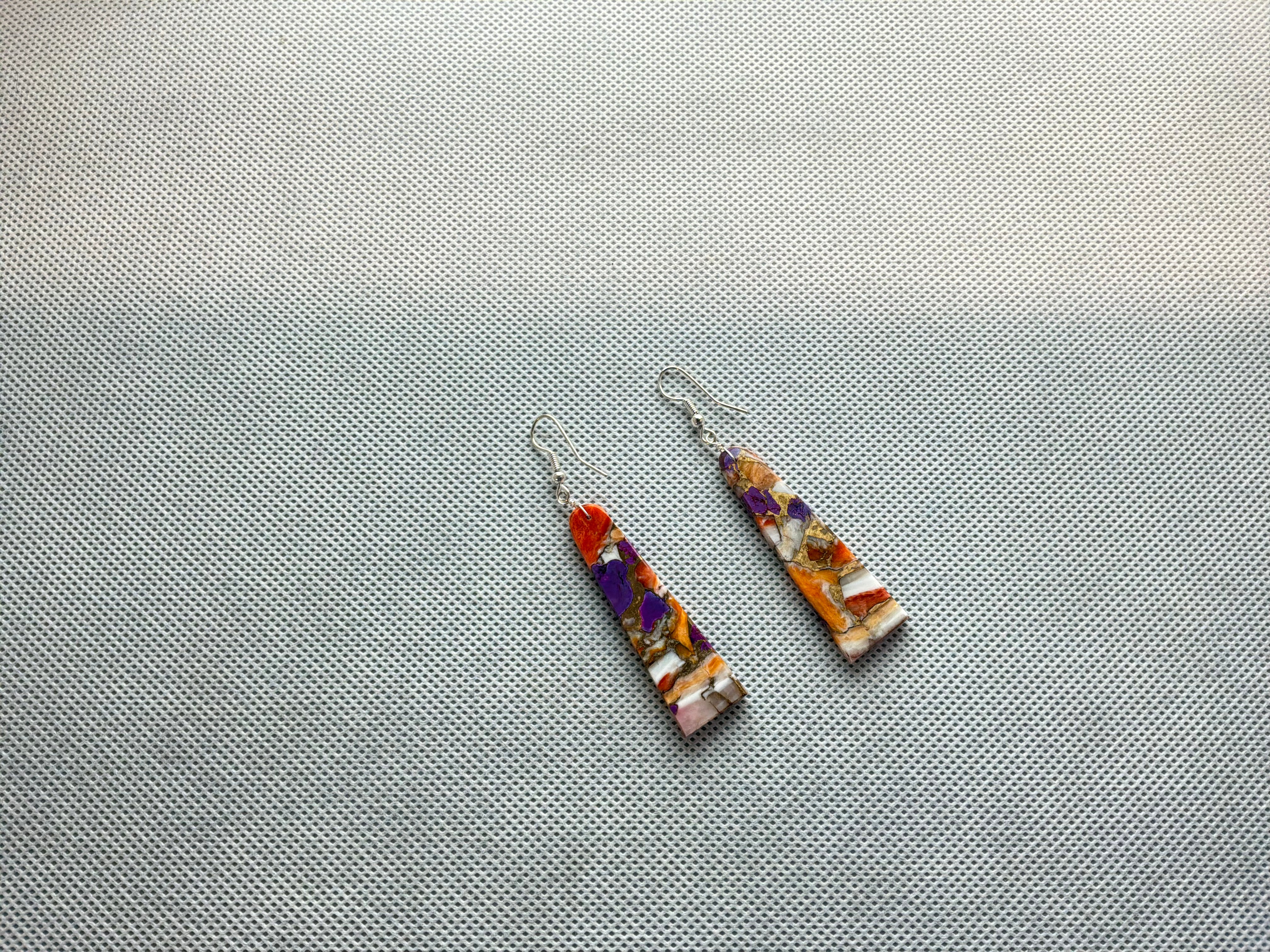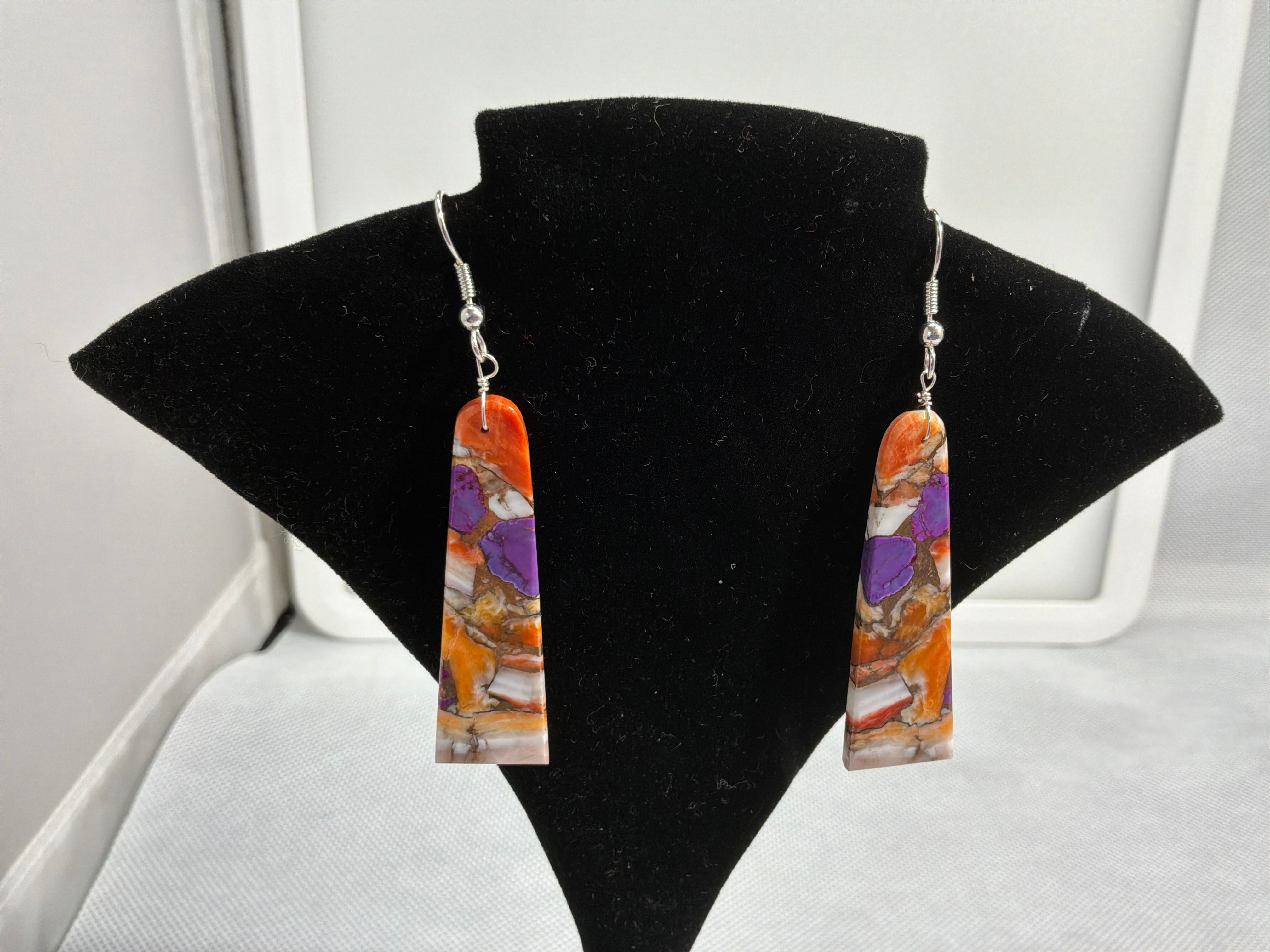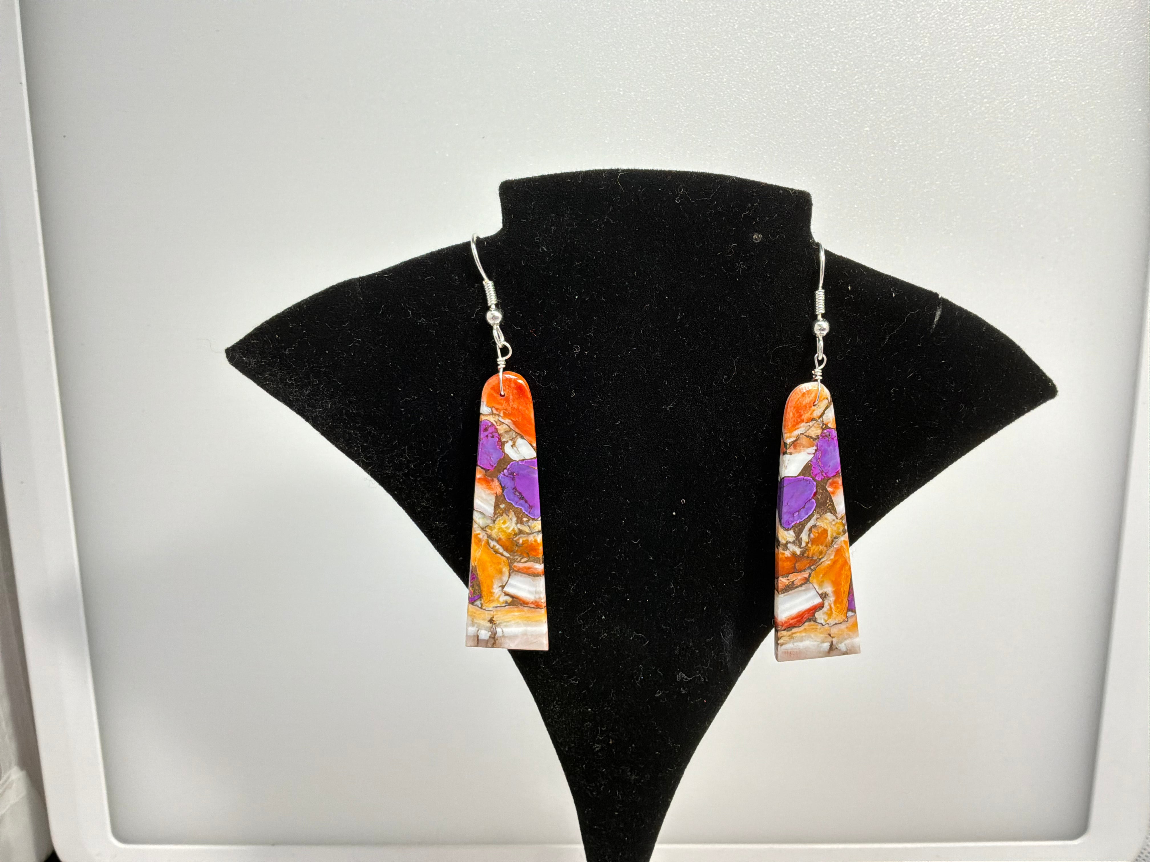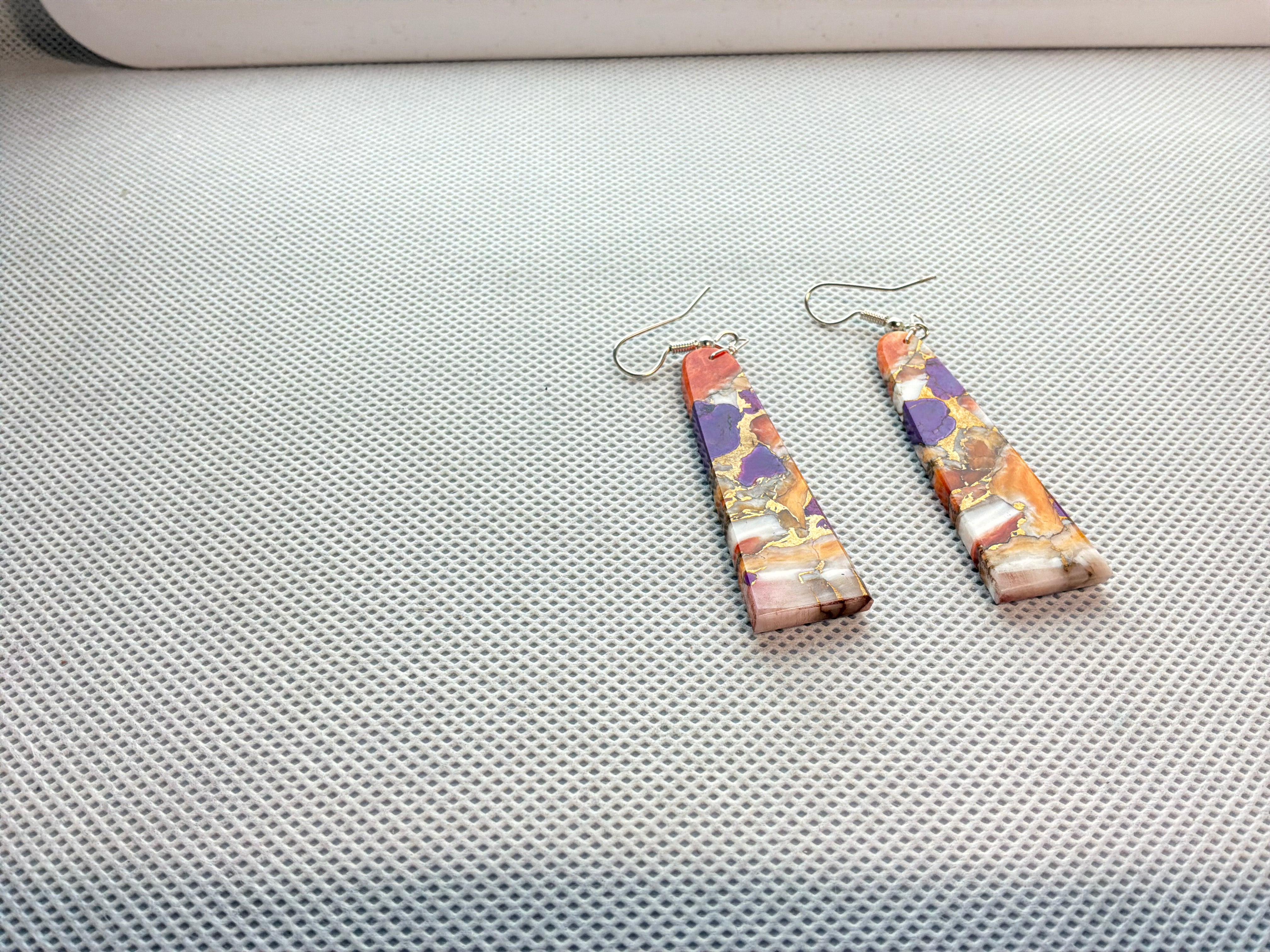 Cultured slab of compressed Turquoise and spiny oyster with bronze cut into earrings. Three inches from top of wire to bottom of earring, approximately 1/2 inch wide and an 1/8 inch wide.