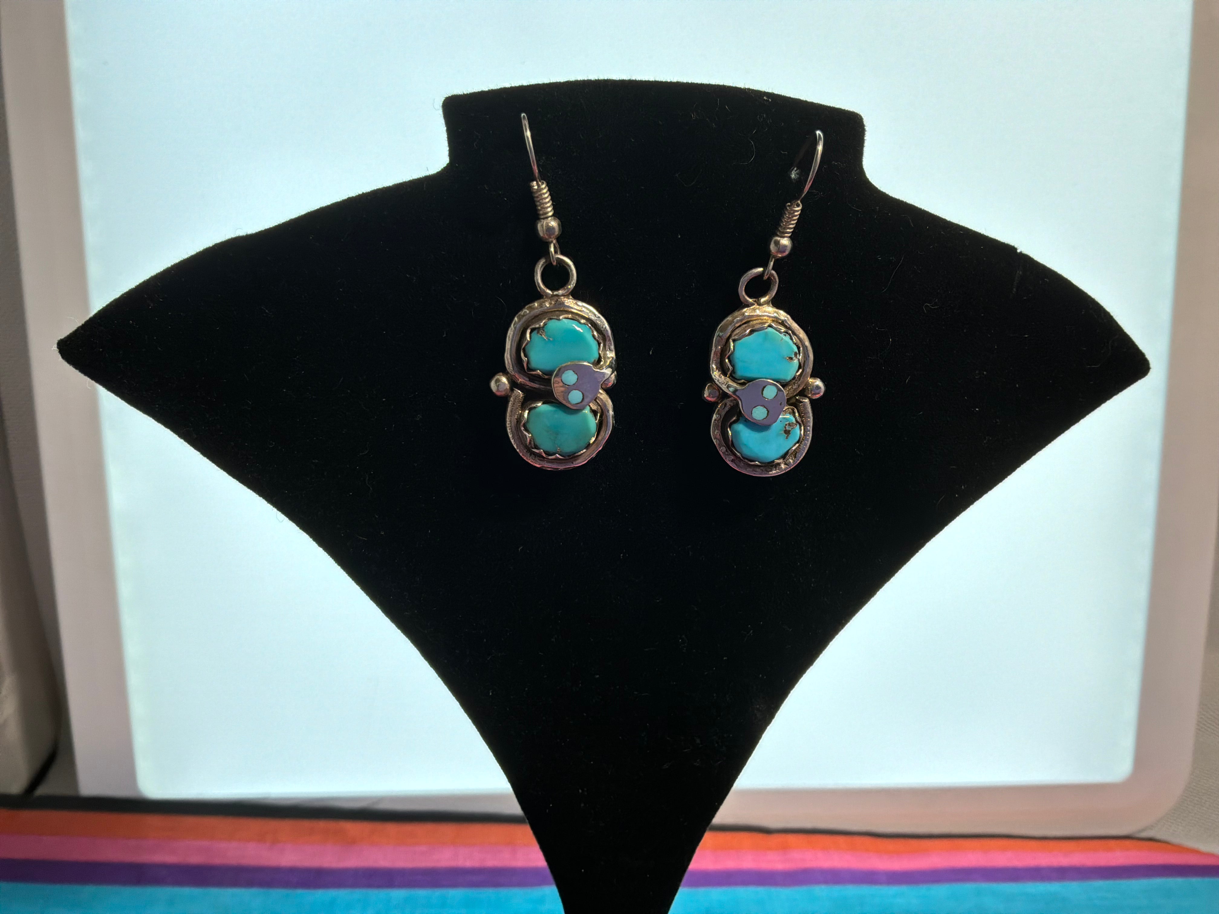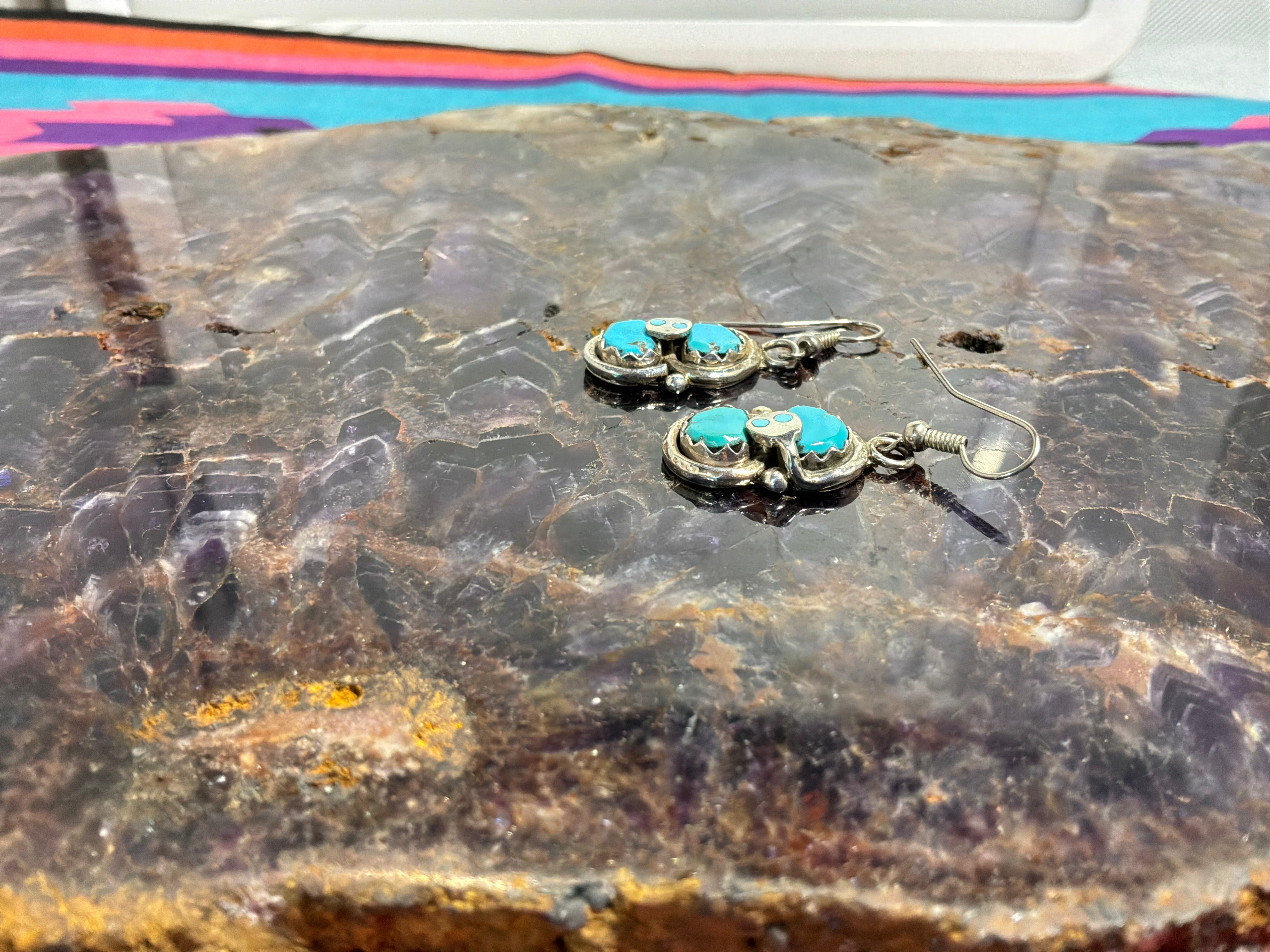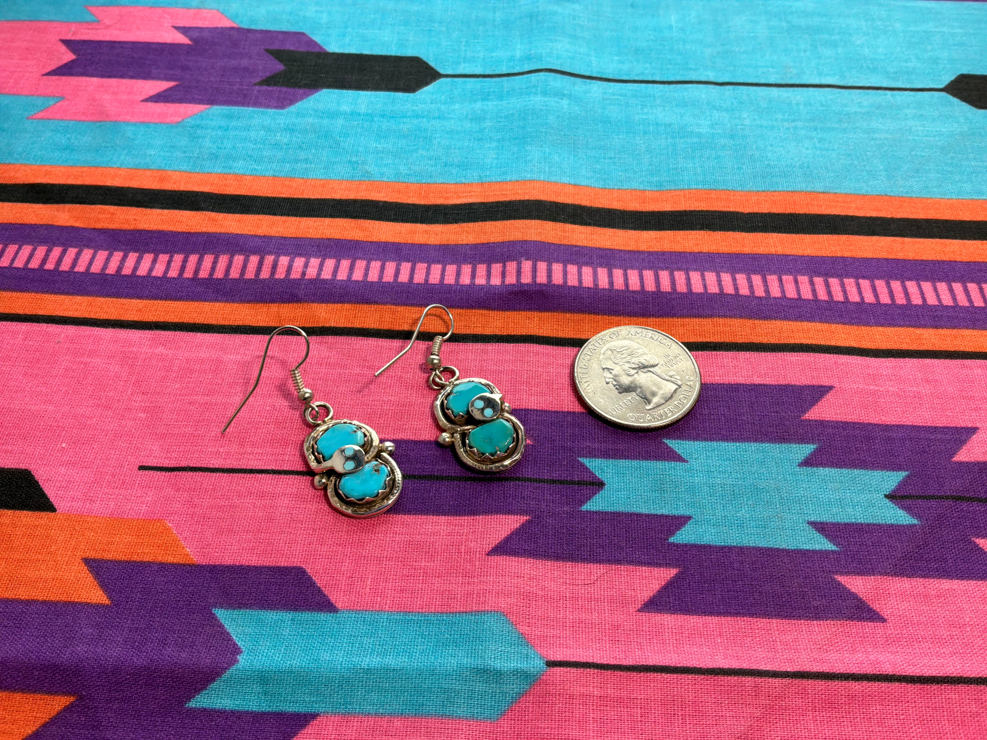 Sterling silver "Effie C" double stone turquoise earrings with the snake. Measurements are 1 3/4" from top of wire to bottom of earring, 1/2 an inch across. Artist Effie C and sterling stamped on back. Effie was an artist from Zuni NM famous for putting the snakes on all her work.