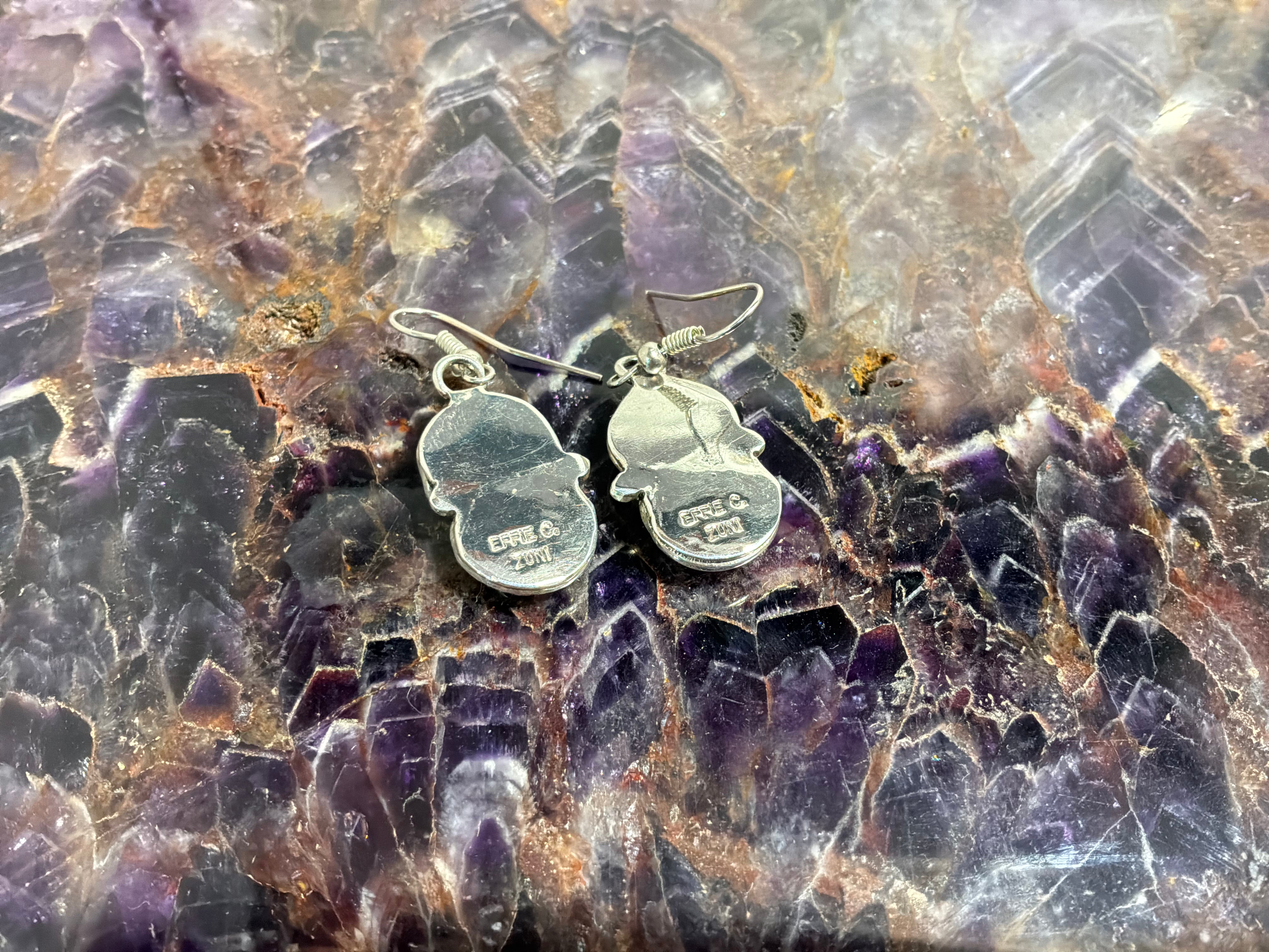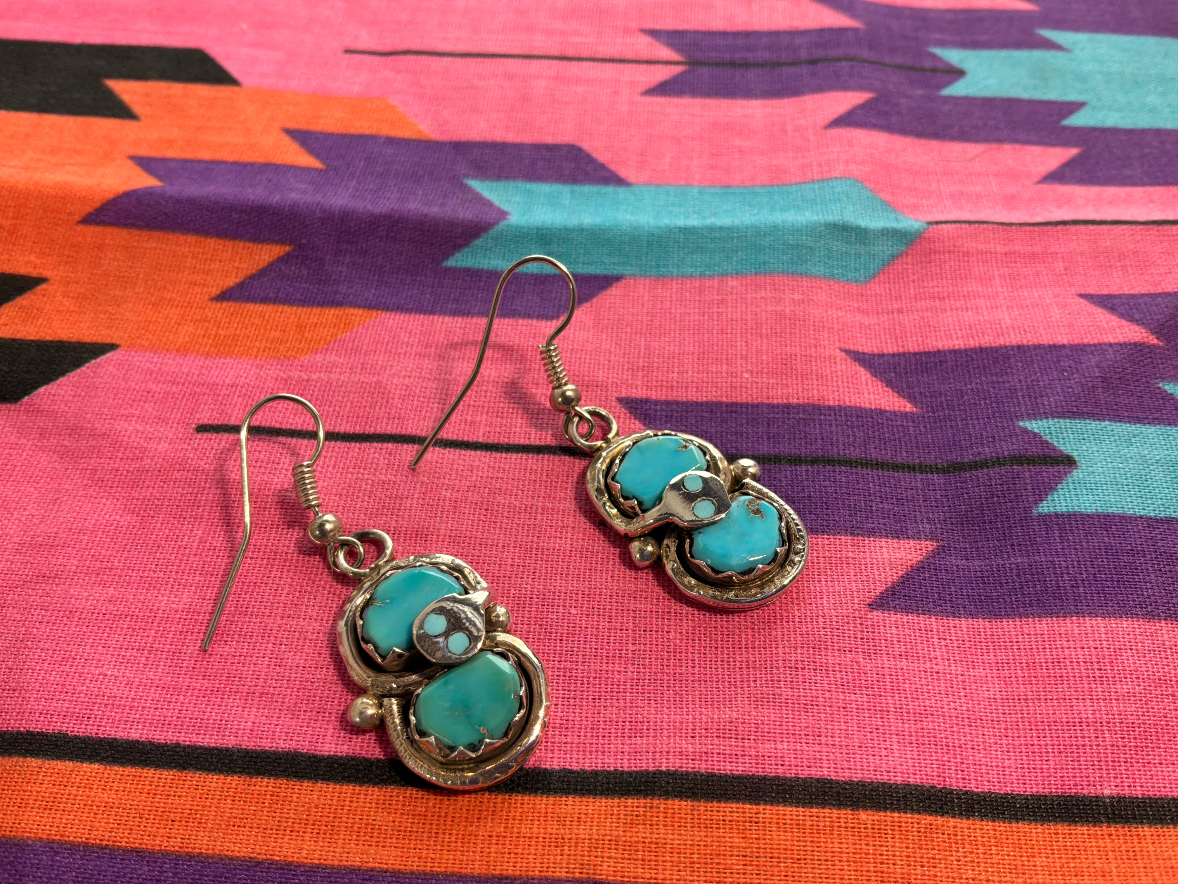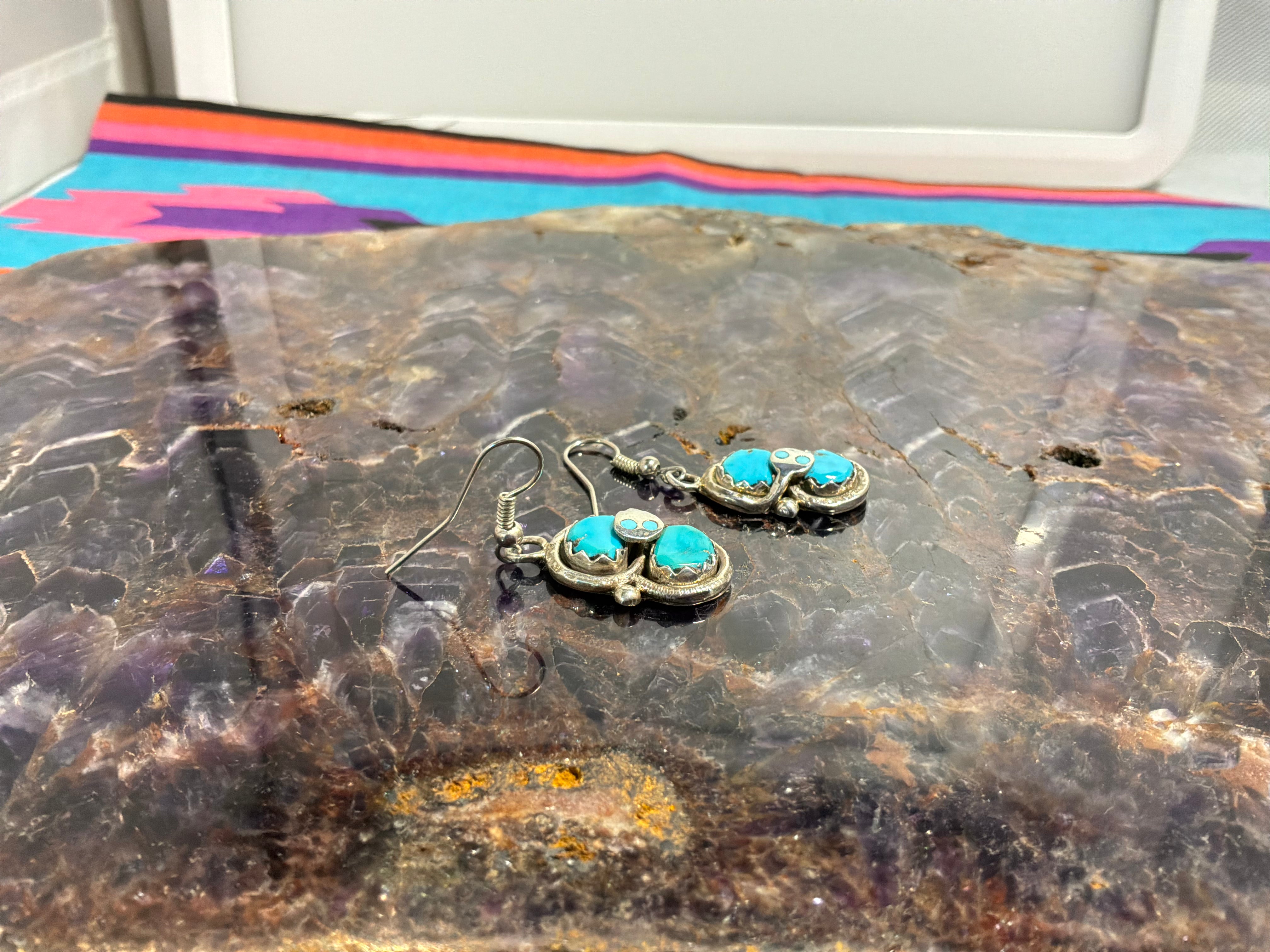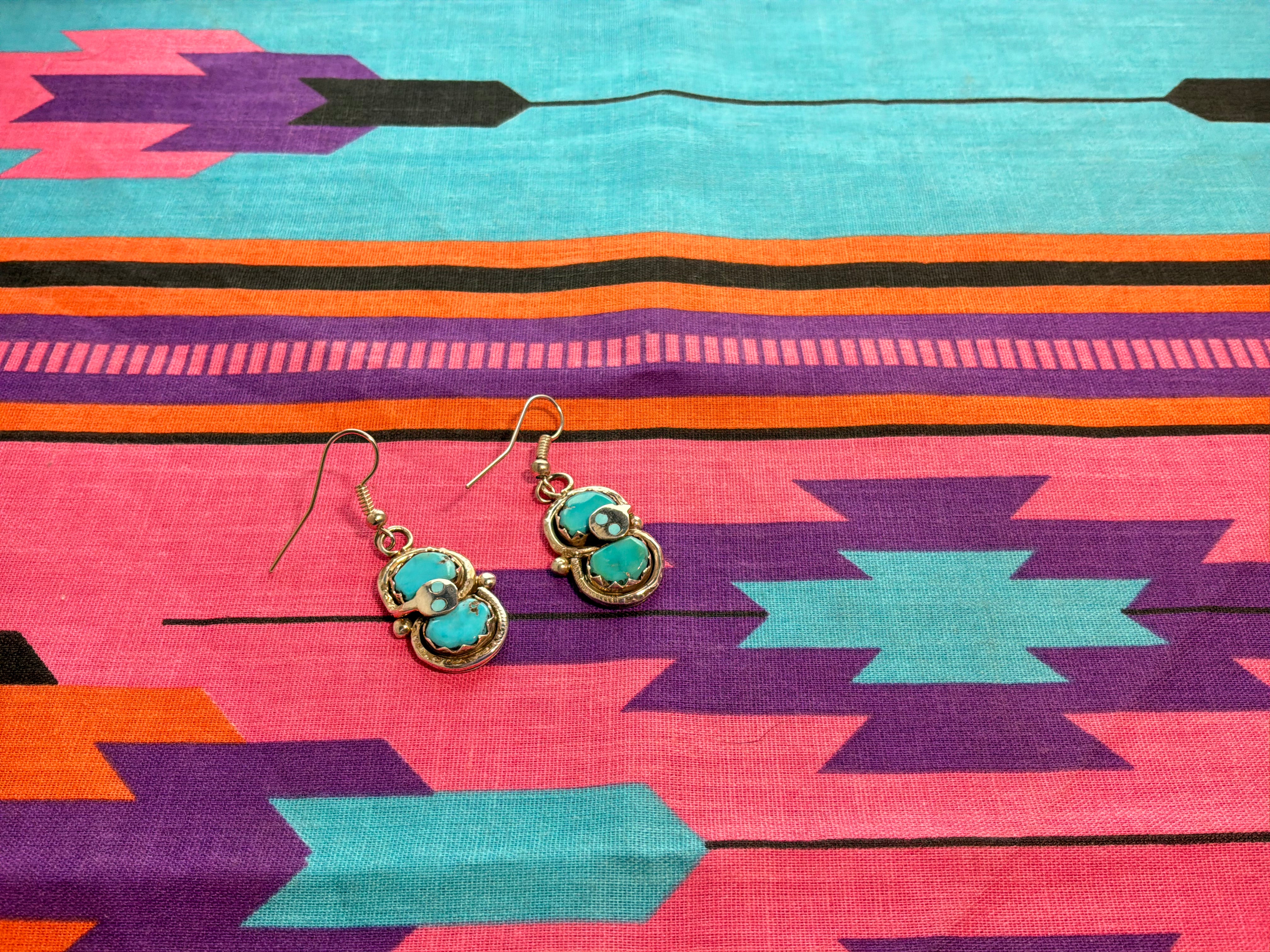 Sterling silver "Effie C" double stone turquoise earrings with the snake. Measurements are 1 3/4" from top of wire to bottom of earring, 1/2 an inch across. Artist Effie C and sterling stamped on back. Effie was an artist from Zuni NM famous for putting the snakes on all her work.