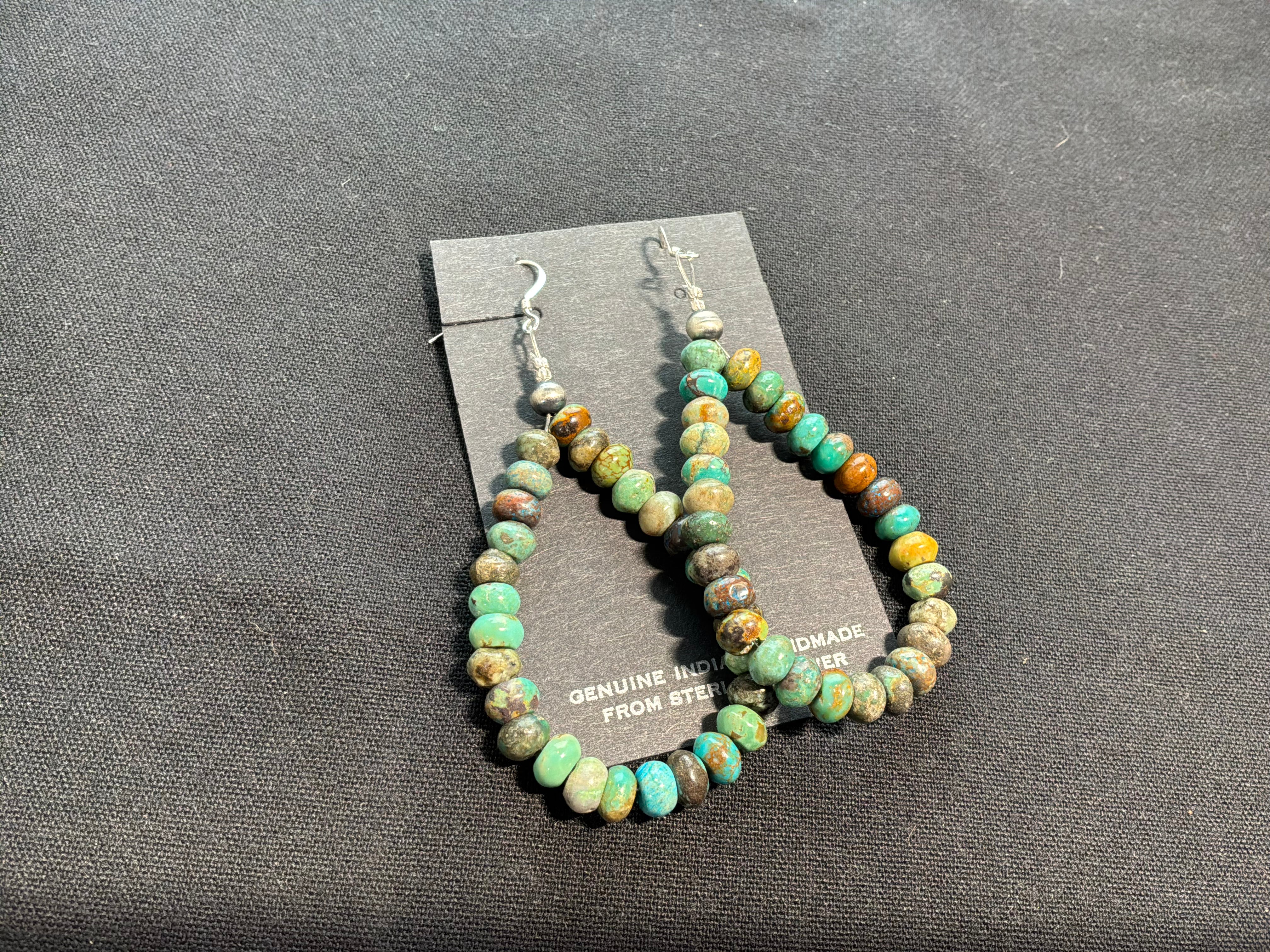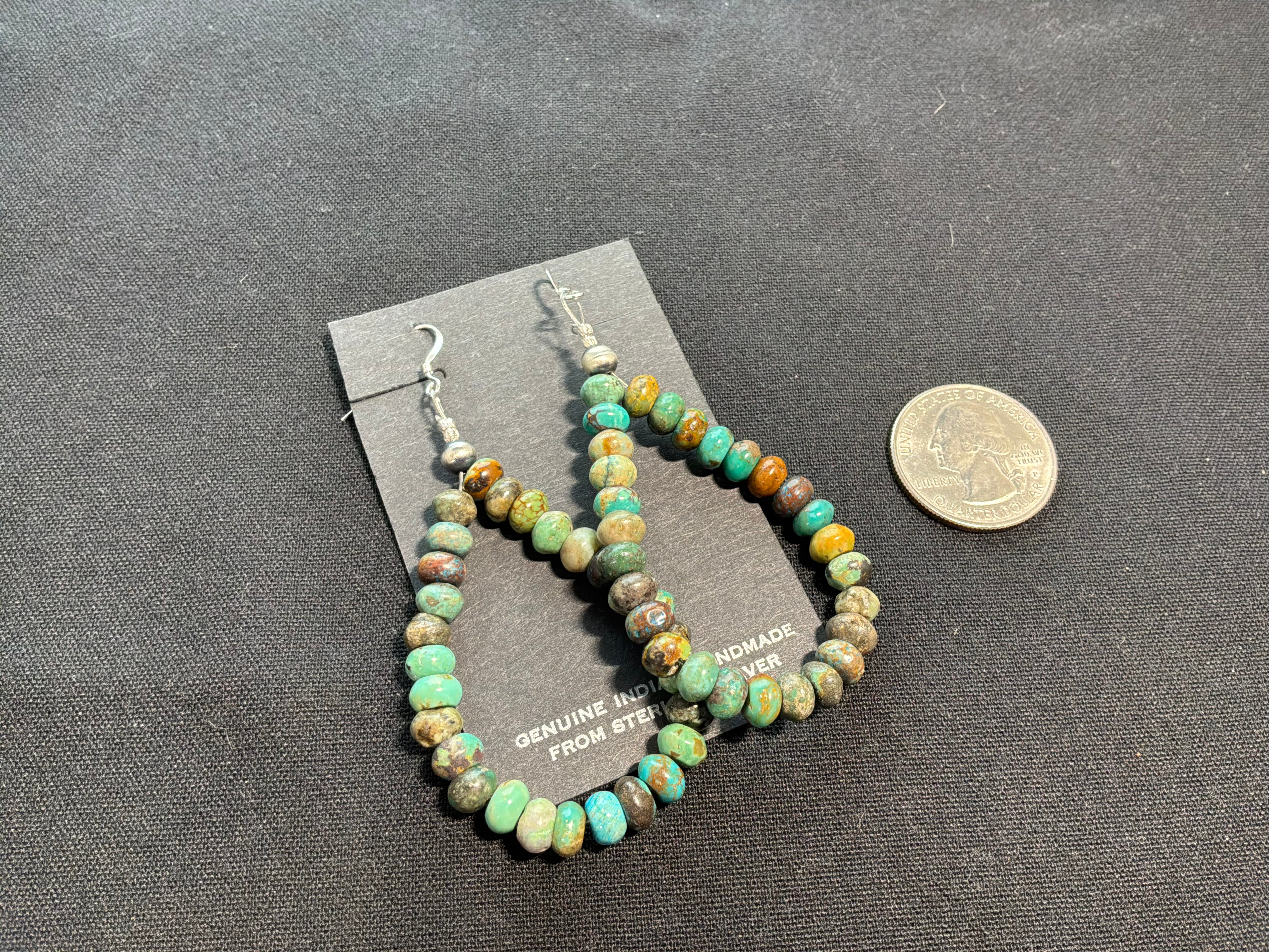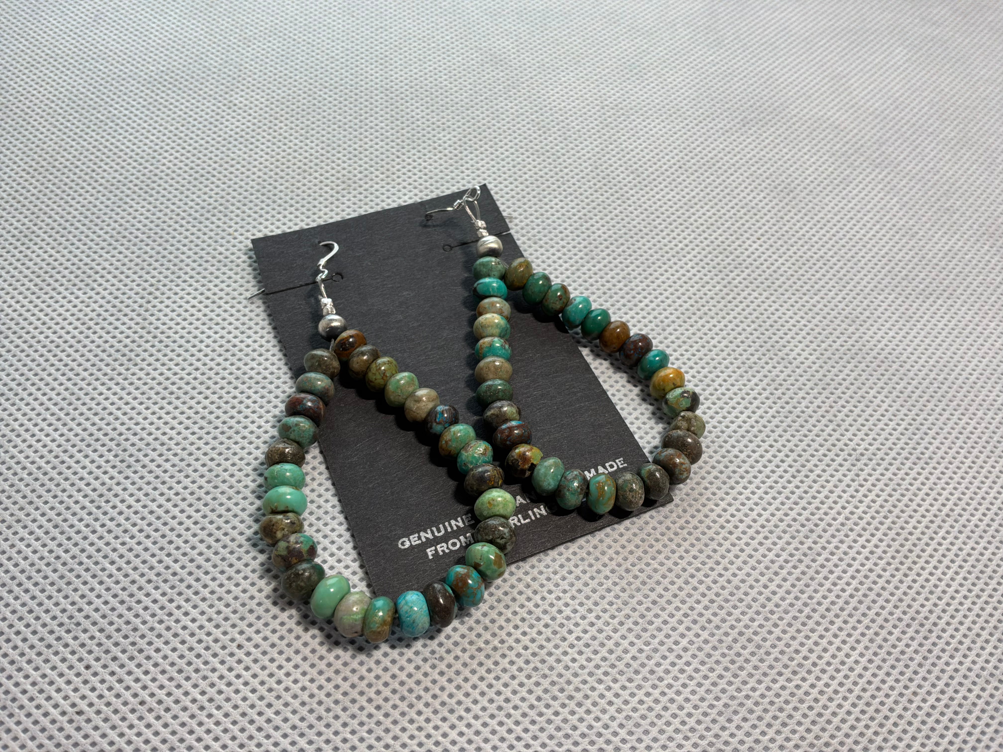 Green Turquoise beads 4mm rondelle beads on metal wire with sterling ear wire. Measuring just over 3 inches from top of wire to bottom of earring and 1 1/2" across at the widest.