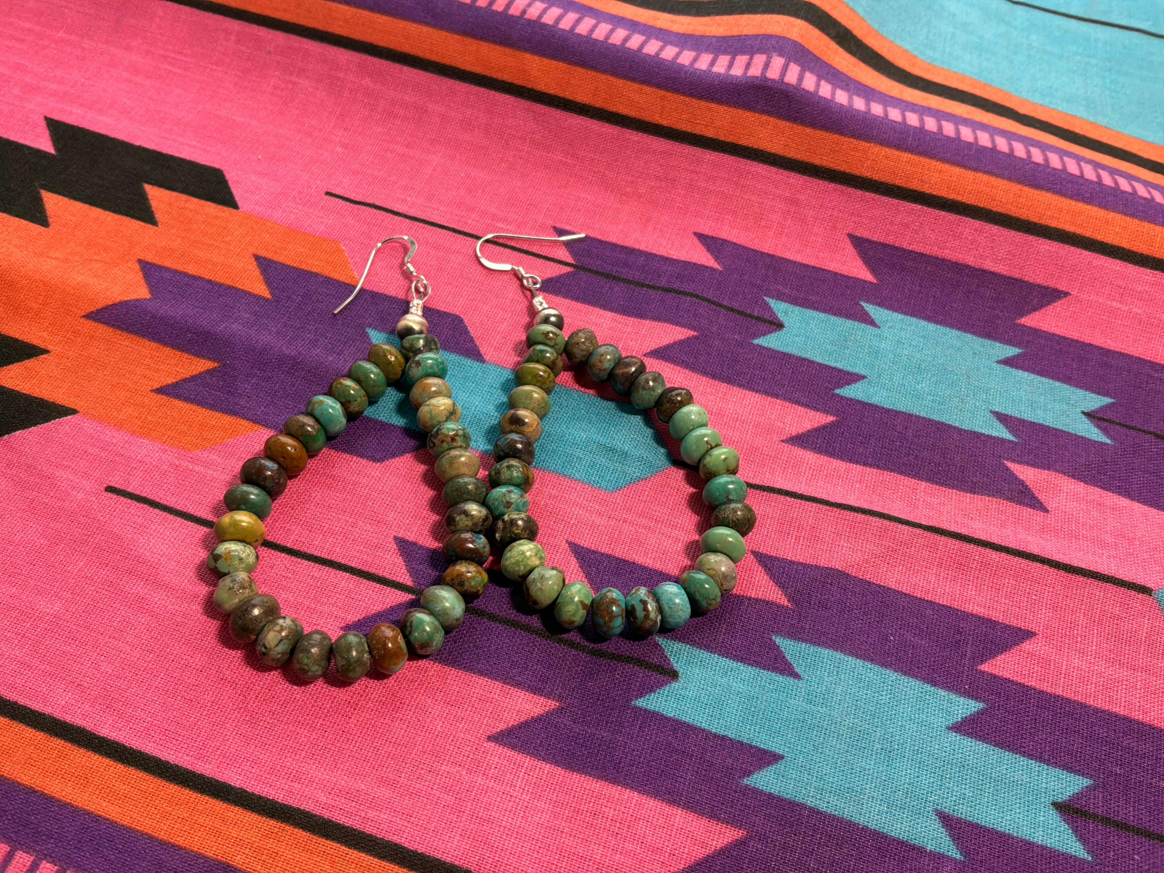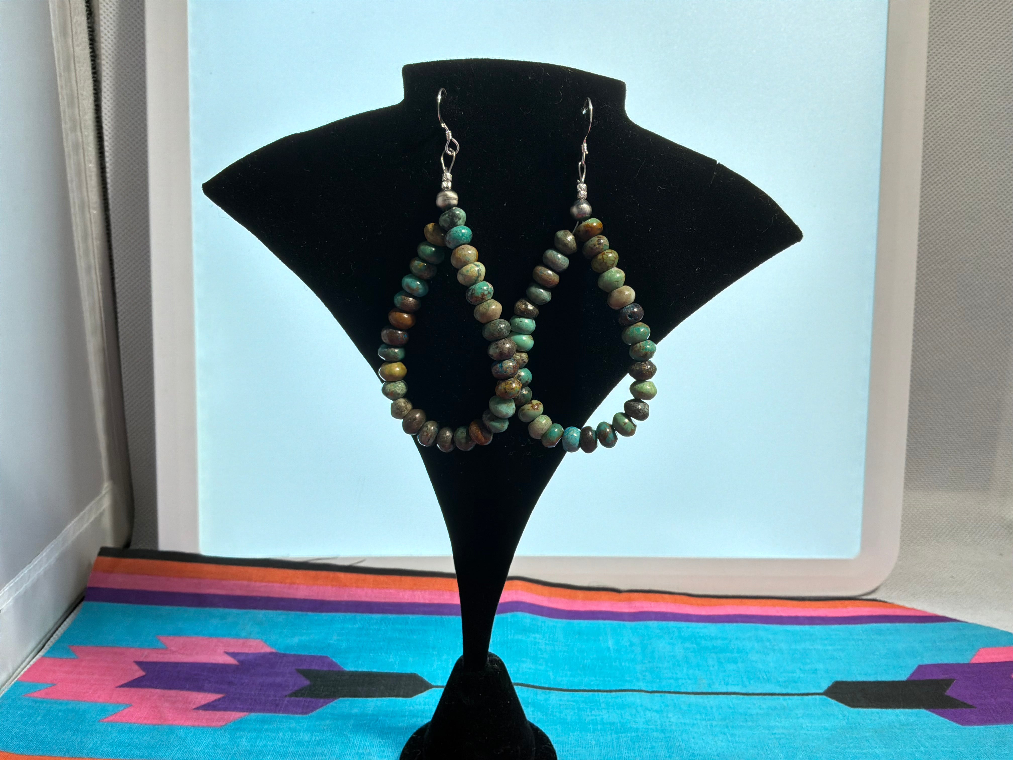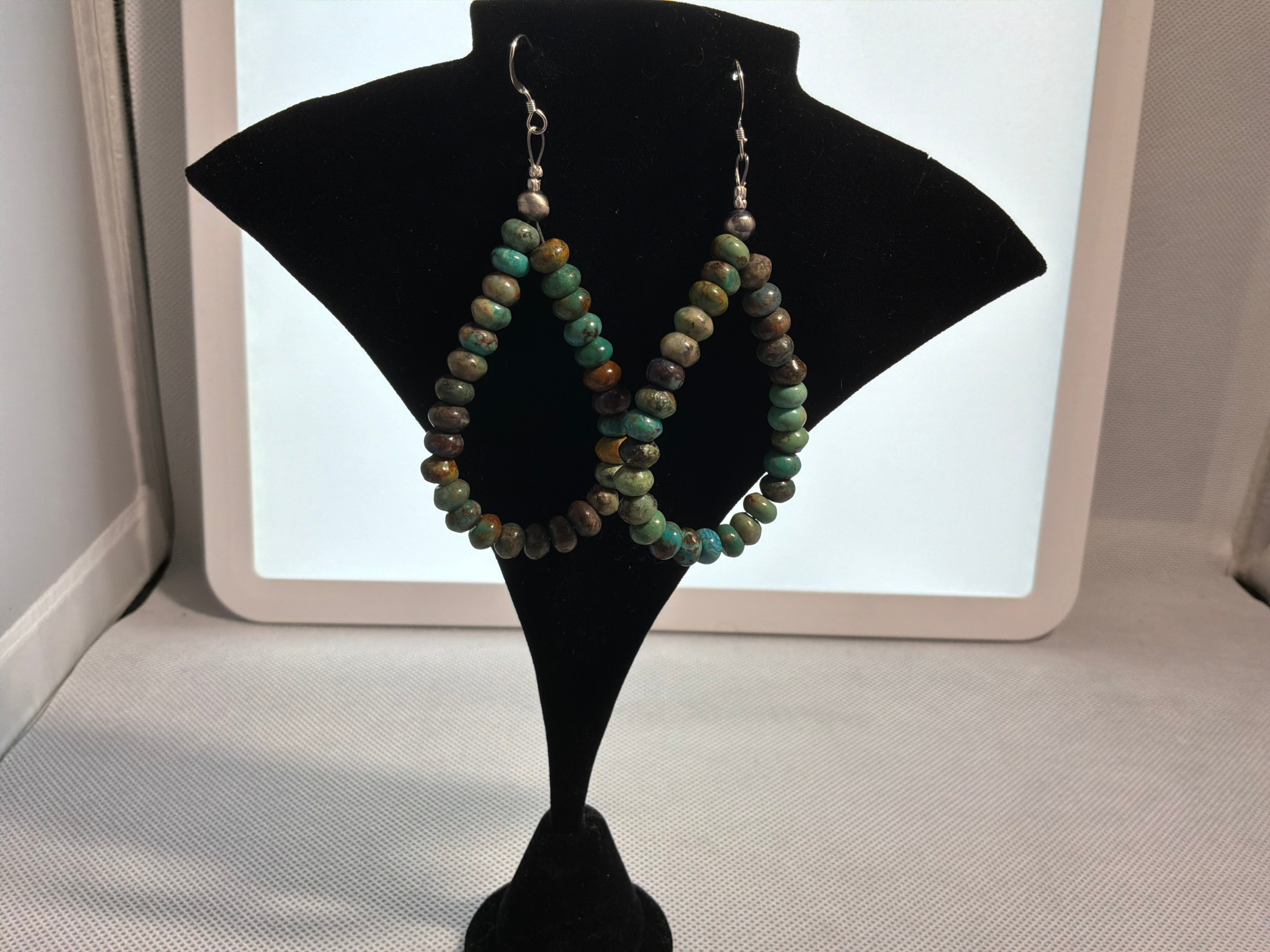 Green Turquoise beads 4mm rondelle beads on metal wire with sterling ear wire. Measuring just over 3 inches from top of wire to bottom of earring and 1 1/2" across at the widest.