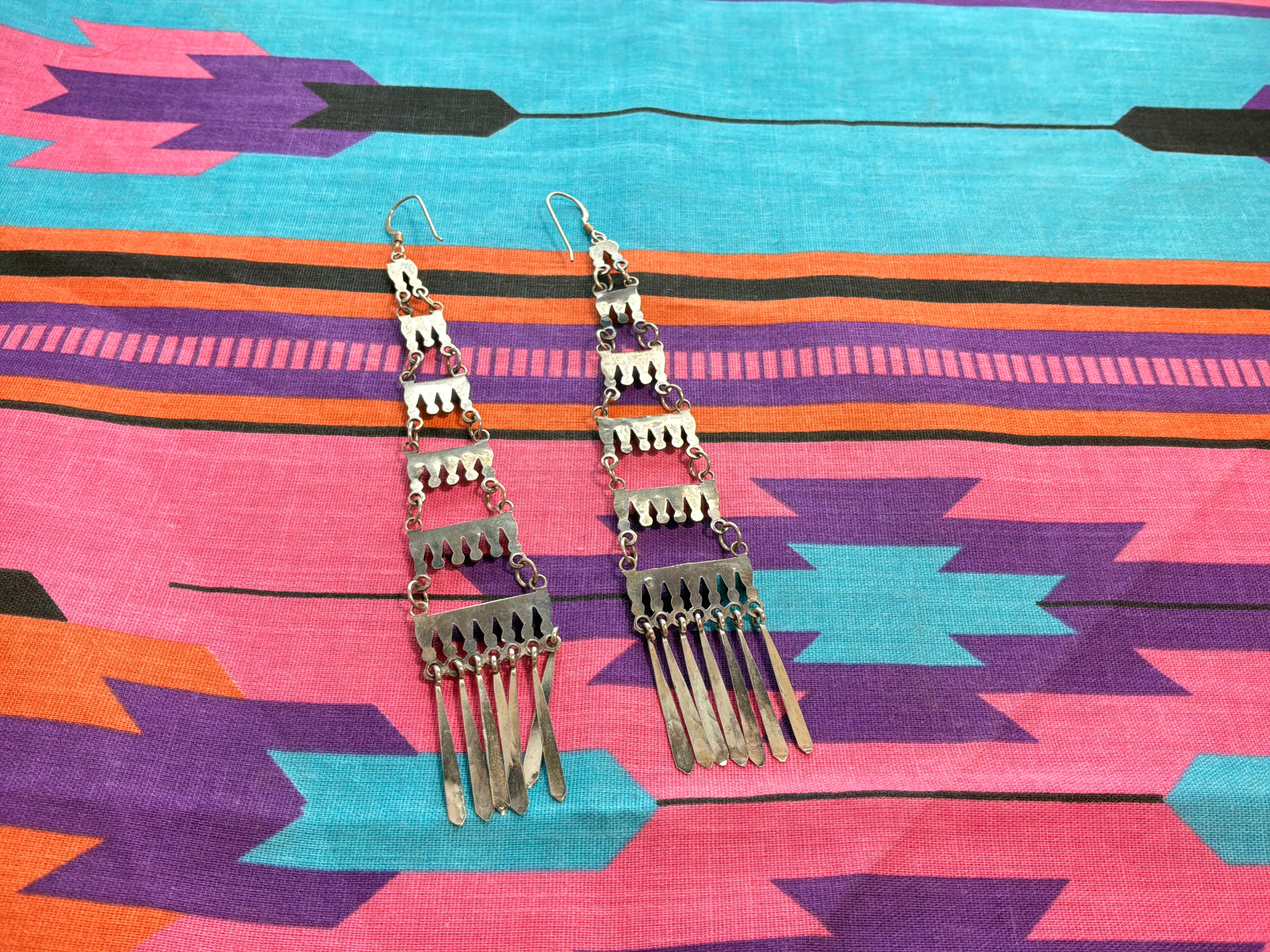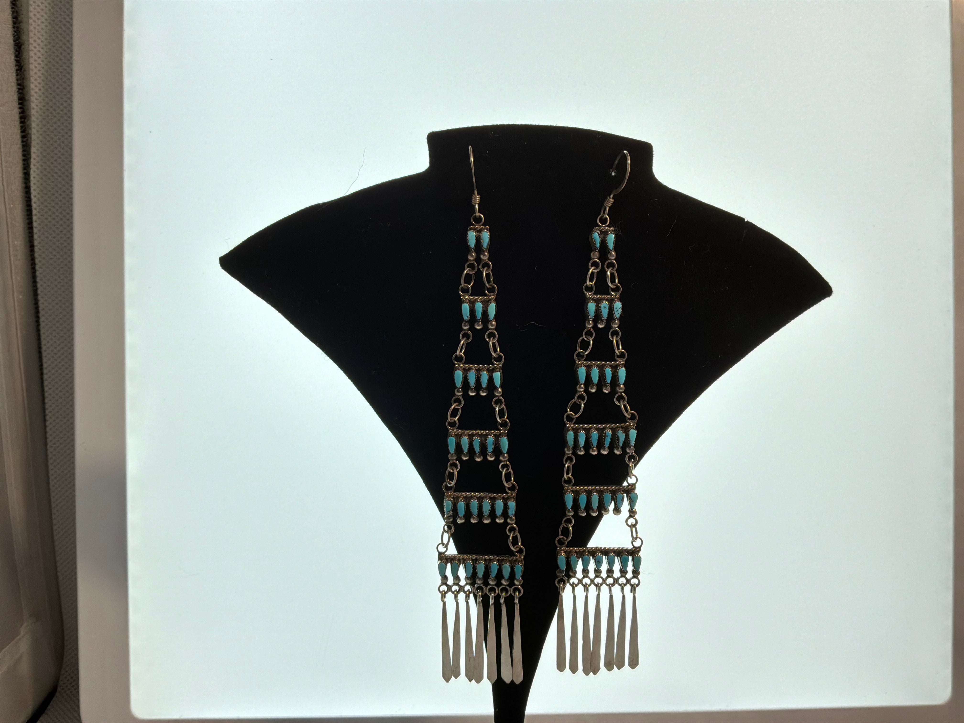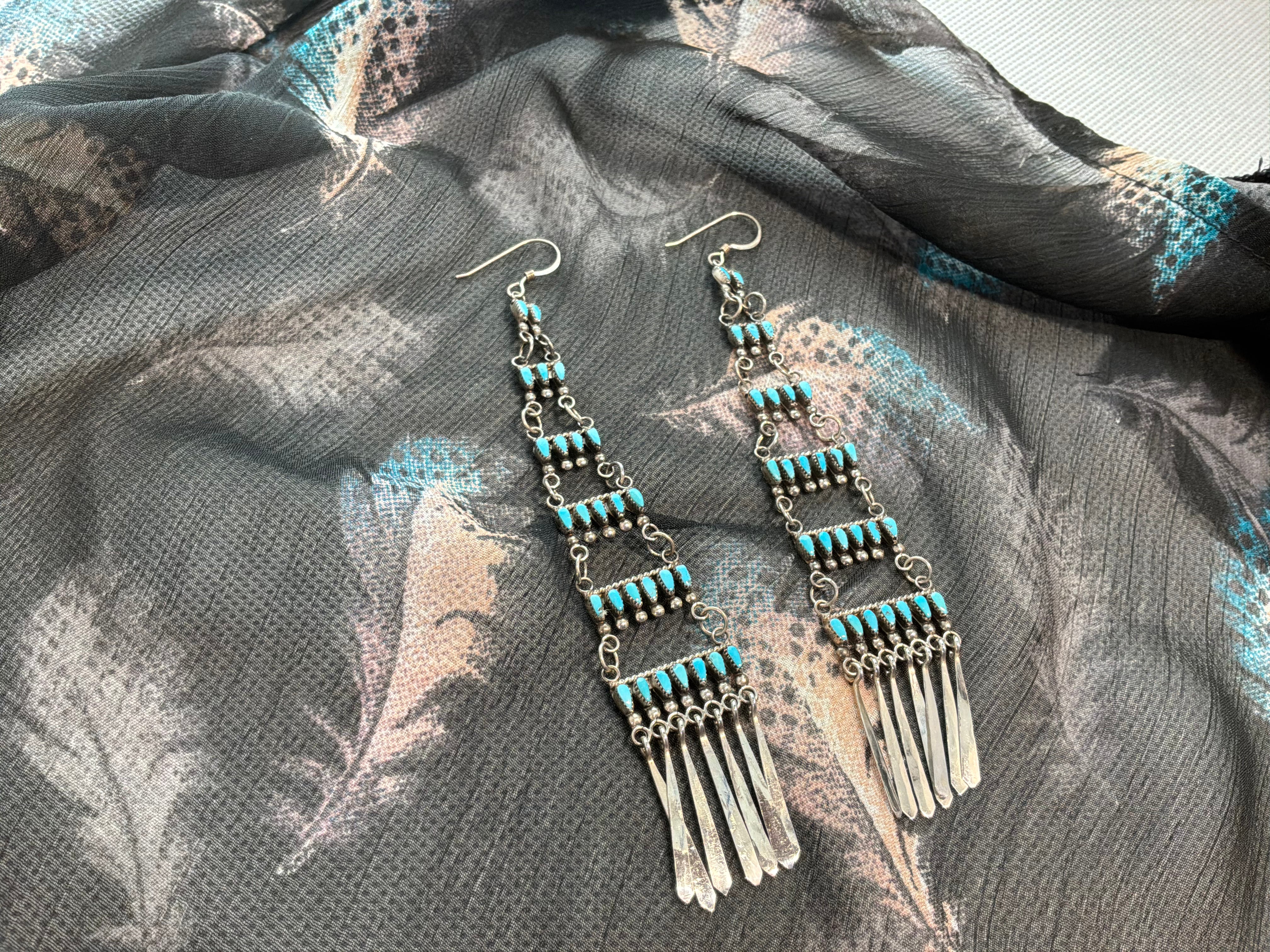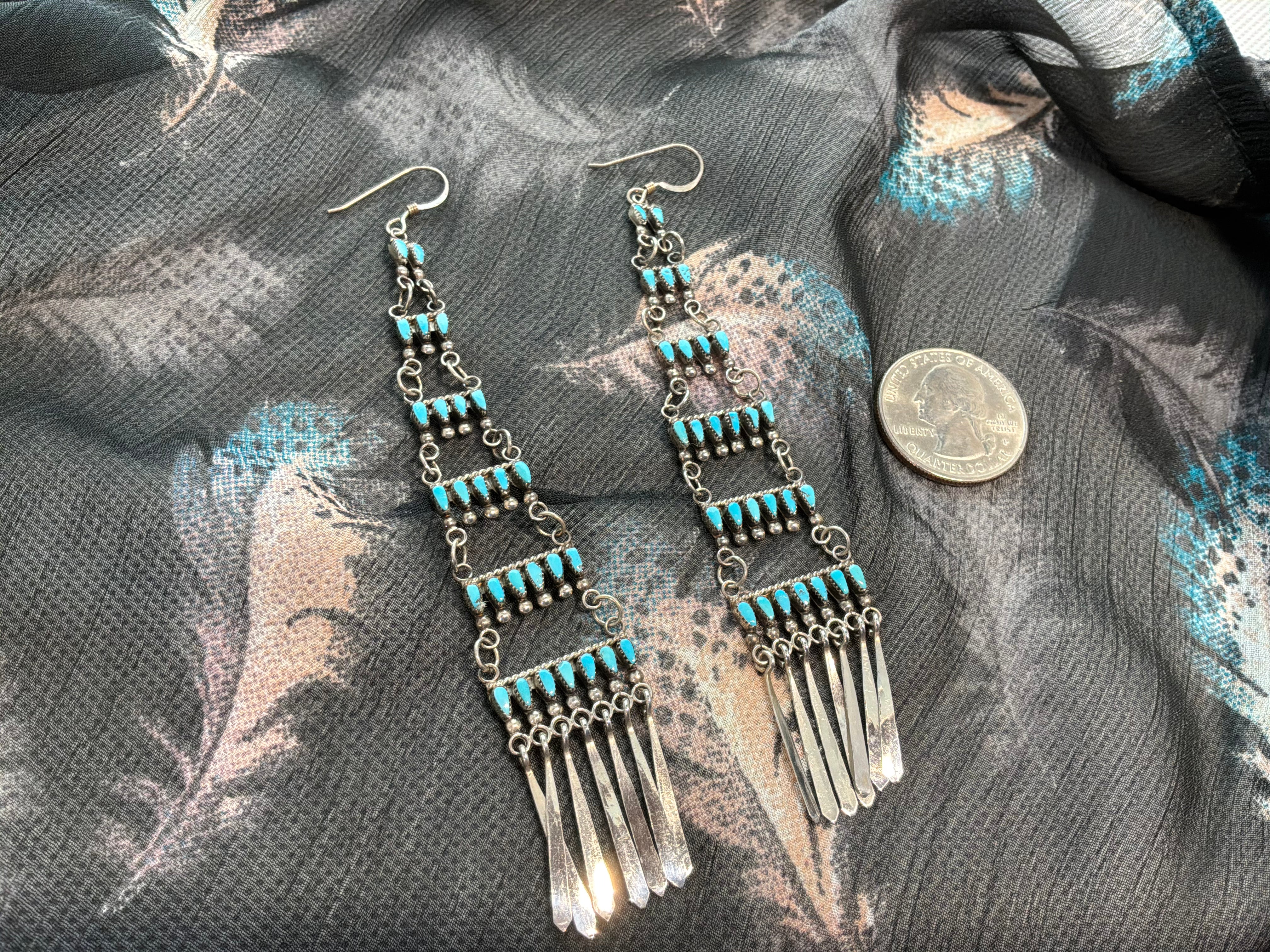 Sterling silver turquoise needle point earrings. Measurements are 5 inches from top of wire to bottom of earring, and graduated in width to an inch across at the bottom.
