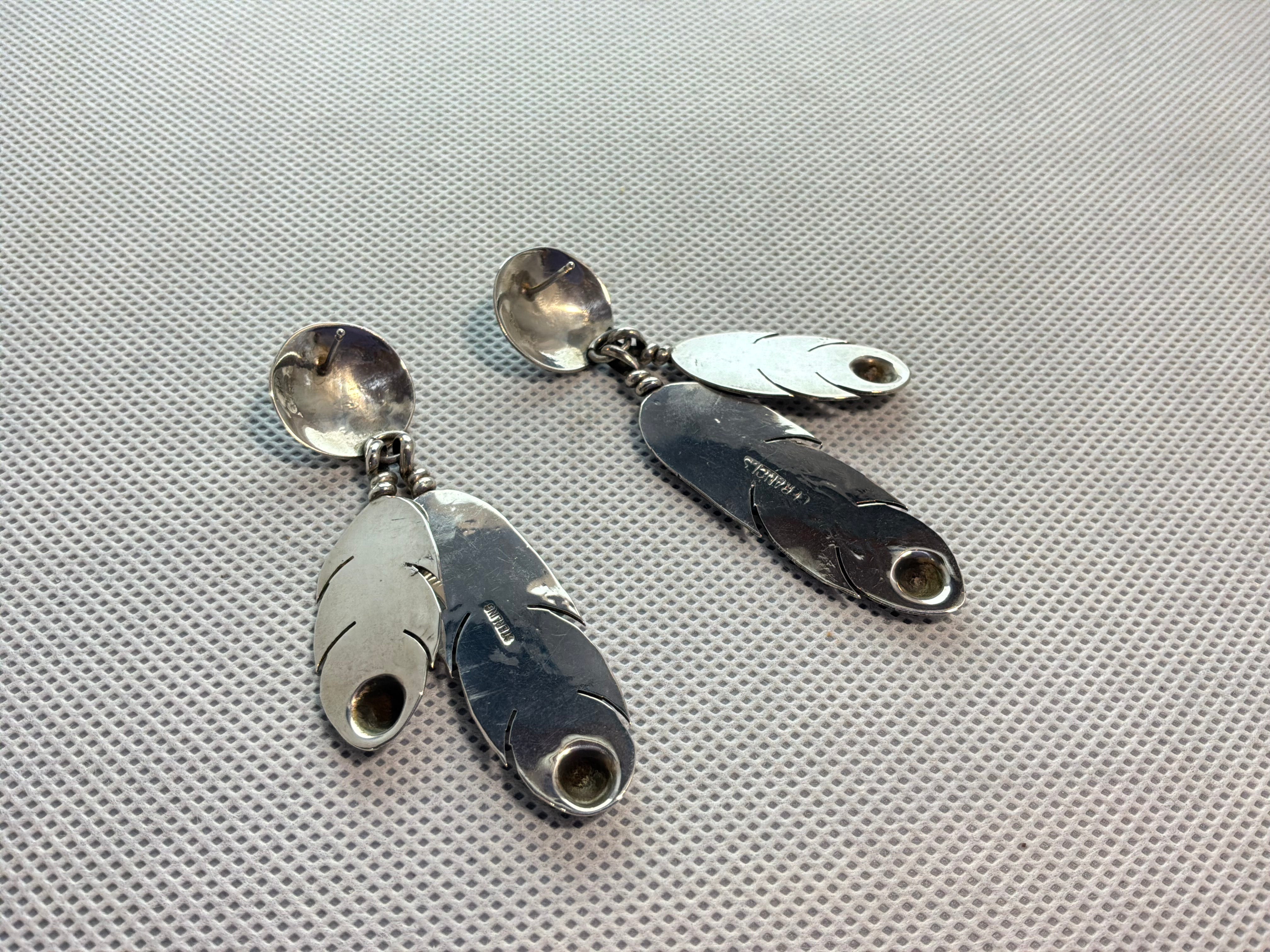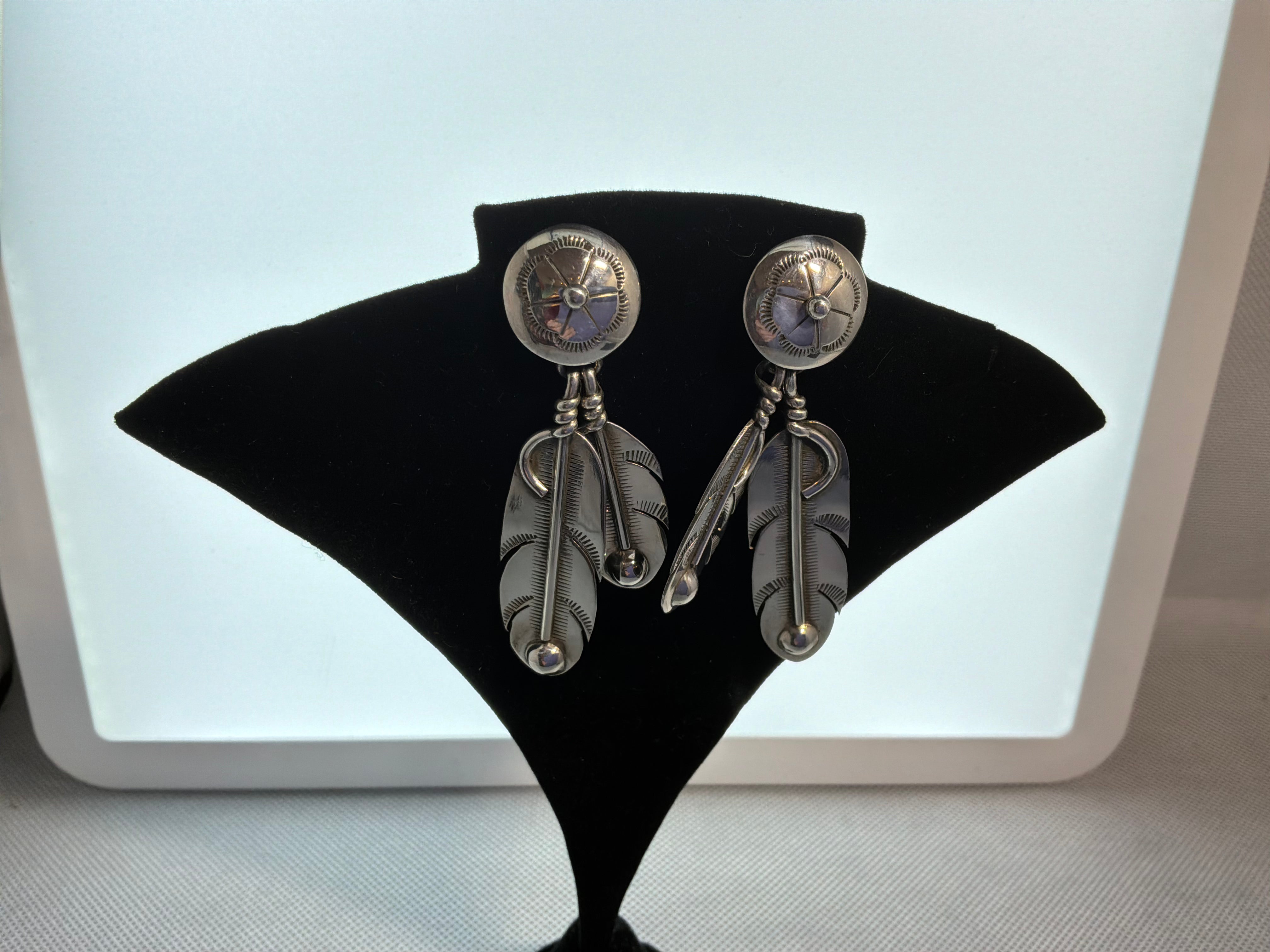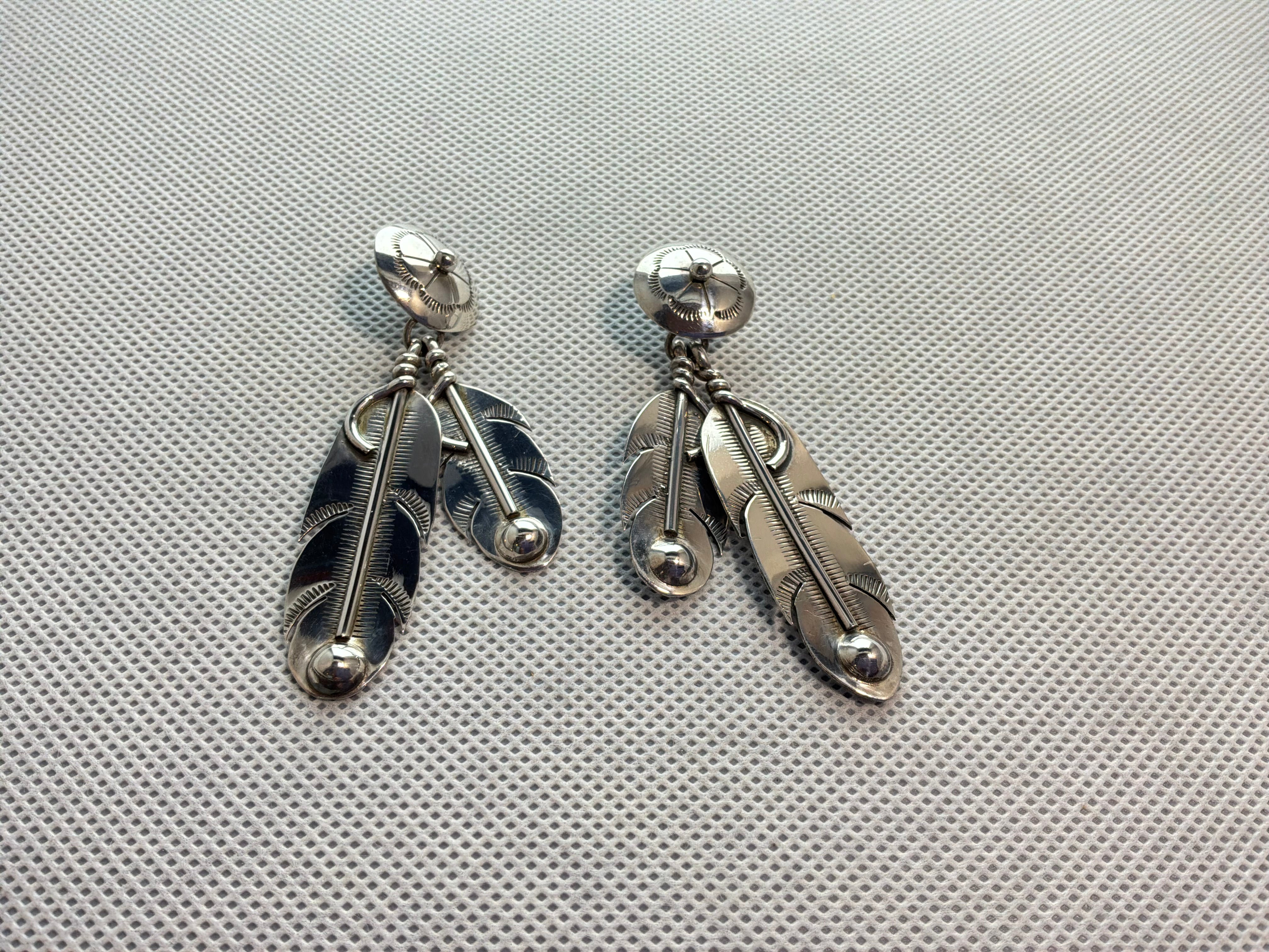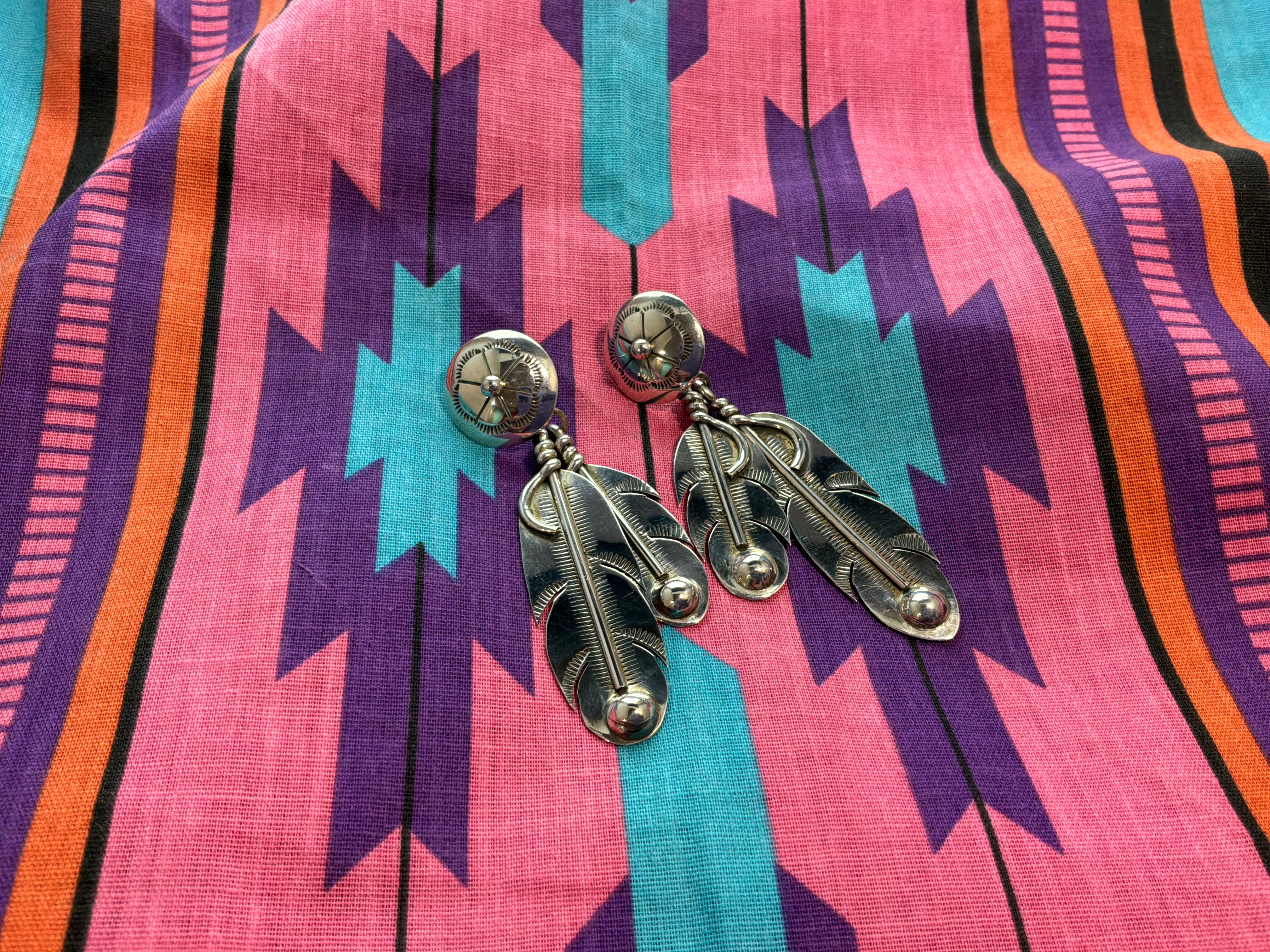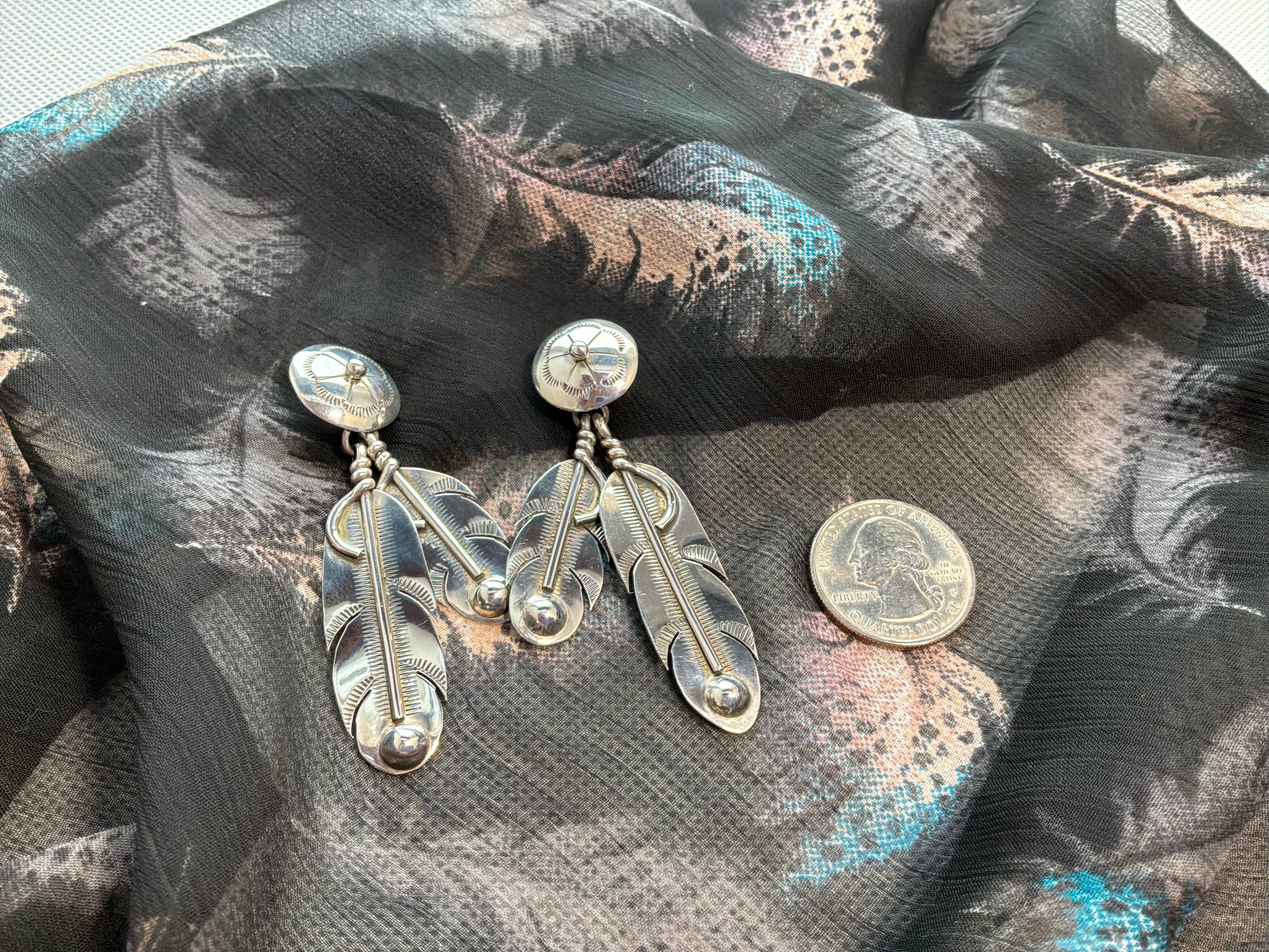 Sterling silver post earrings with concho on post and two feathers of different lengths. Measuring 3 inches from top of earring to bottom of longest feather. Concho is 3/4" across, feathers are 1 1/2" and 2 1/4" in length and 5/16" across. Sterling is stamped on back of feather.