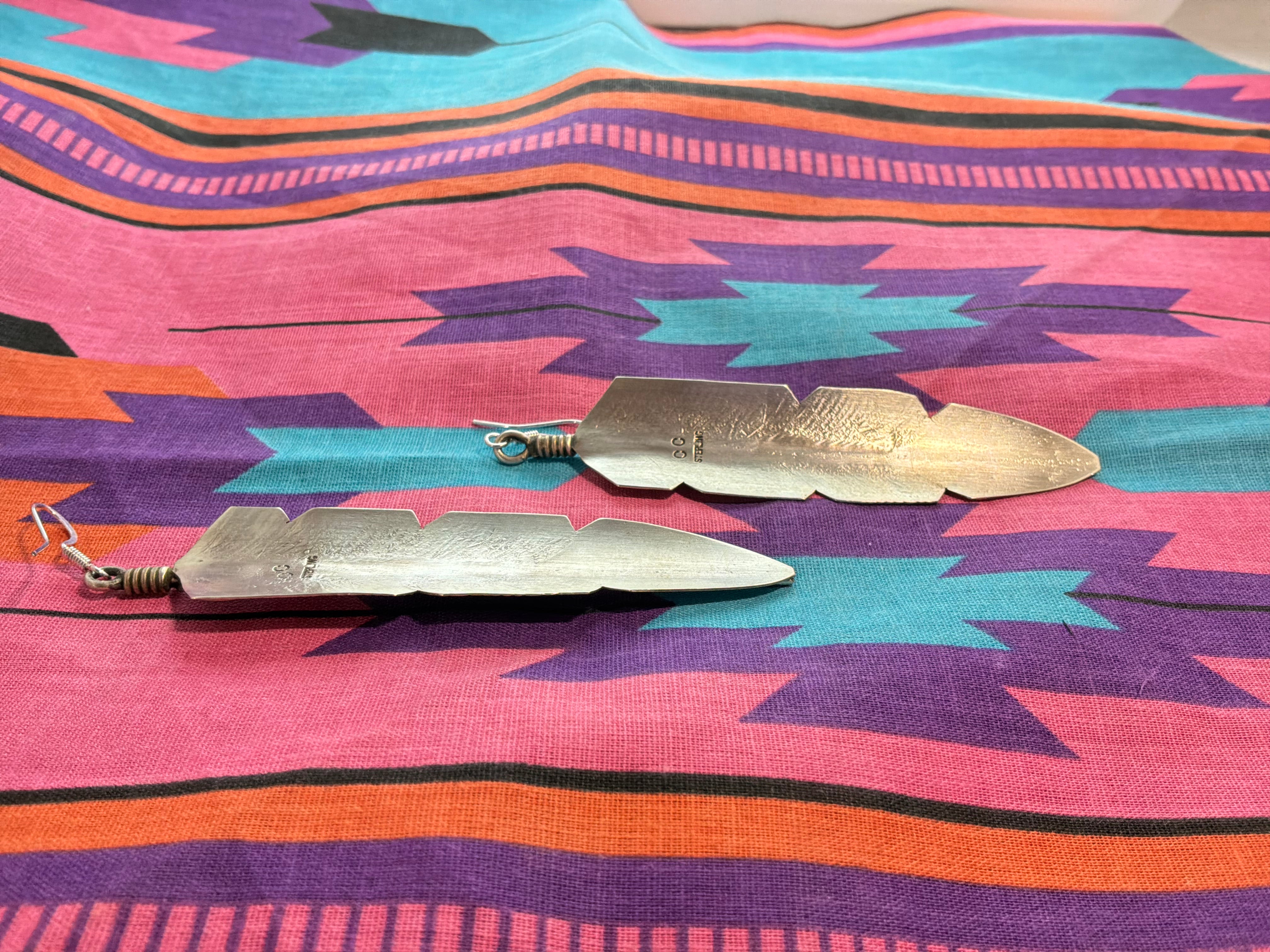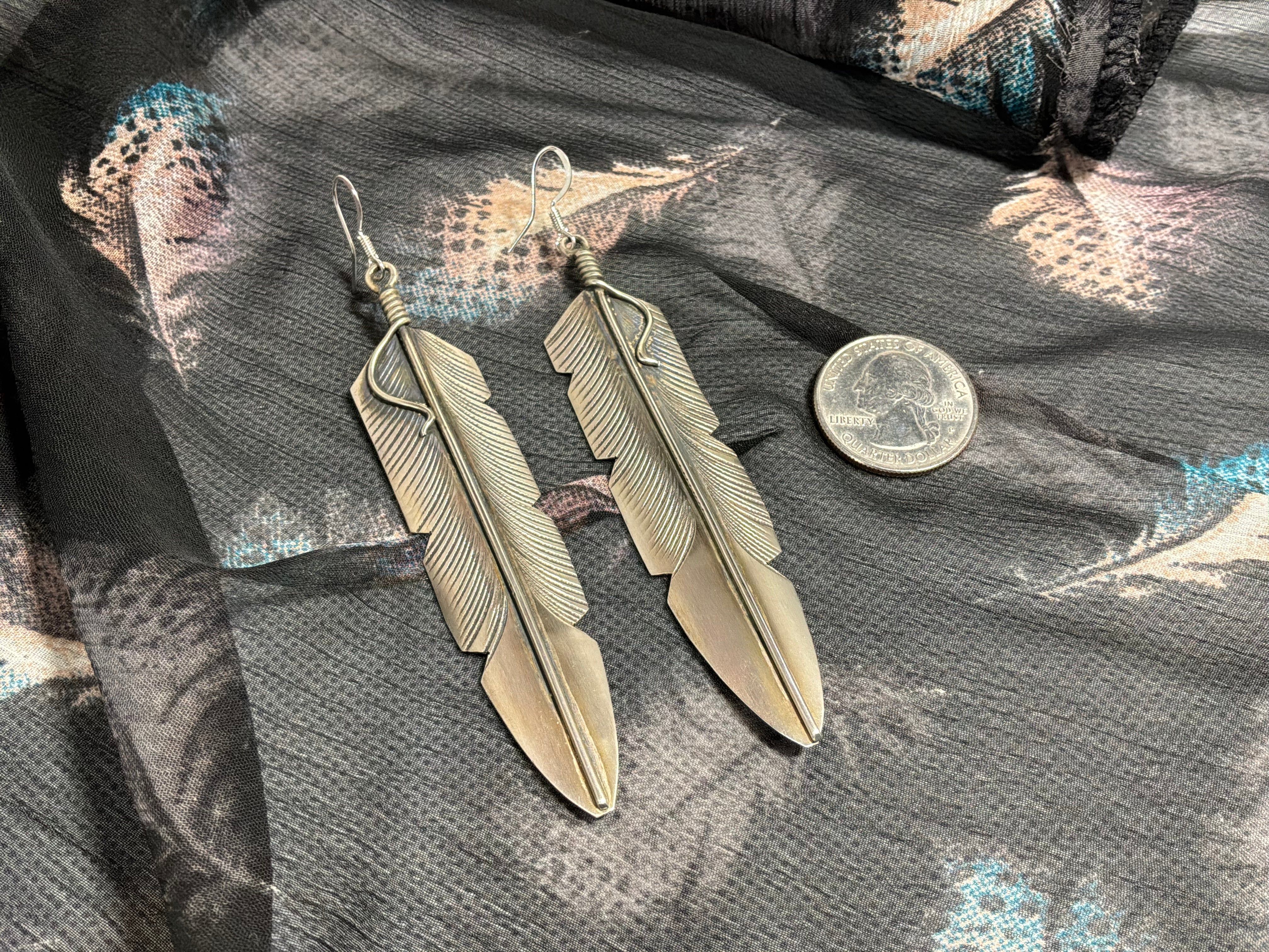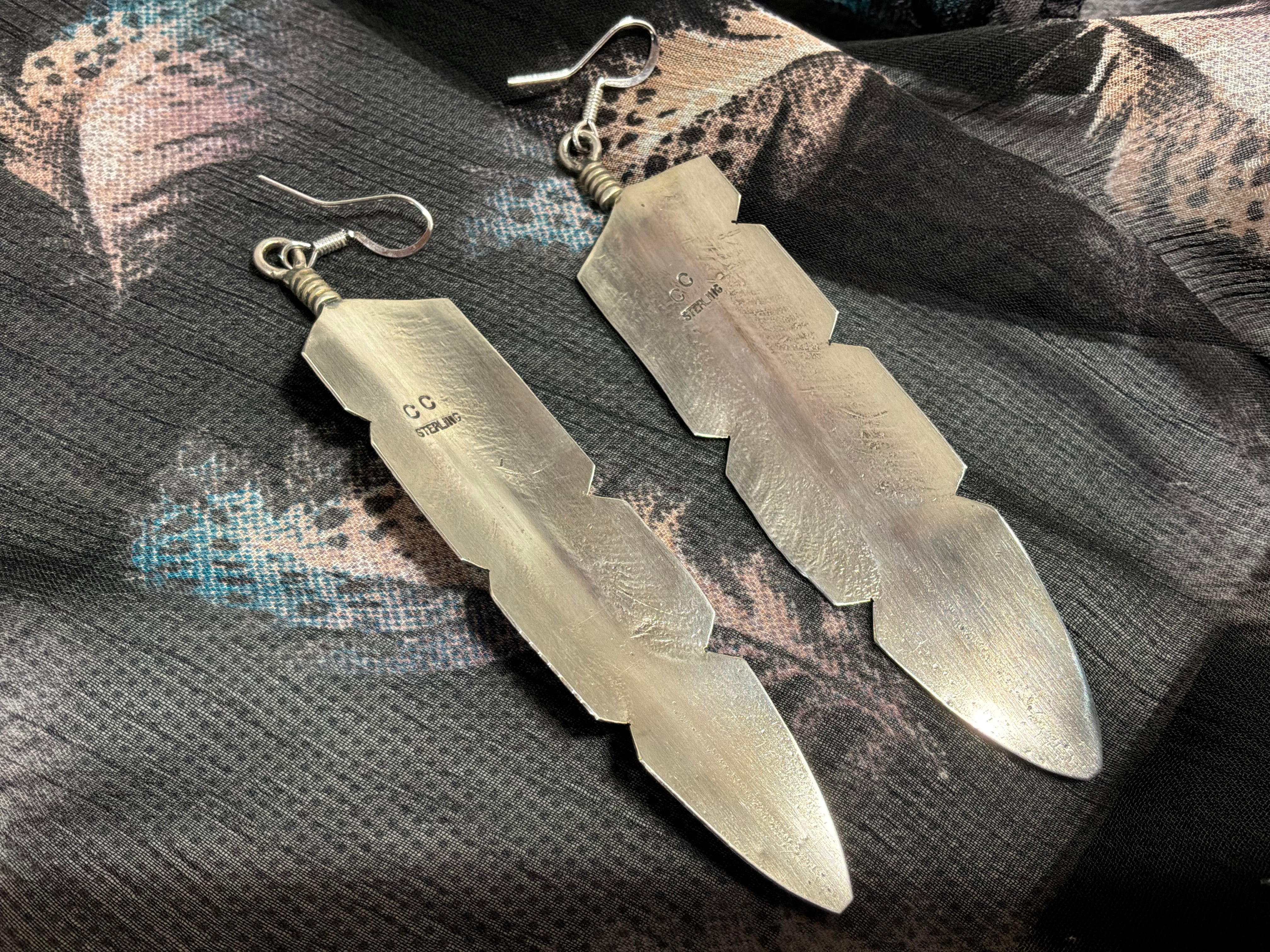 Sterling silver matte finish dangle feather earrings. Measuring 4 inches from top of wire to bottom of feather, and an inch across at the widest. Artist initials "CC" stamped on back along with sterling.