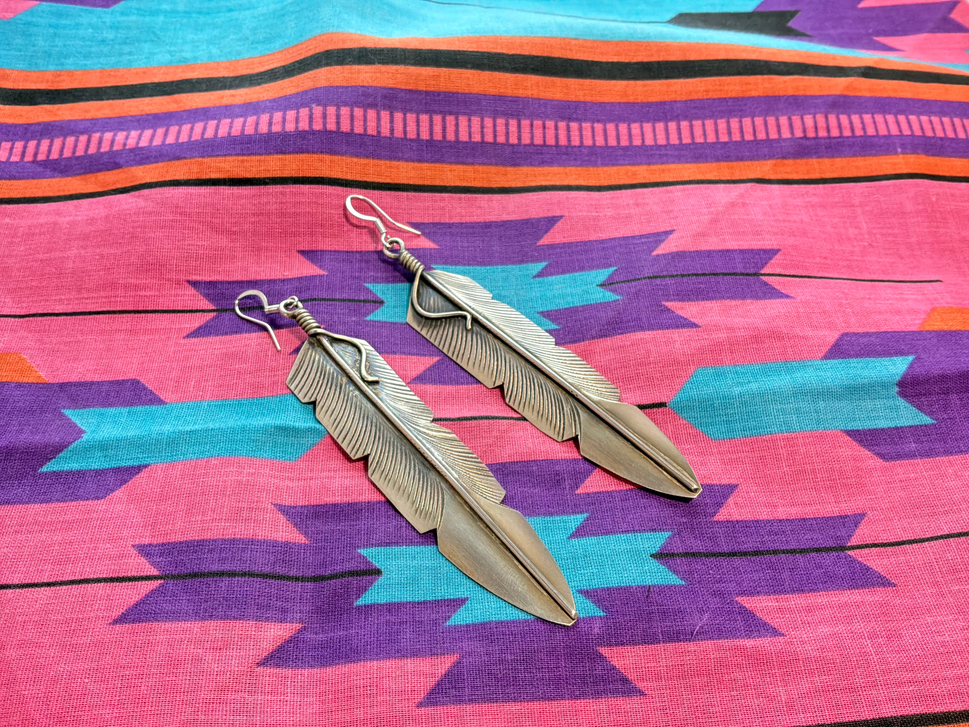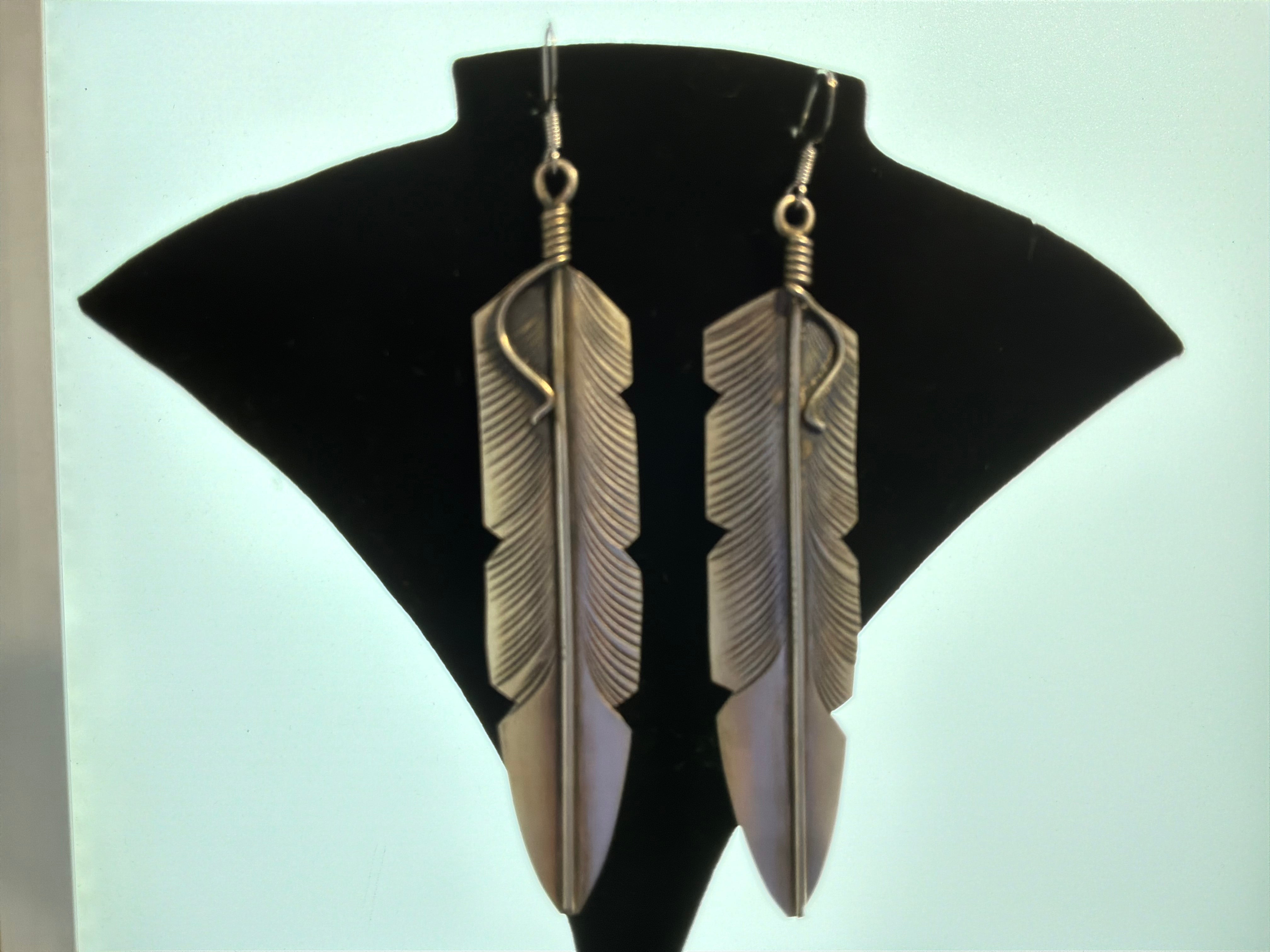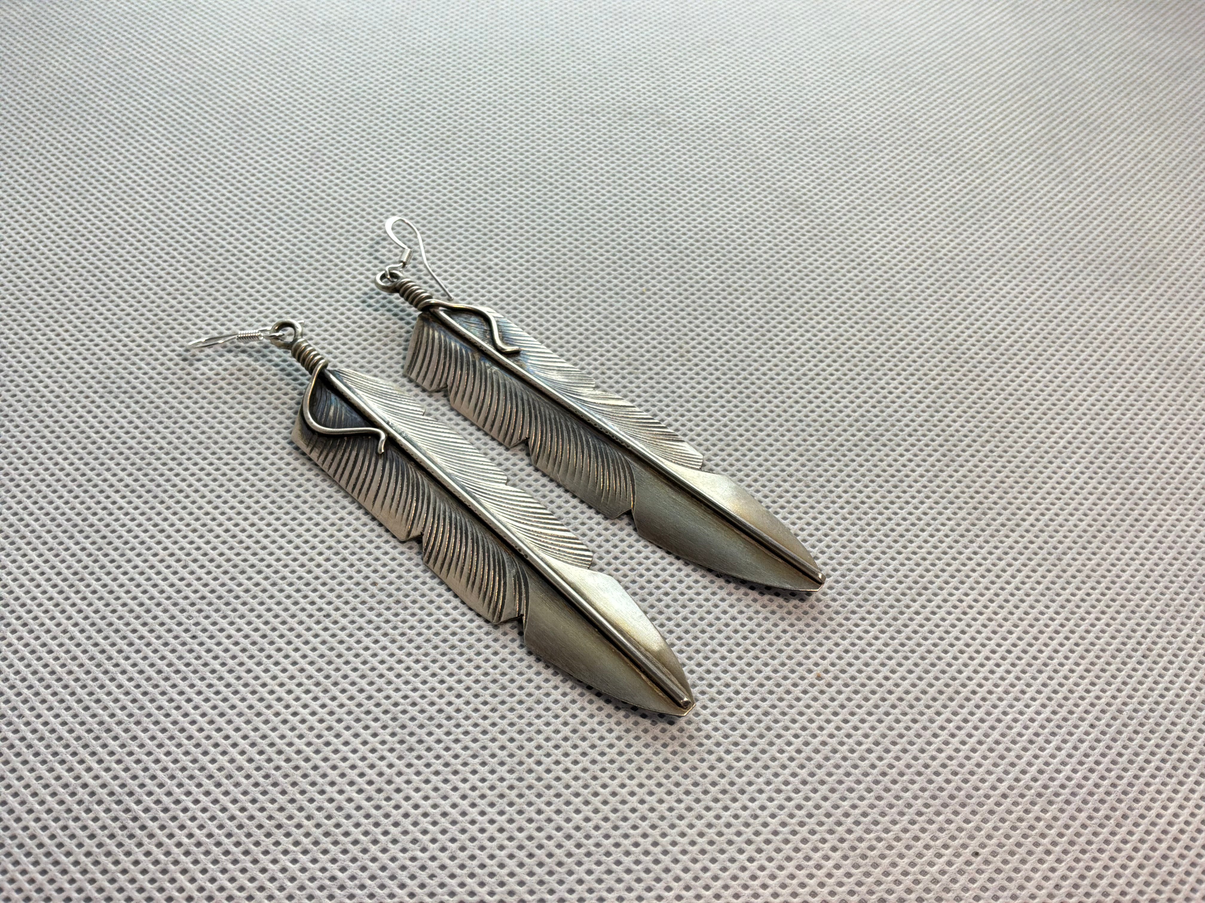 Sterling silver matte finish dangle feather earrings. Measuring 4 inches from top of wire to bottom of feather, and an inch across at the widest. Artist initials "CC" stamped on back along with sterling.