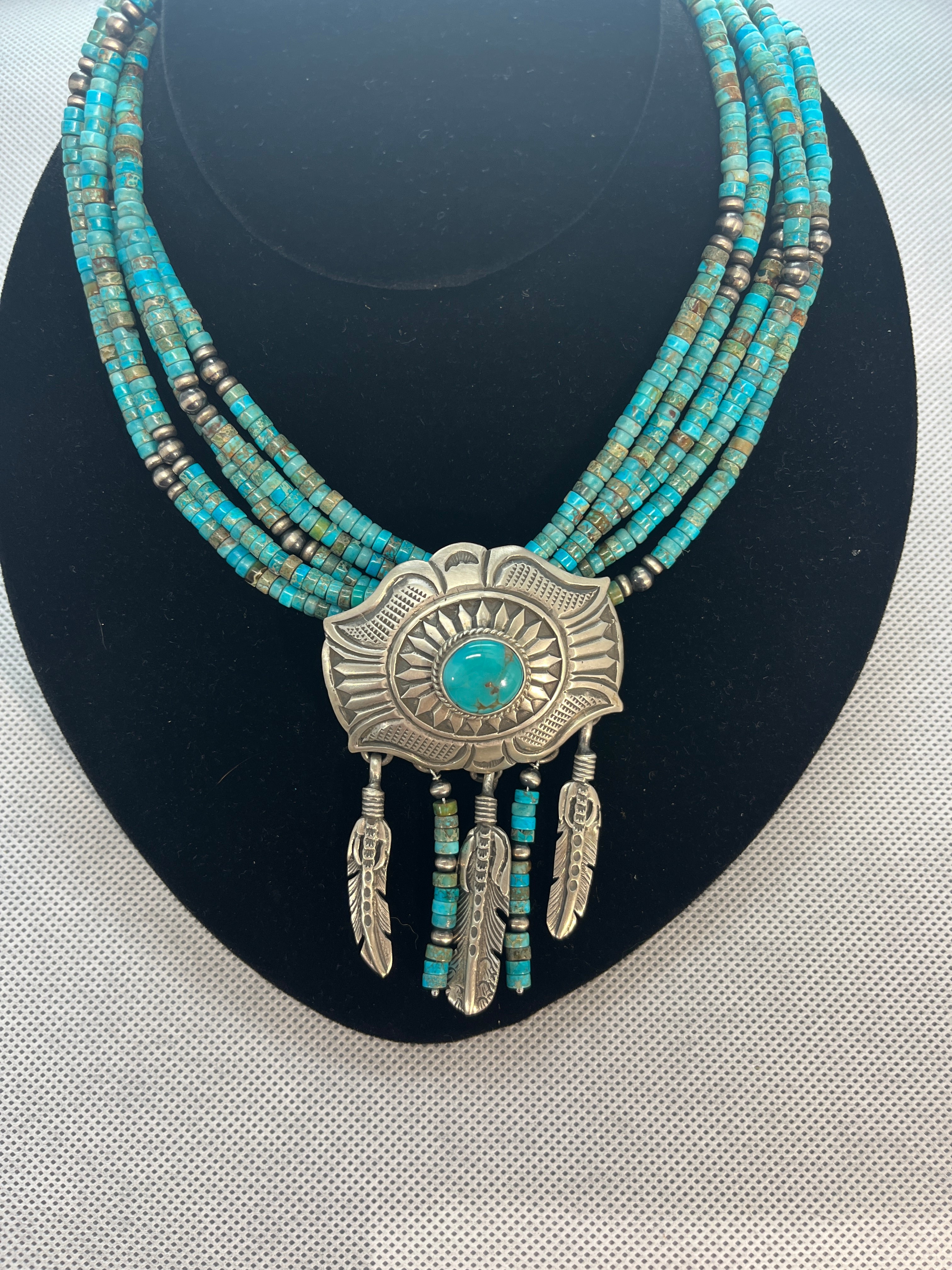 Sterling silver, brushed finish, with 5 strands heishi turquoise beads 20" long necklace with detachable pendant. Silver pendant with turquoise cabochon and 6 dangles, with shepherds hook on back. Removable pendant is 2 1/4" across and 3 1/2" to bottom of dangles. Stamped sterling with artist insignia.