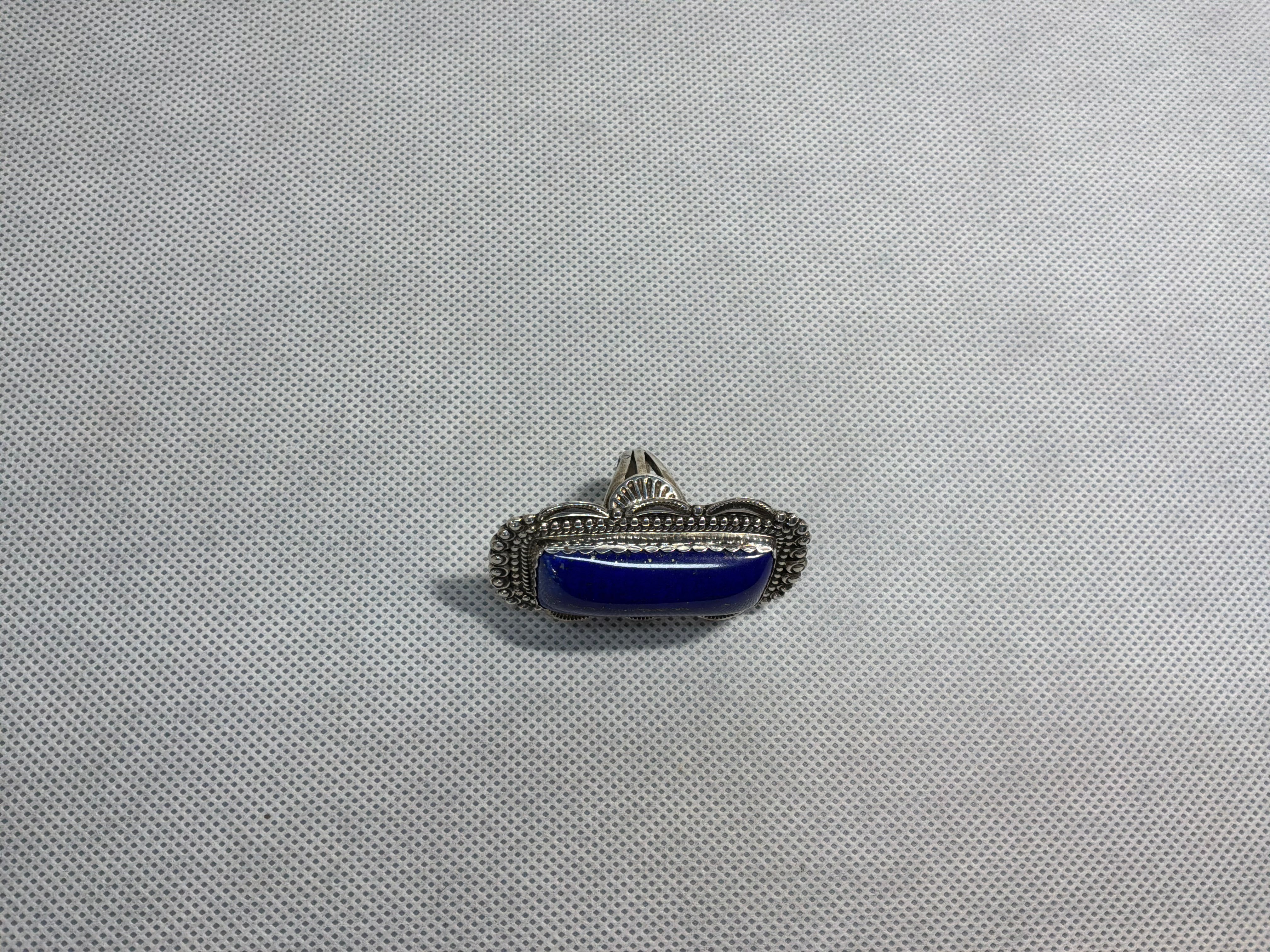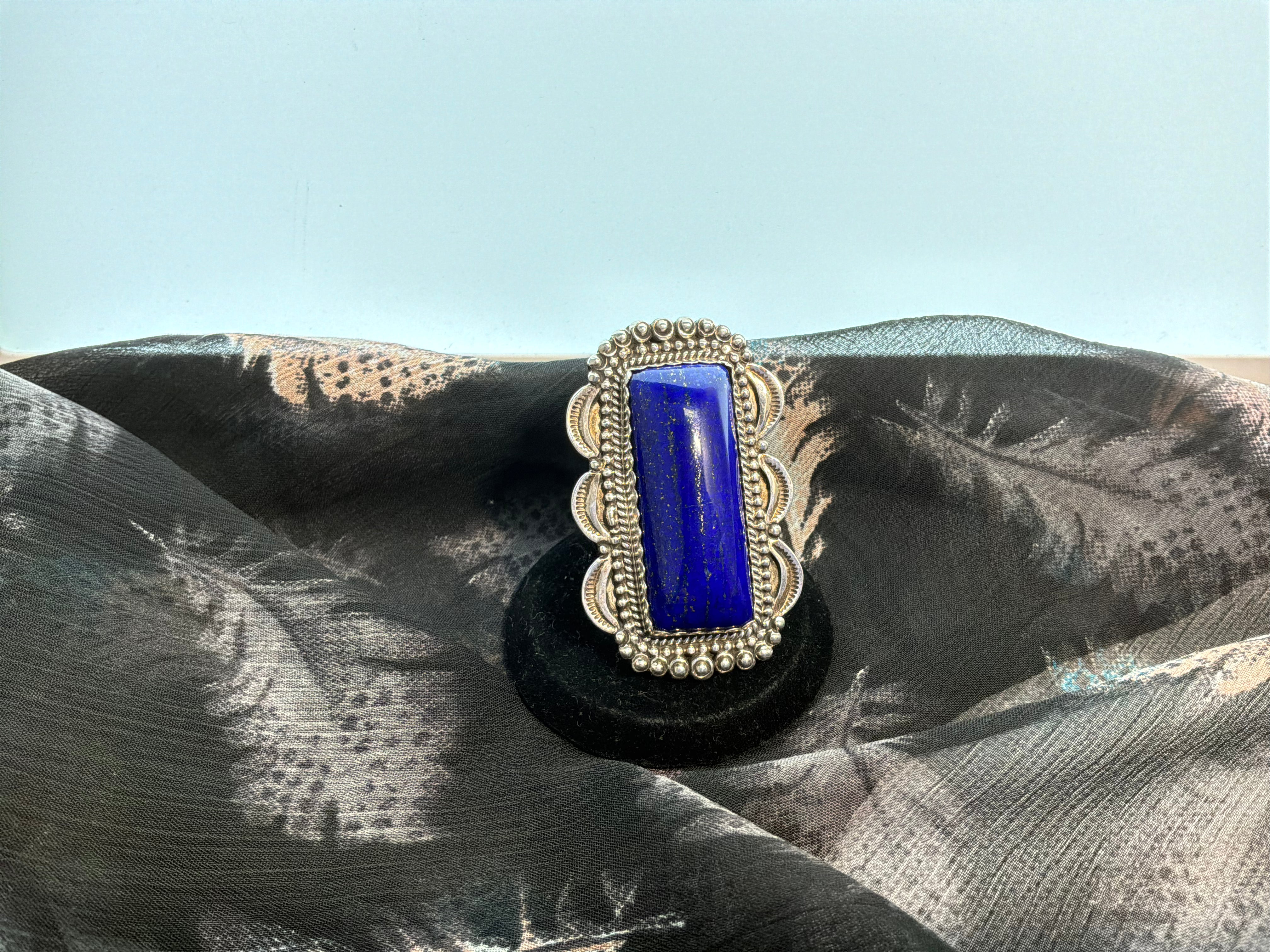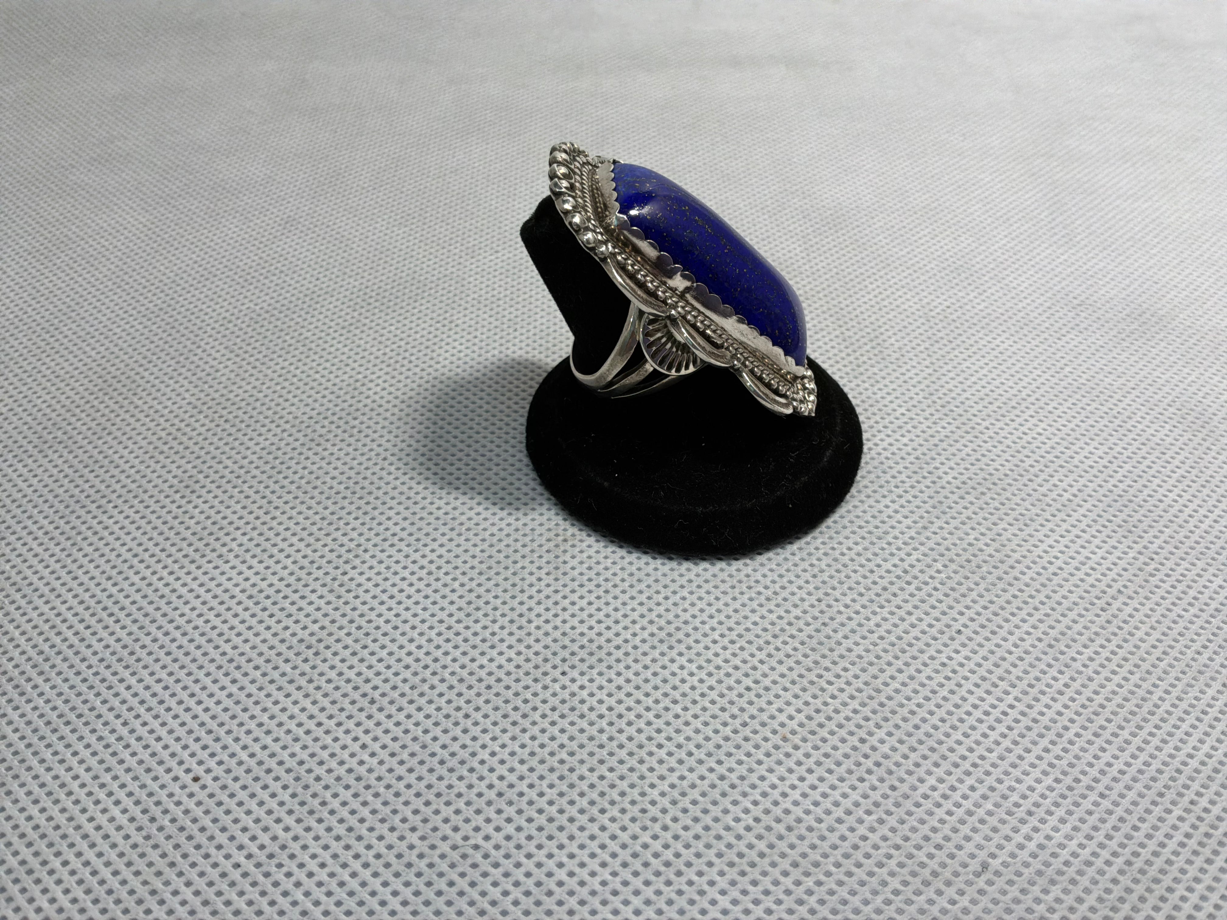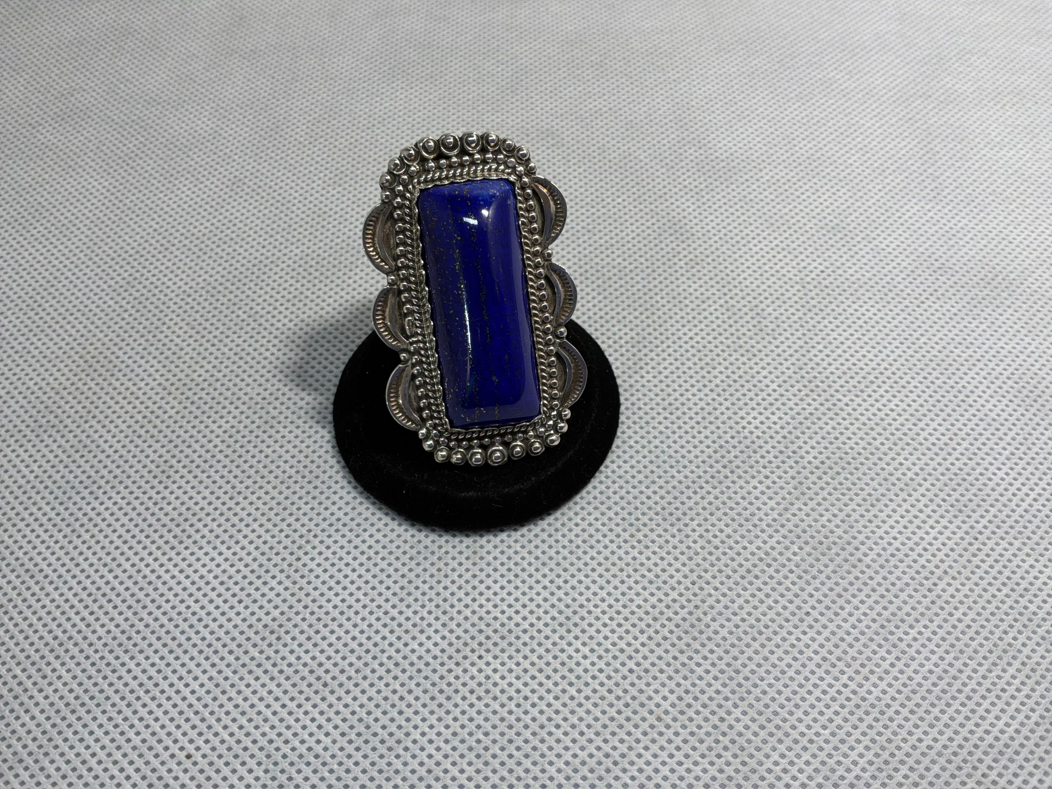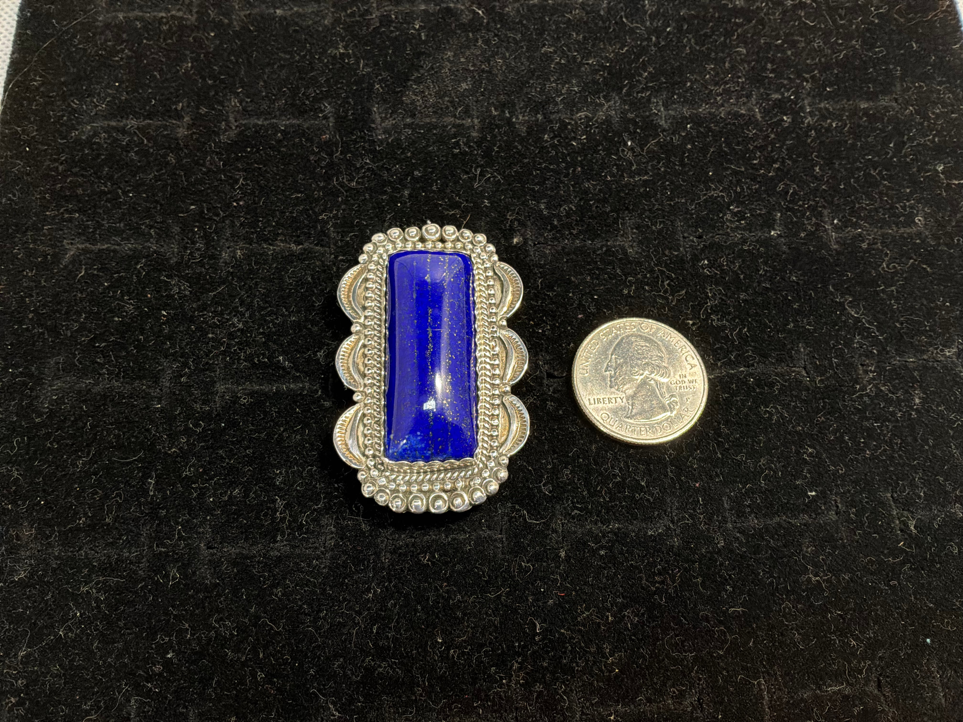 Sterling silver Lapis ring, size 9. Rectangle ring with measurements of 2" long and 1 1/2" across. Split shank 1/4" wide. Artist initials and sterling stamped on back.