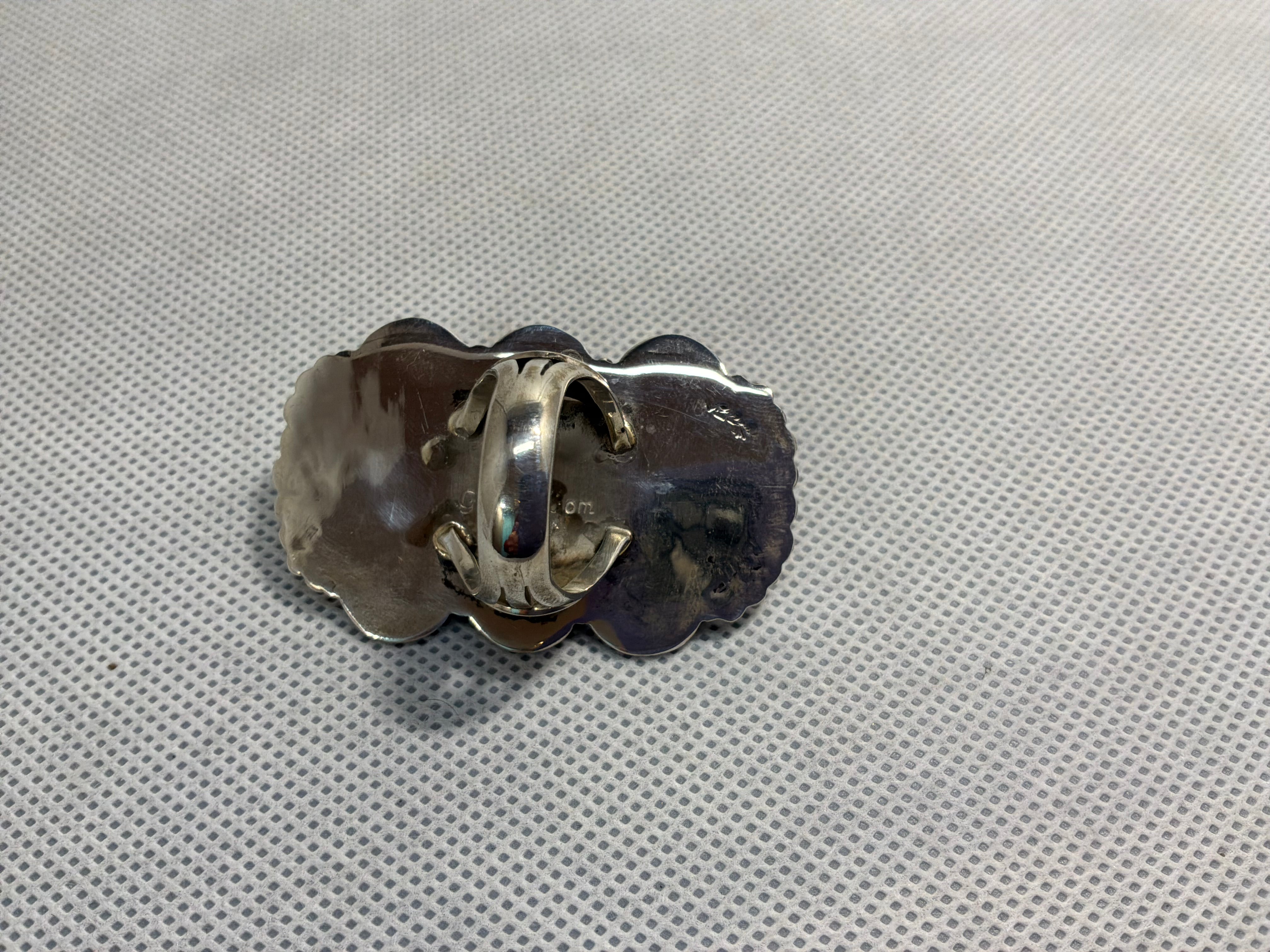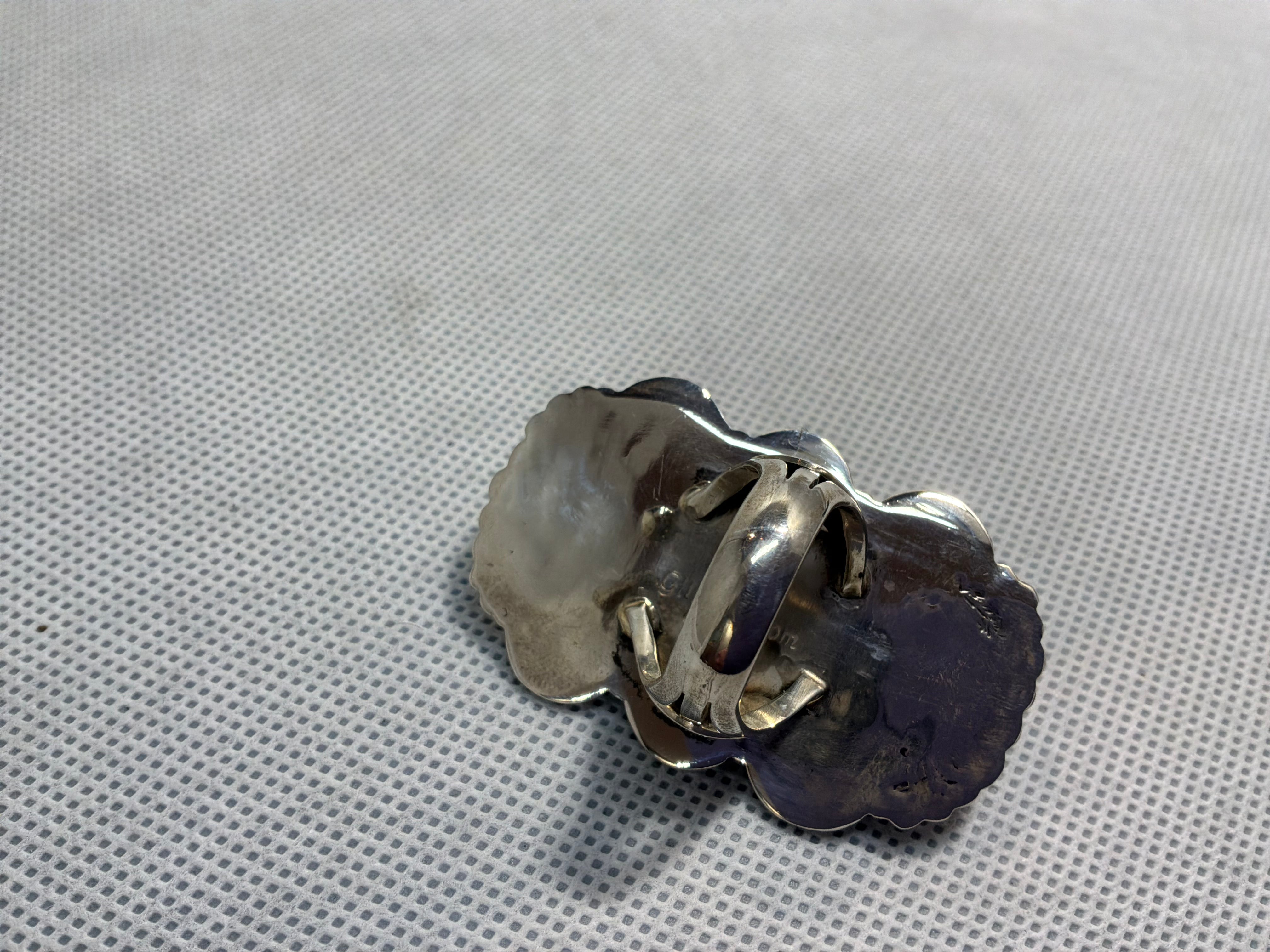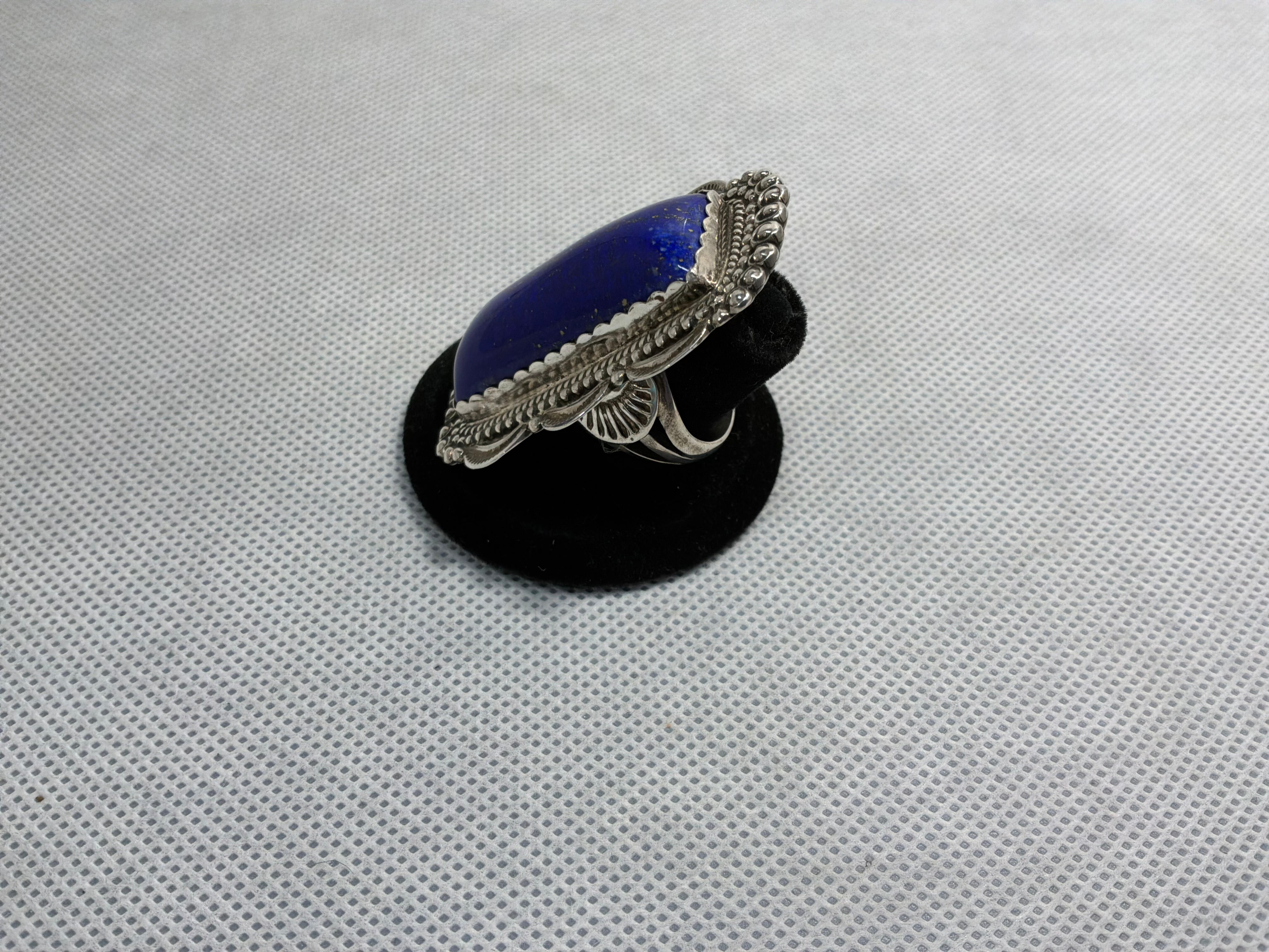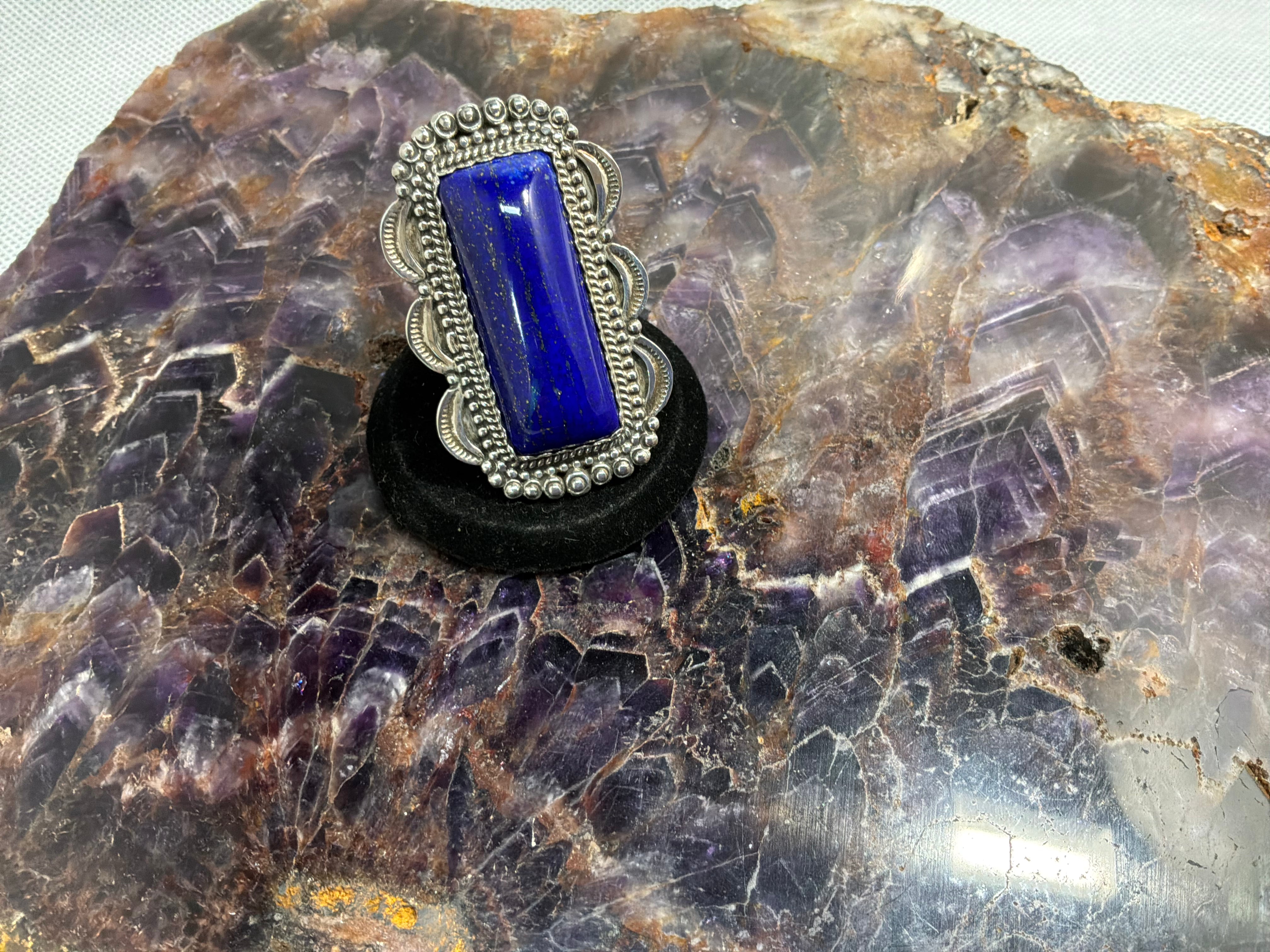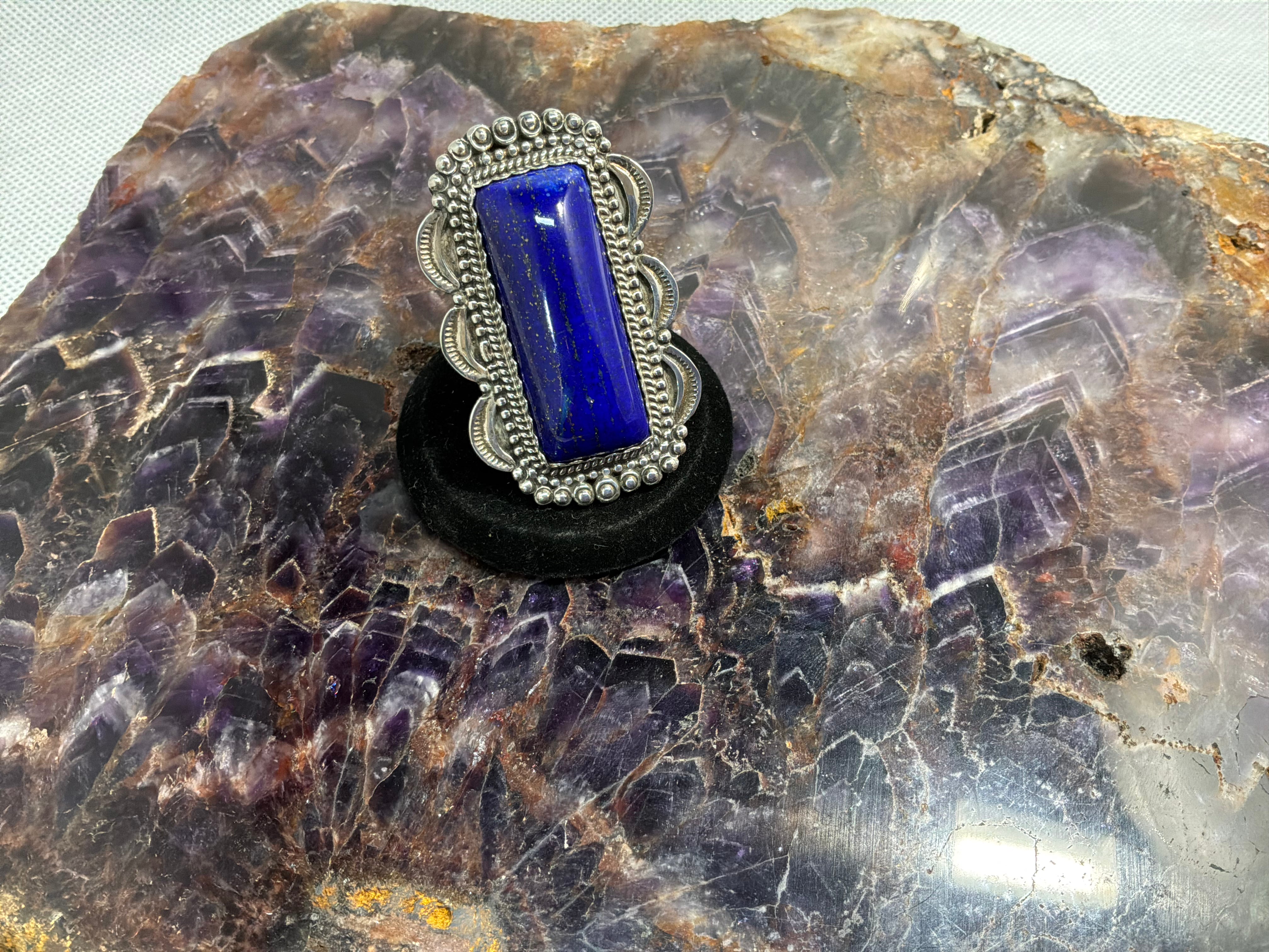 Sterling silver Lapis ring, size 9. Rectangle ring with measurements of 2" long and 1 1/2" across. Split shank 1/4" wide. Artist initials and sterling stamped on back.