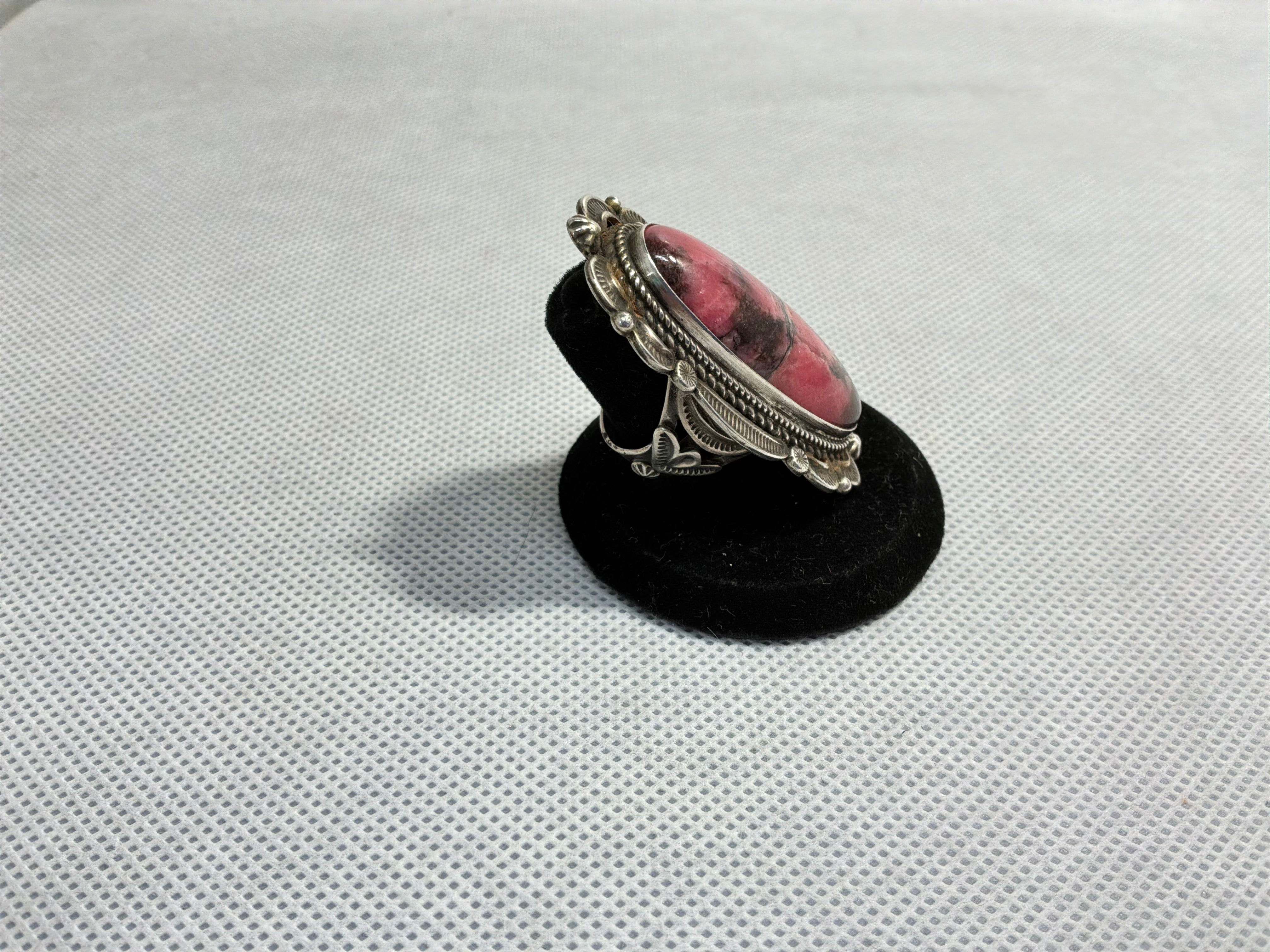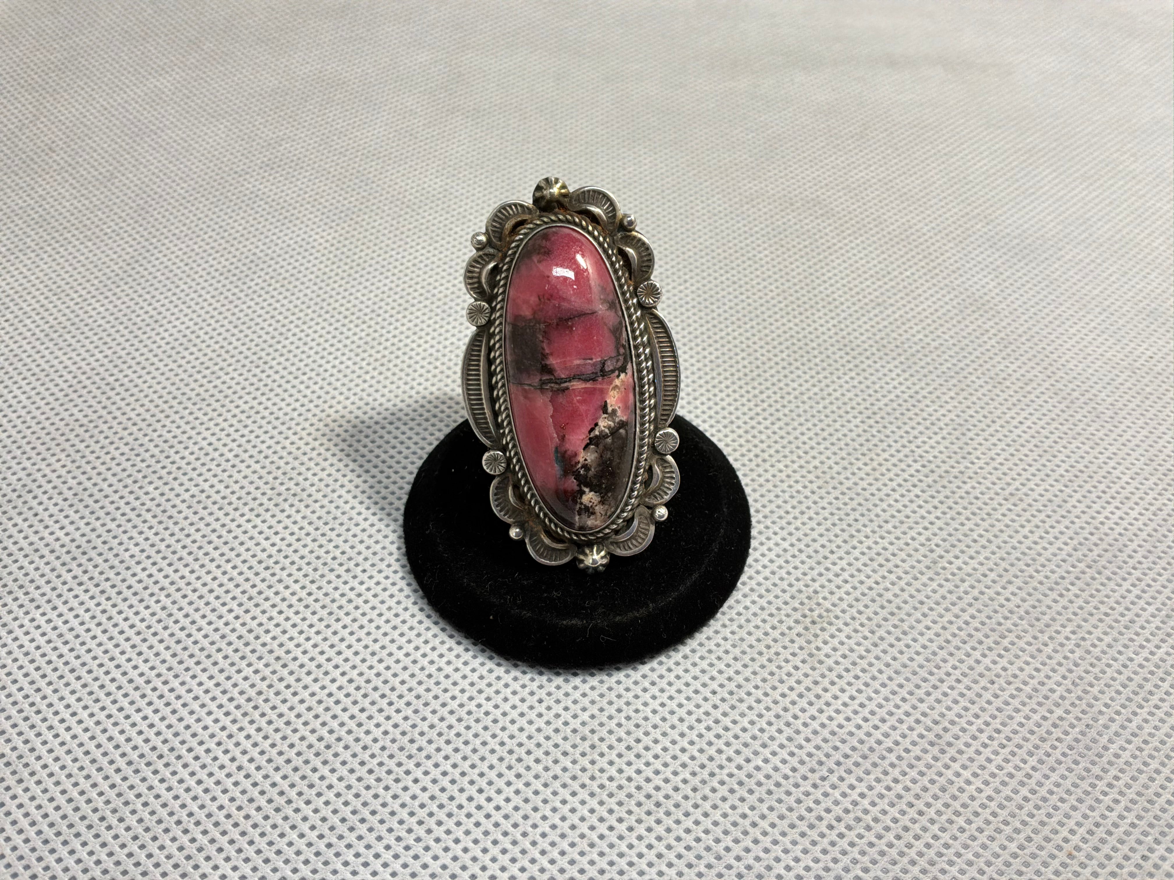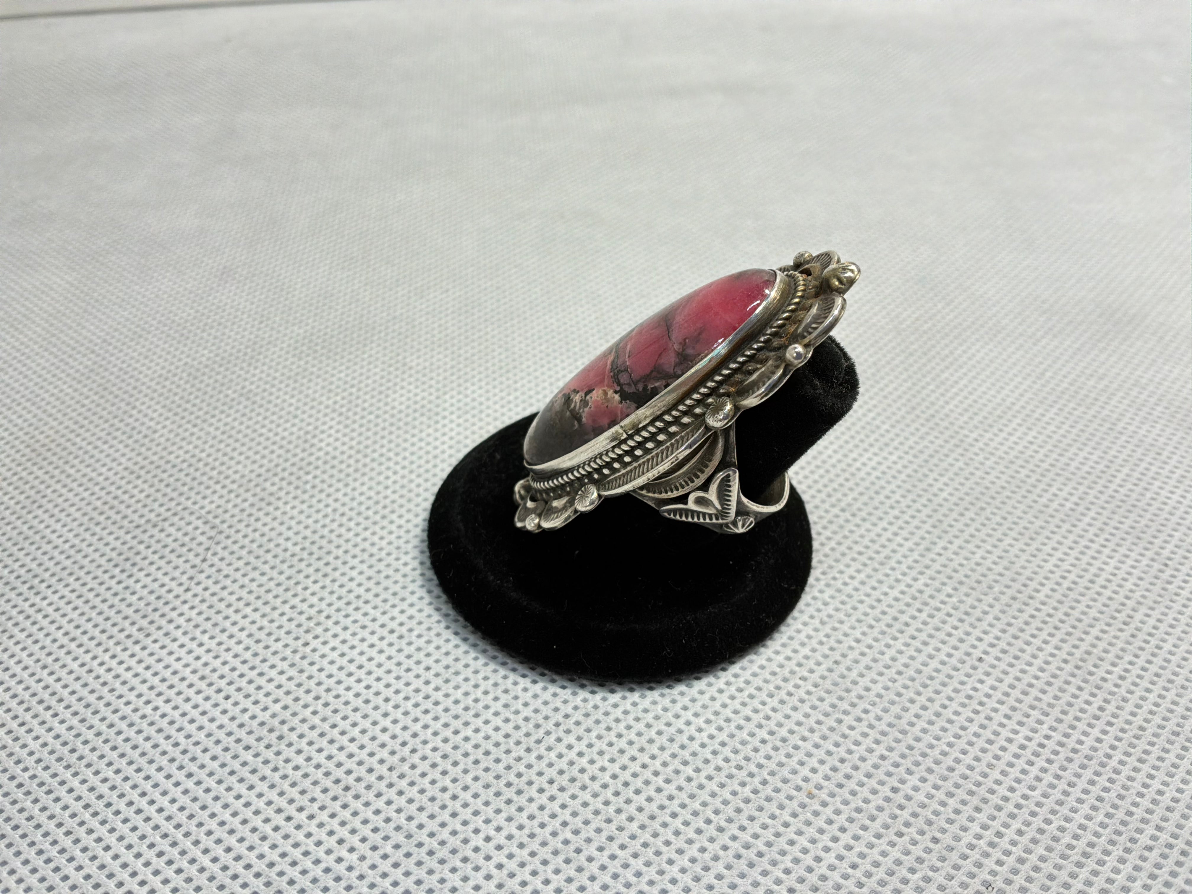 Sterling silver with matte finish, Rhodonite ring size 8. E M Linkin artist name on back along with sterling stamp. Ring measures 2 inches top to bottom and one inch across.