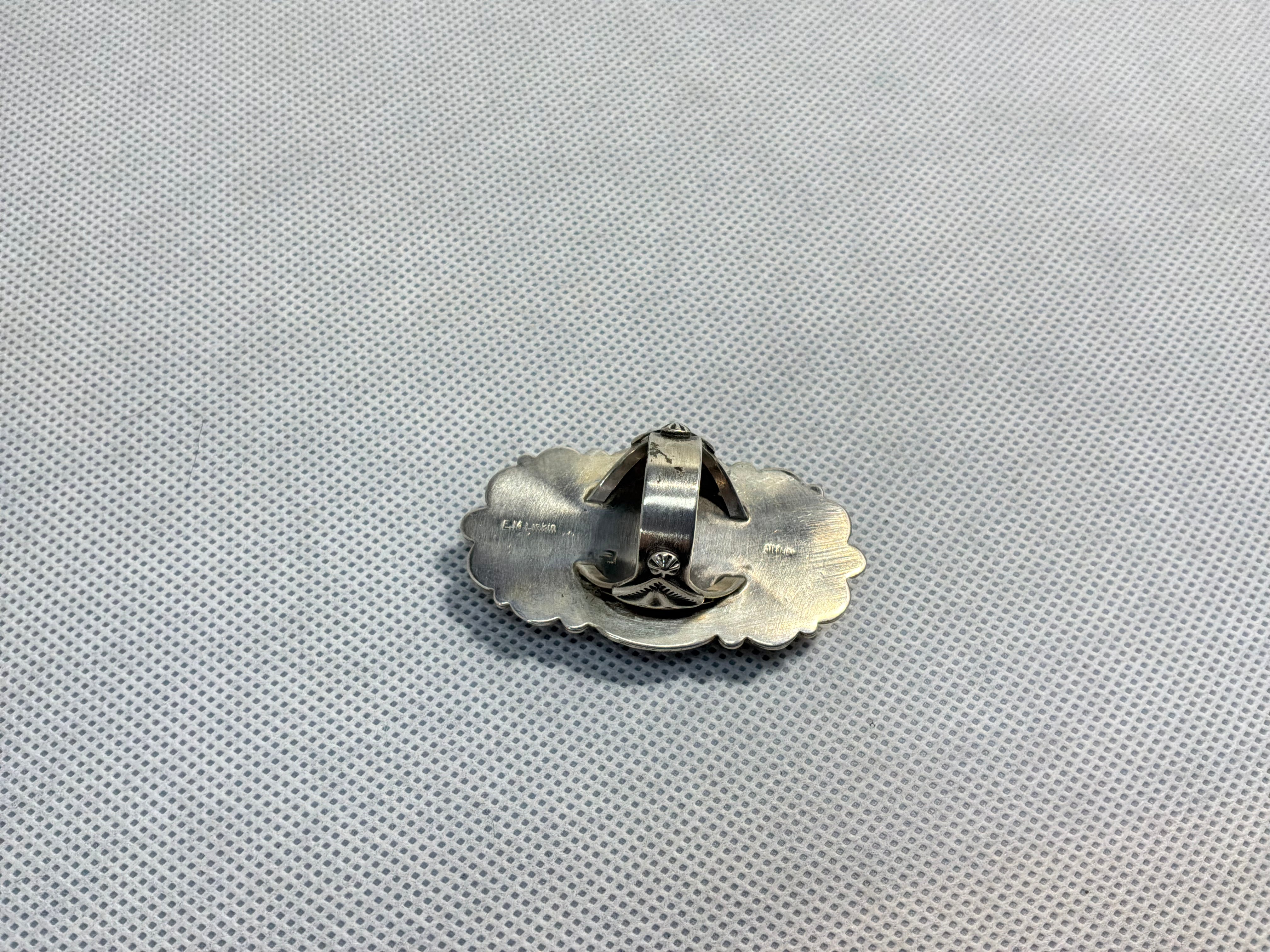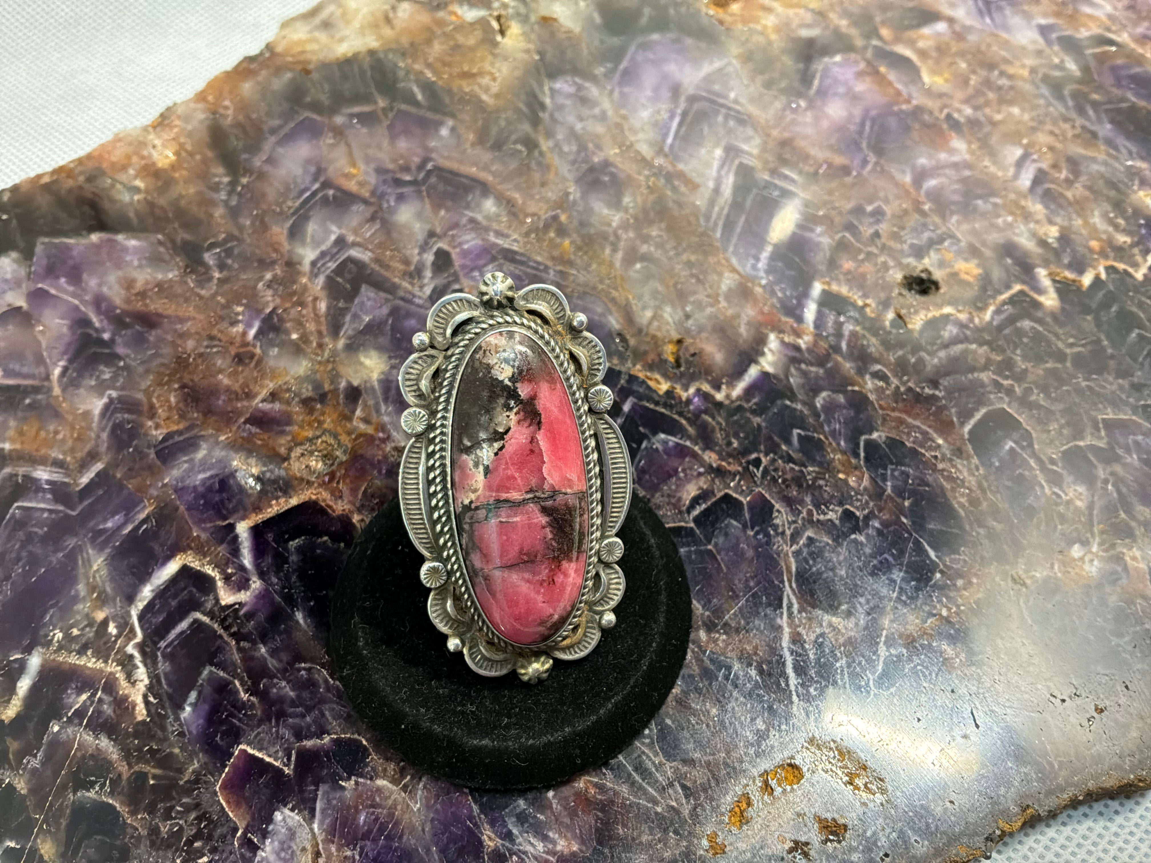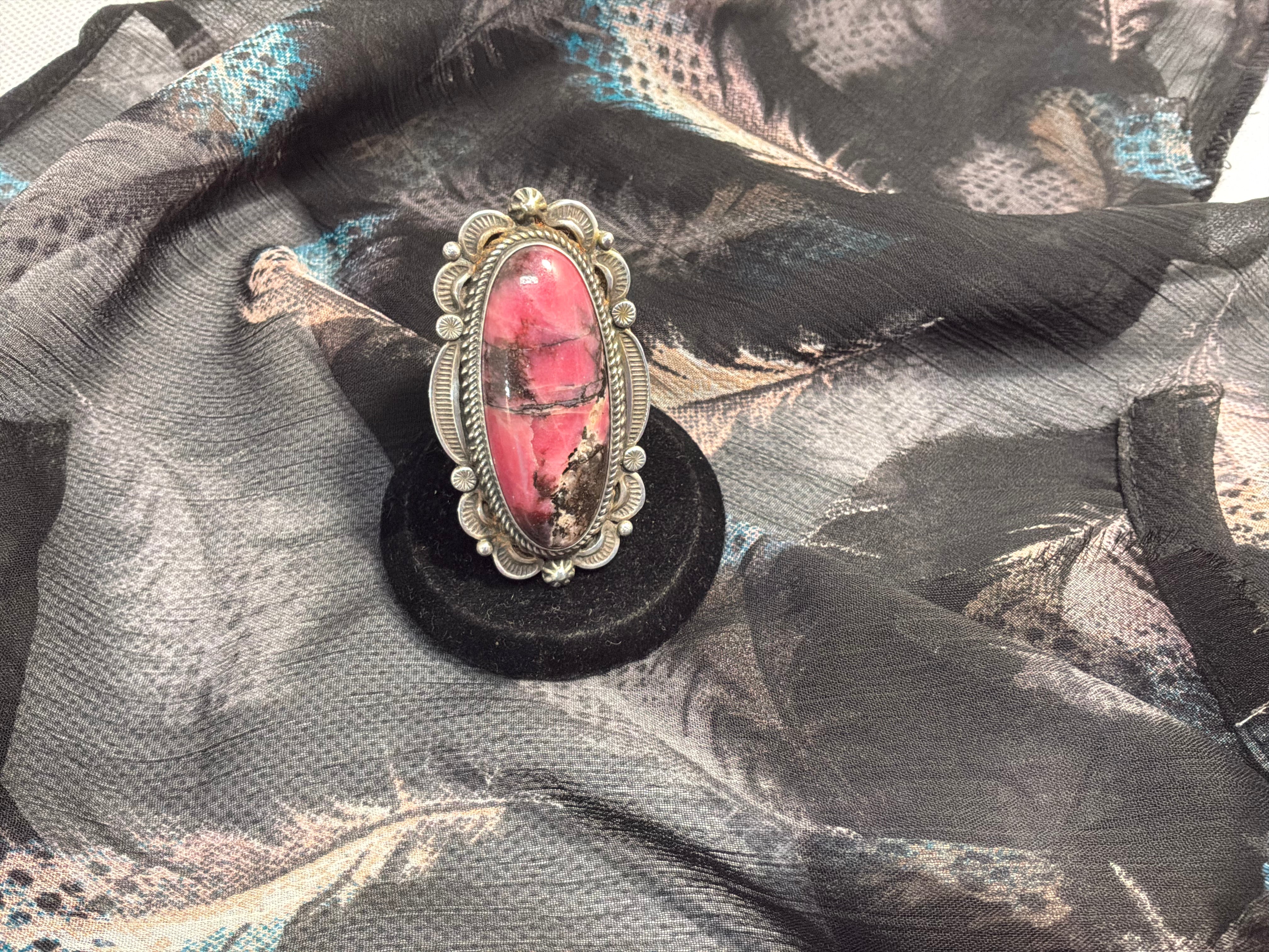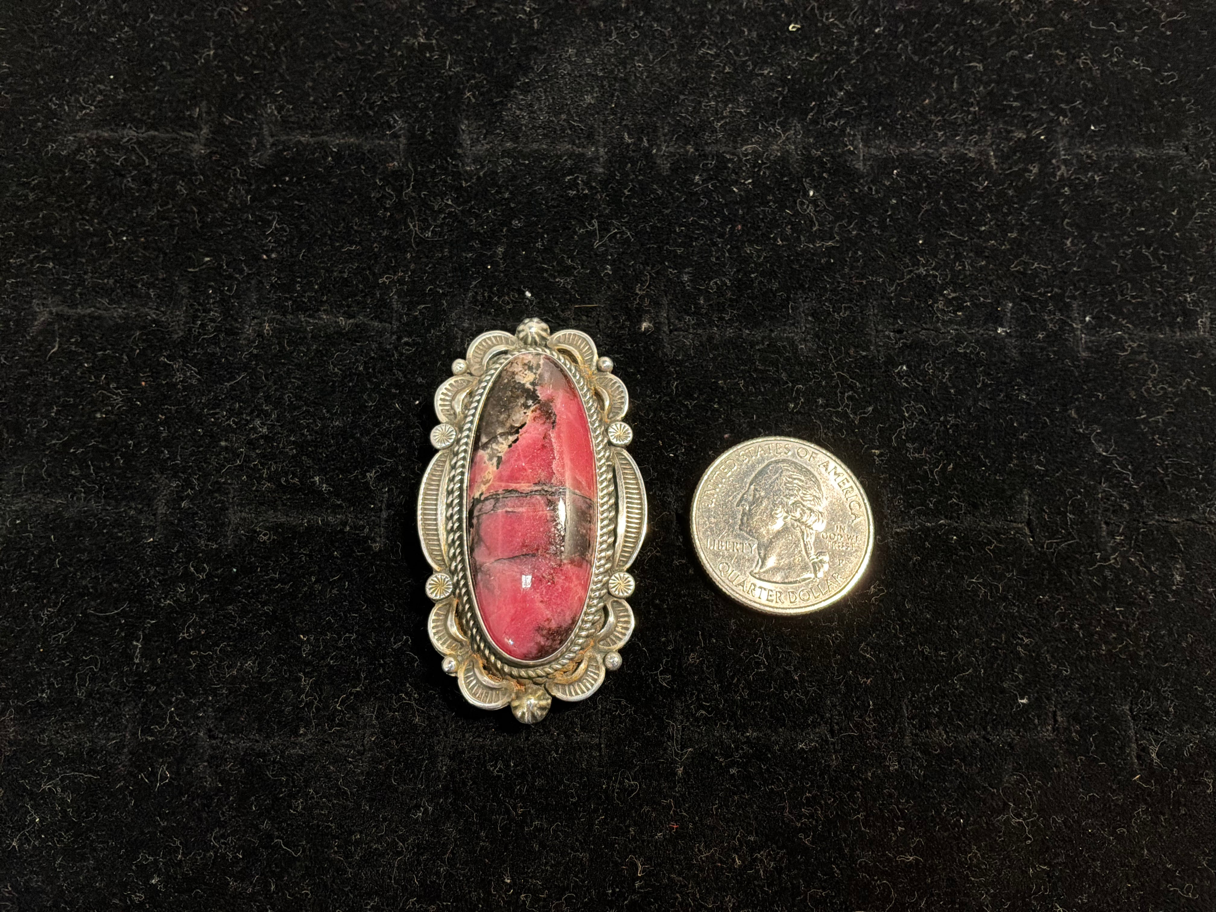 Sterling silver with matte finish, Rhodonite ring size 8. E M Linkin artist name on back along with sterling stamp. Ring measures 2 inches top to bottom and one inch across.