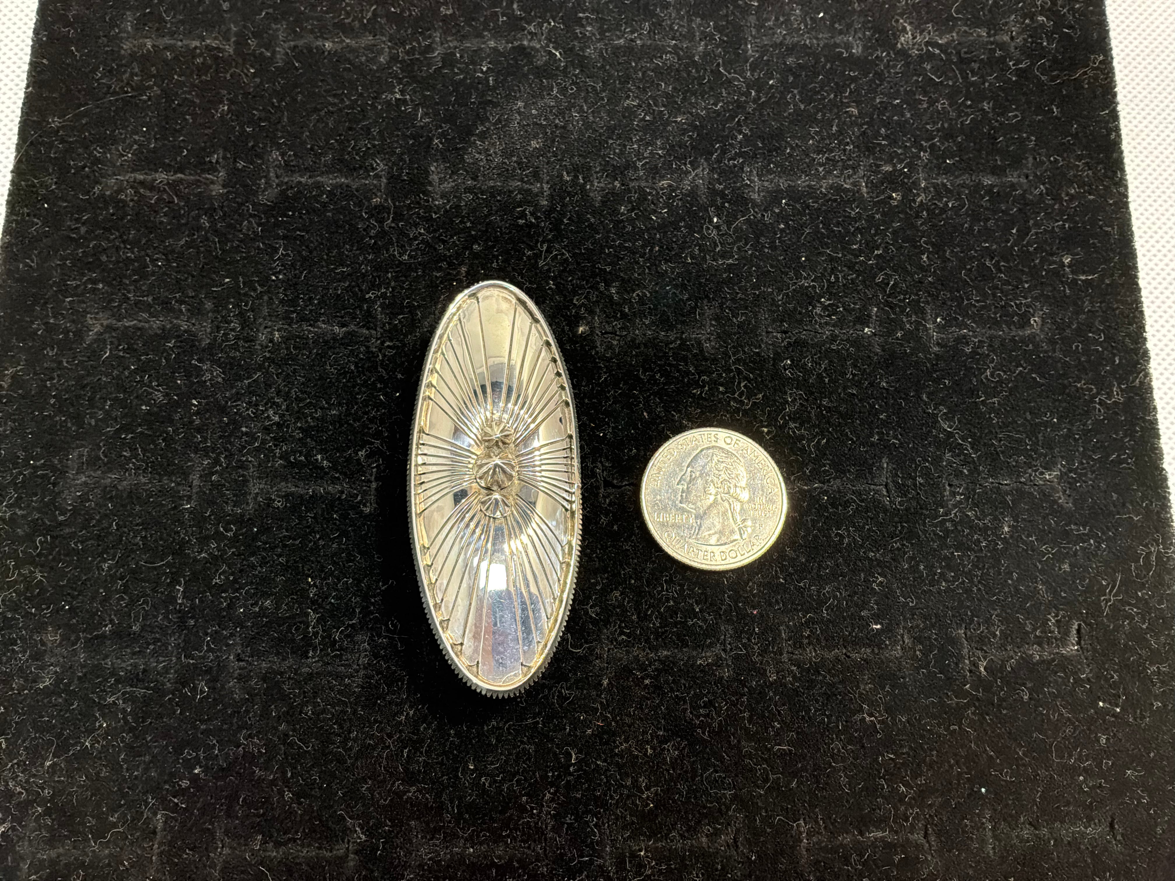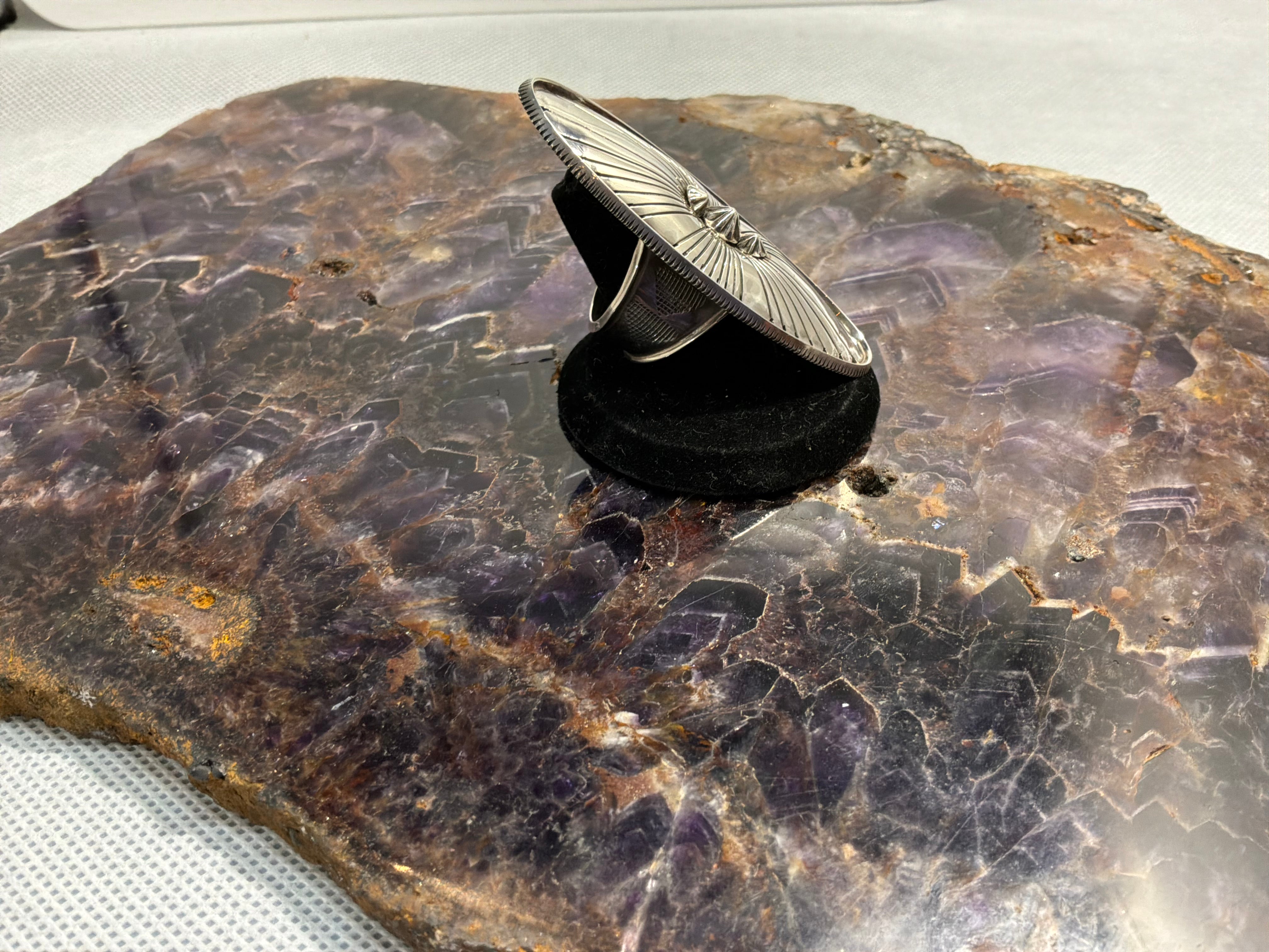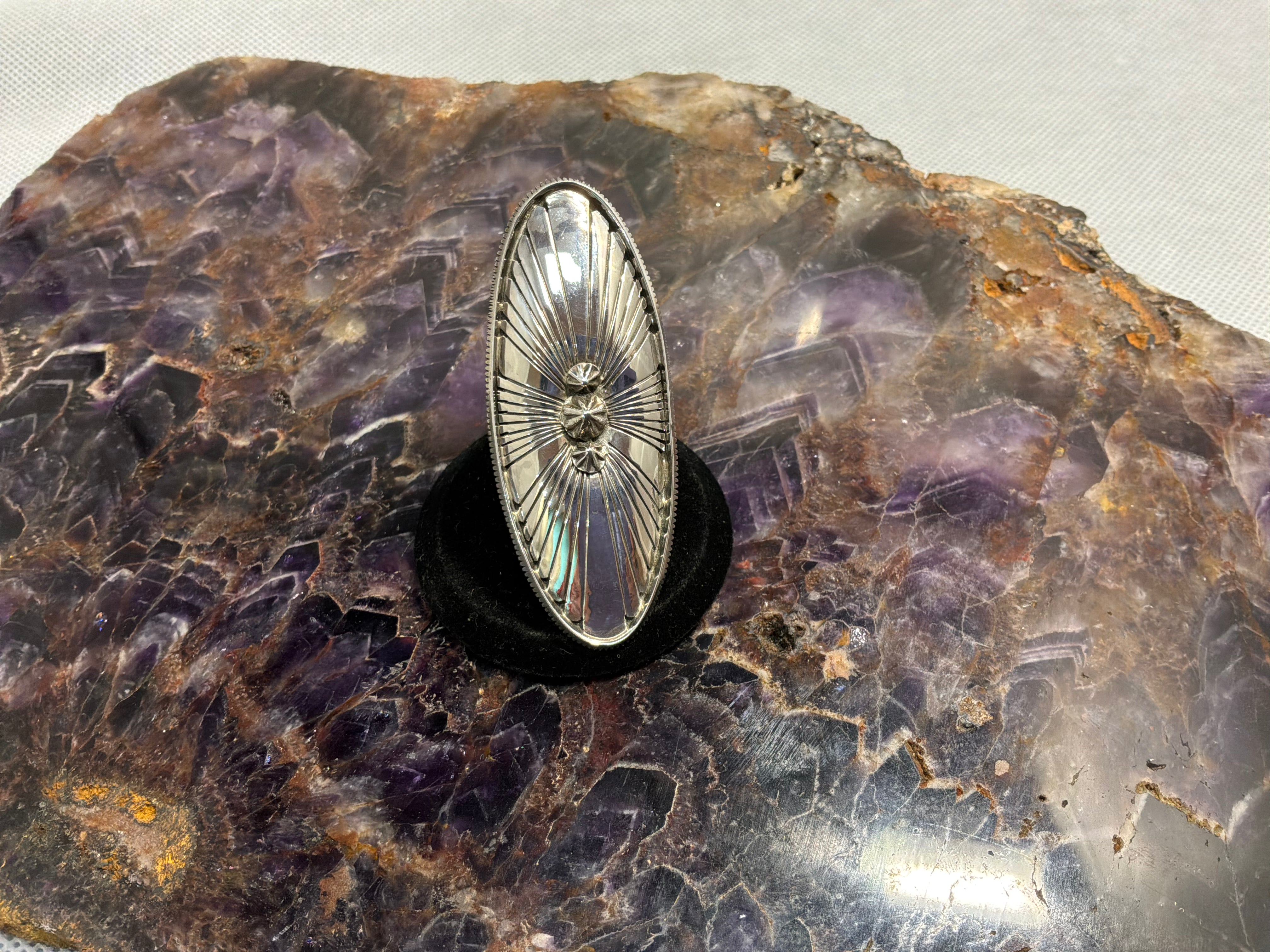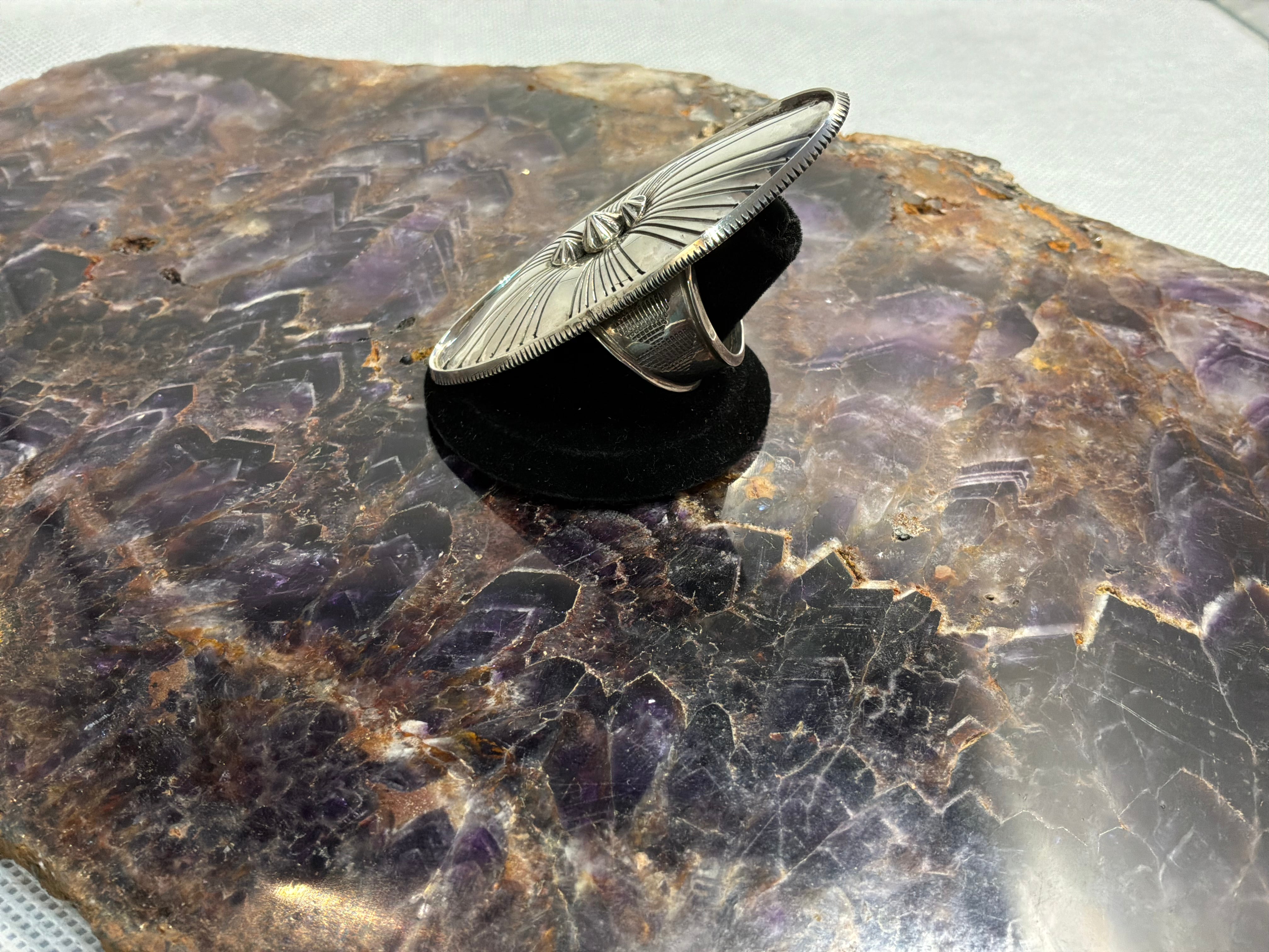 Sterling silver ring handmade 2 1/2" long oval concho style ring, just over an inch wide. Ring shank is hand made starting at 1/2" wide tapering to over 1/4" and stamped as well. Artist initials and sterling stamped on back. Ring is size 10, Matching bracelet available separately.