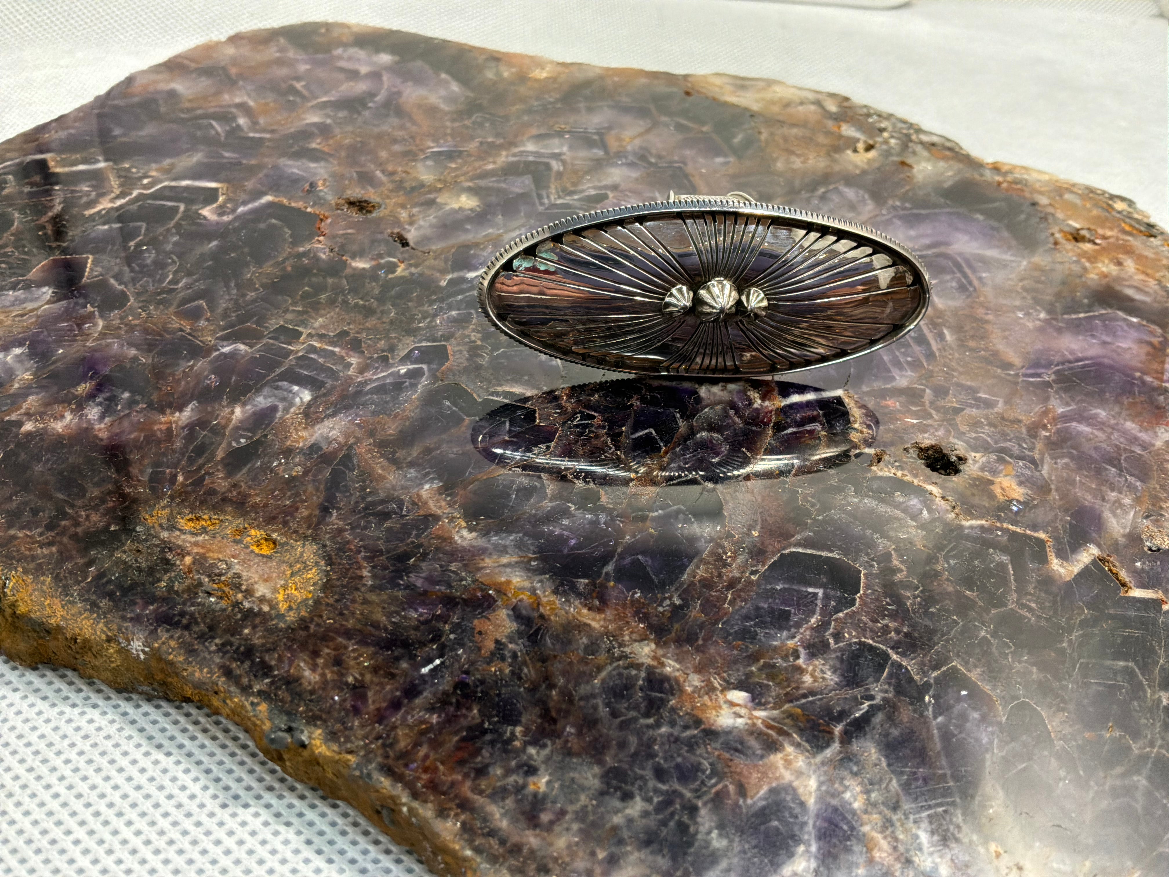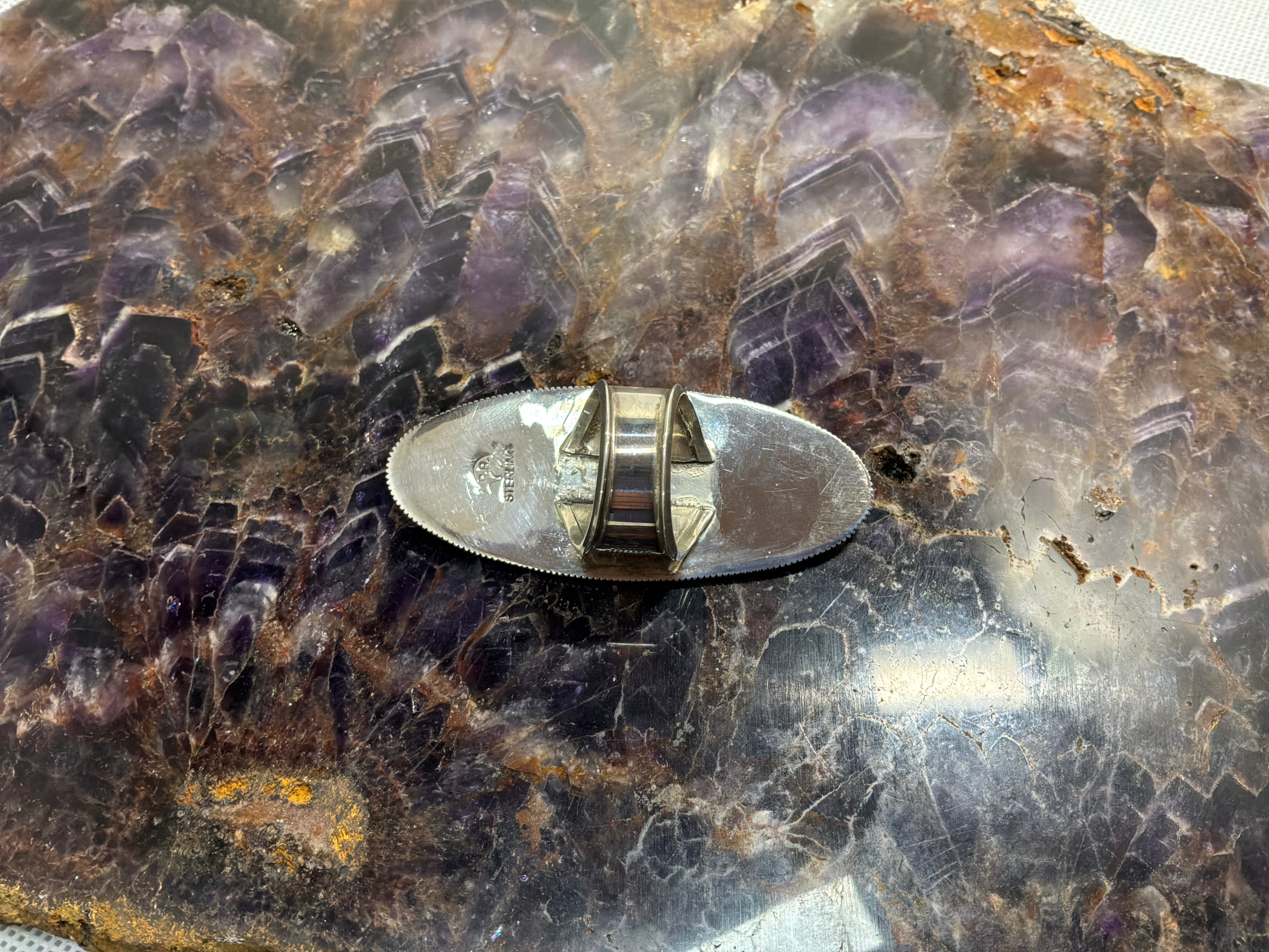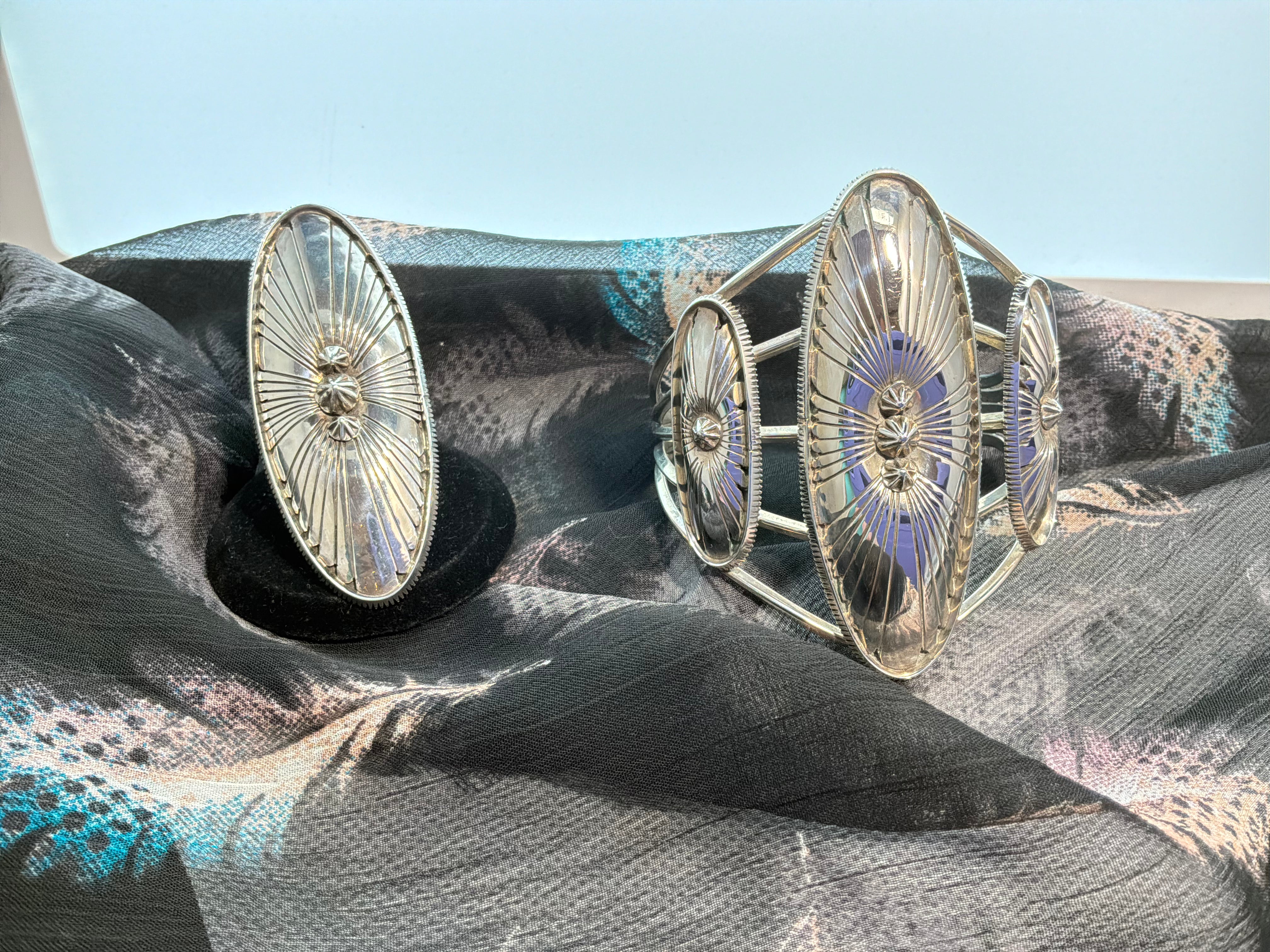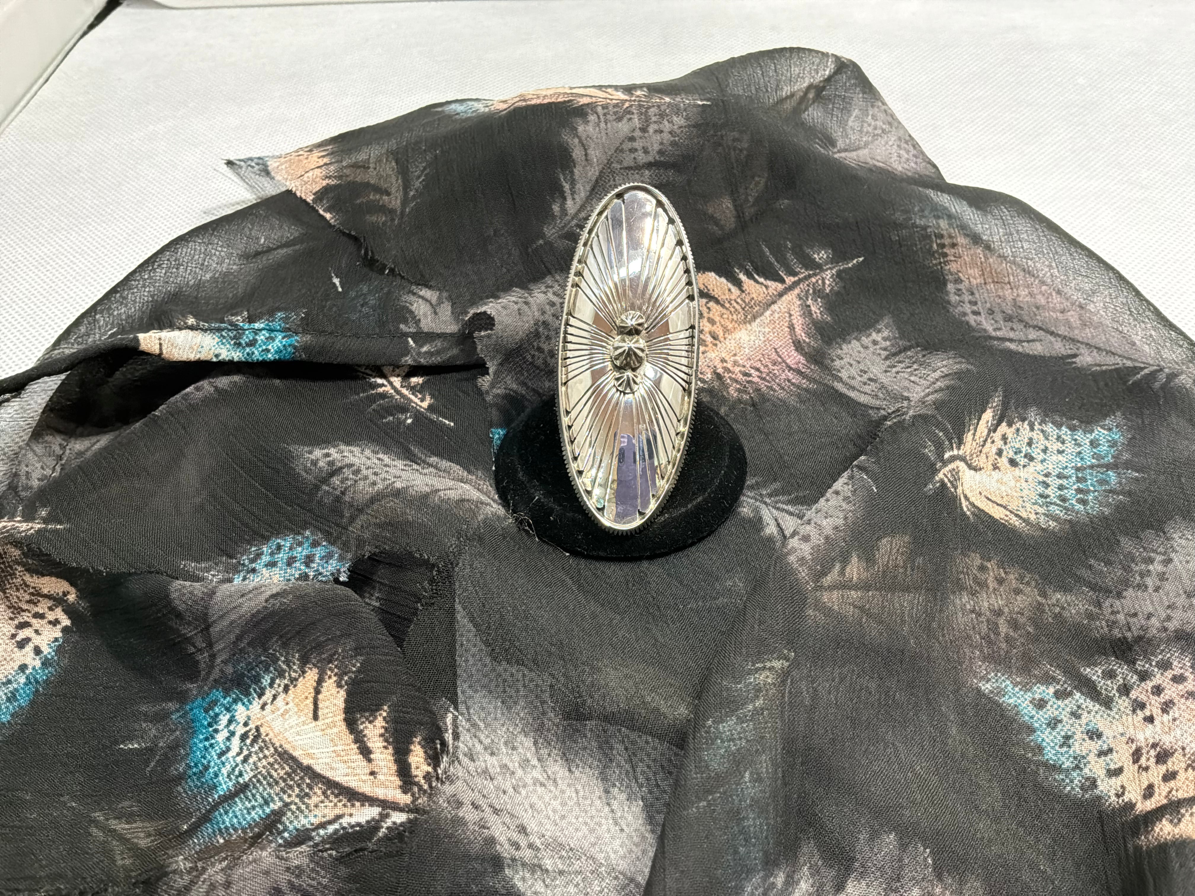 Sterling silver ring handmade 2 1/2" long oval concho style ring, just over an inch wide. Ring shank is hand made starting at 1/2" wide tapering to over 1/4" and stamped as well. Artist initials and sterling stamped on back. Ring is size 10, Matching bracelet available separately.