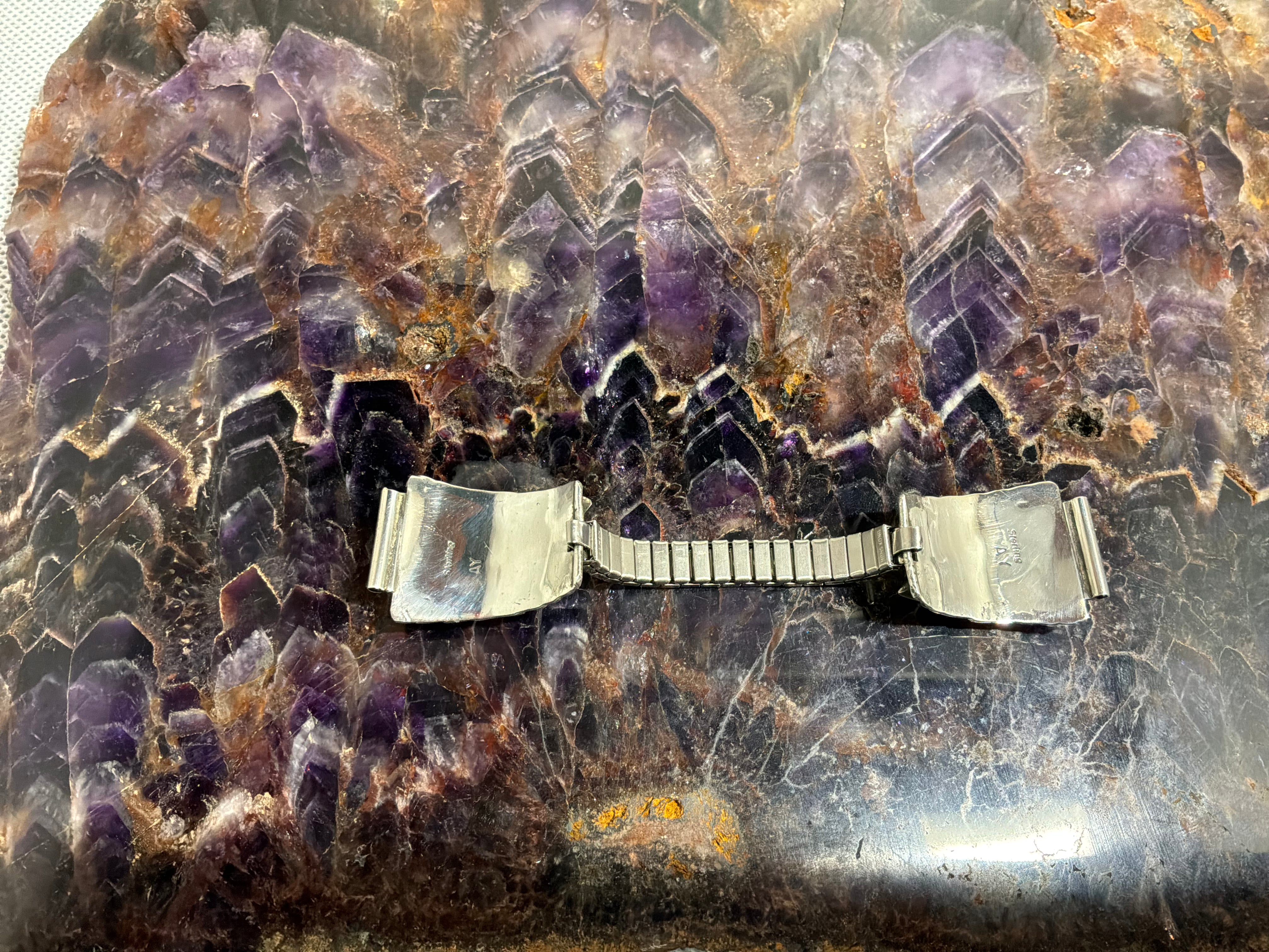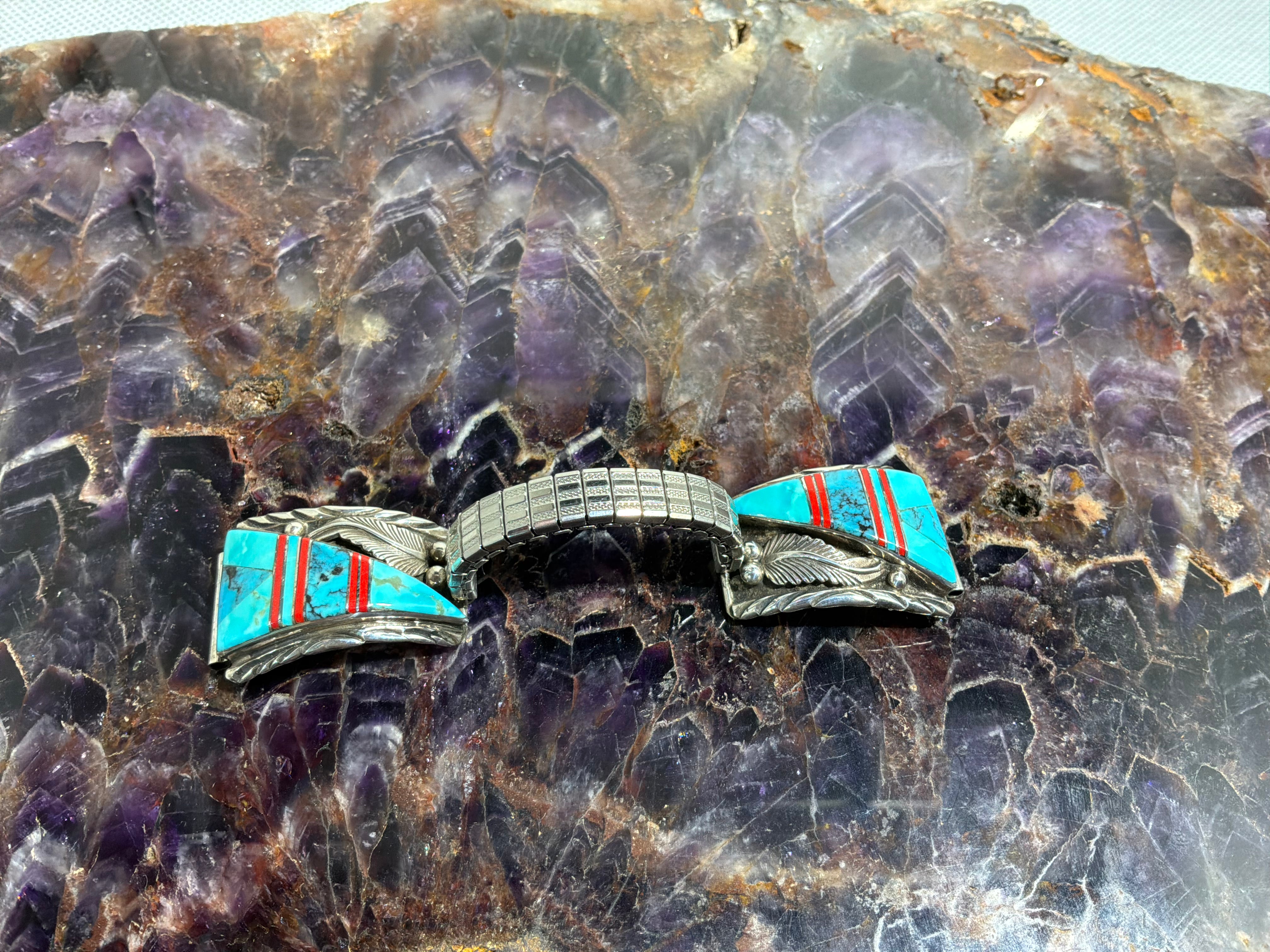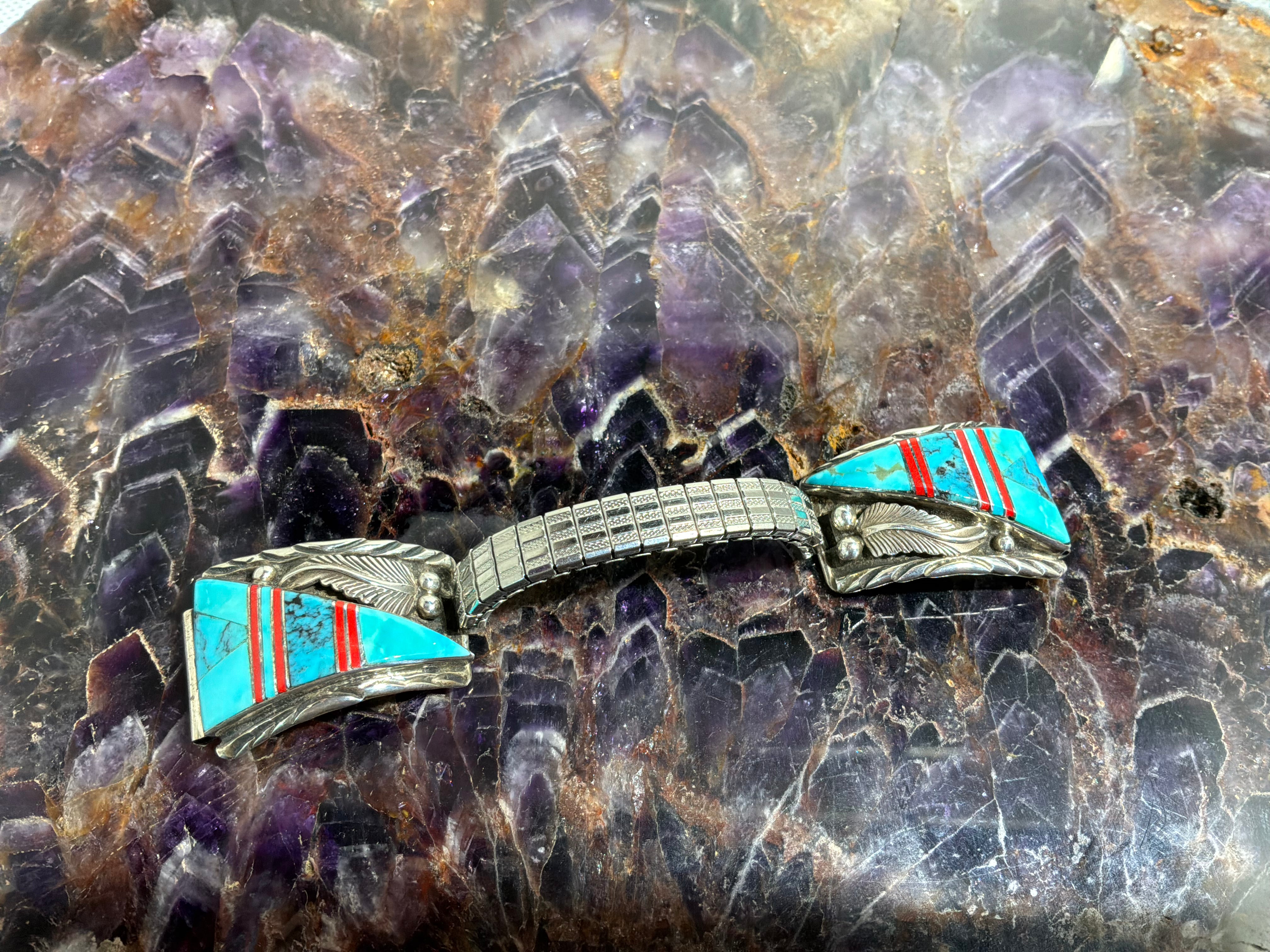 Sterling silver watch tips with Turquoise and Coral inlay with a decorative feather on the tips . Watch Tips measure 1 1/2" long and almost one inch across. Sterling and "AT" stamped on back. Stretch band can be adjusted by adding or removing links.
